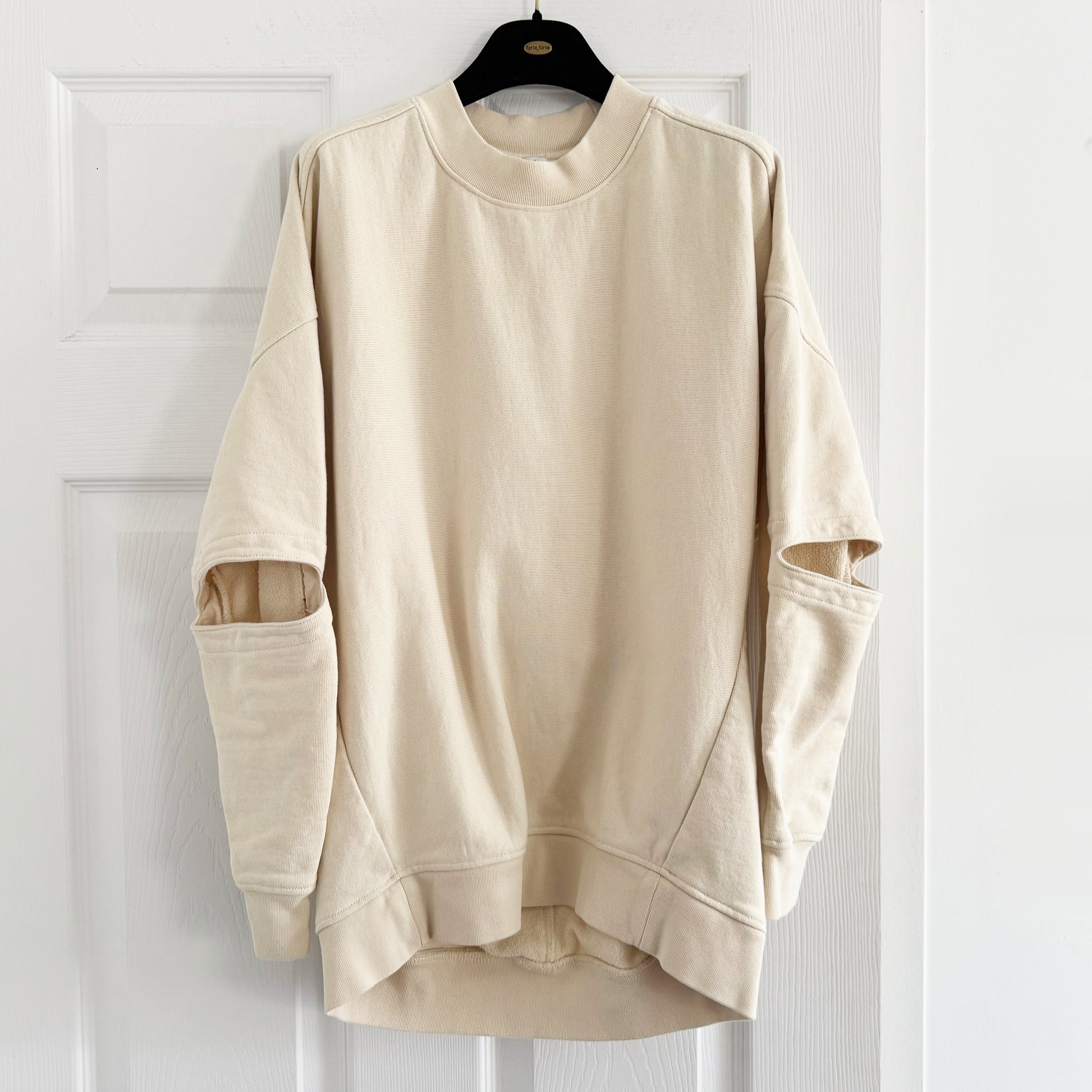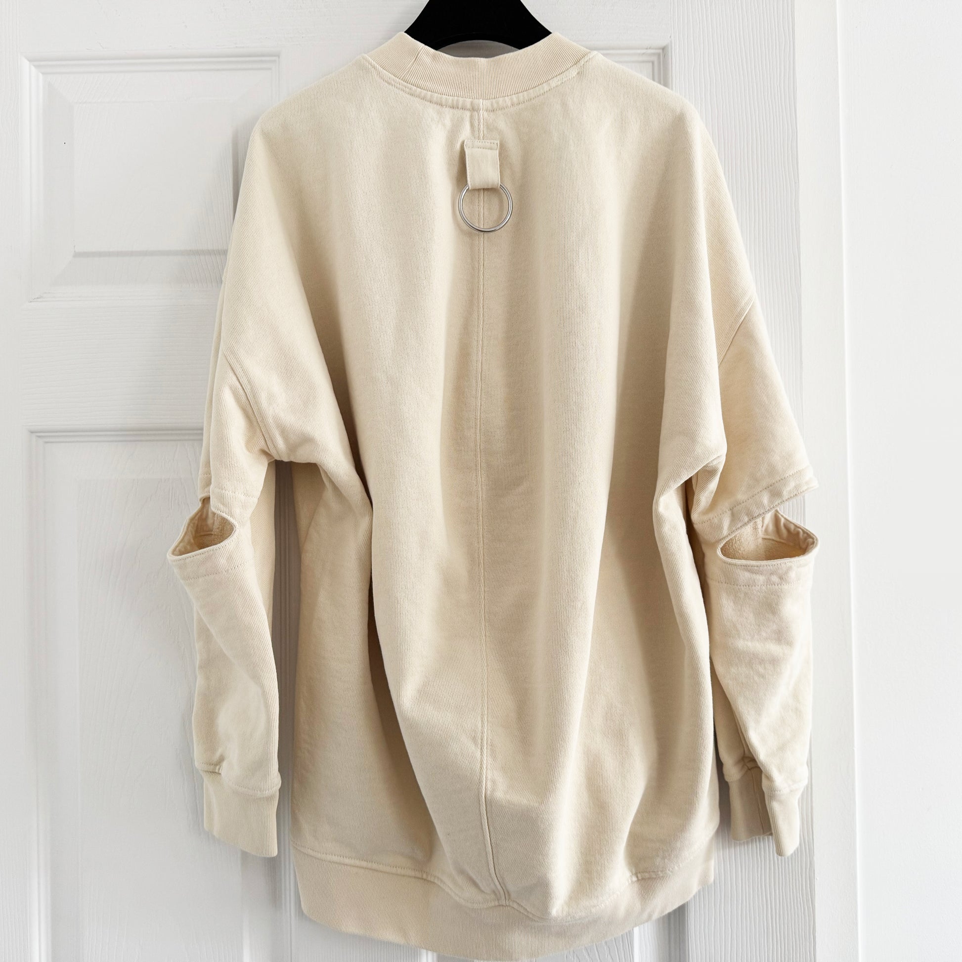 Tibi Cocoon Sweatshirt in Ivory, size XXS. Fits true to size. An icon in the brand's collection - it's a casual wear staple, but it's done in a design-forward way that give it the versatility to be dressed up or down. The key feature of this piece is a discreet elbow slit - which both allows for ease of movement and looks cool. 24 inches in length at the front. 20 inches armpit to armpit, which tapers to the band at the hips, which measures 16.5 inches flat, unstretched. 100% cotton. In excellent condition. Originally $400CAD, and selling here for $135CAD!