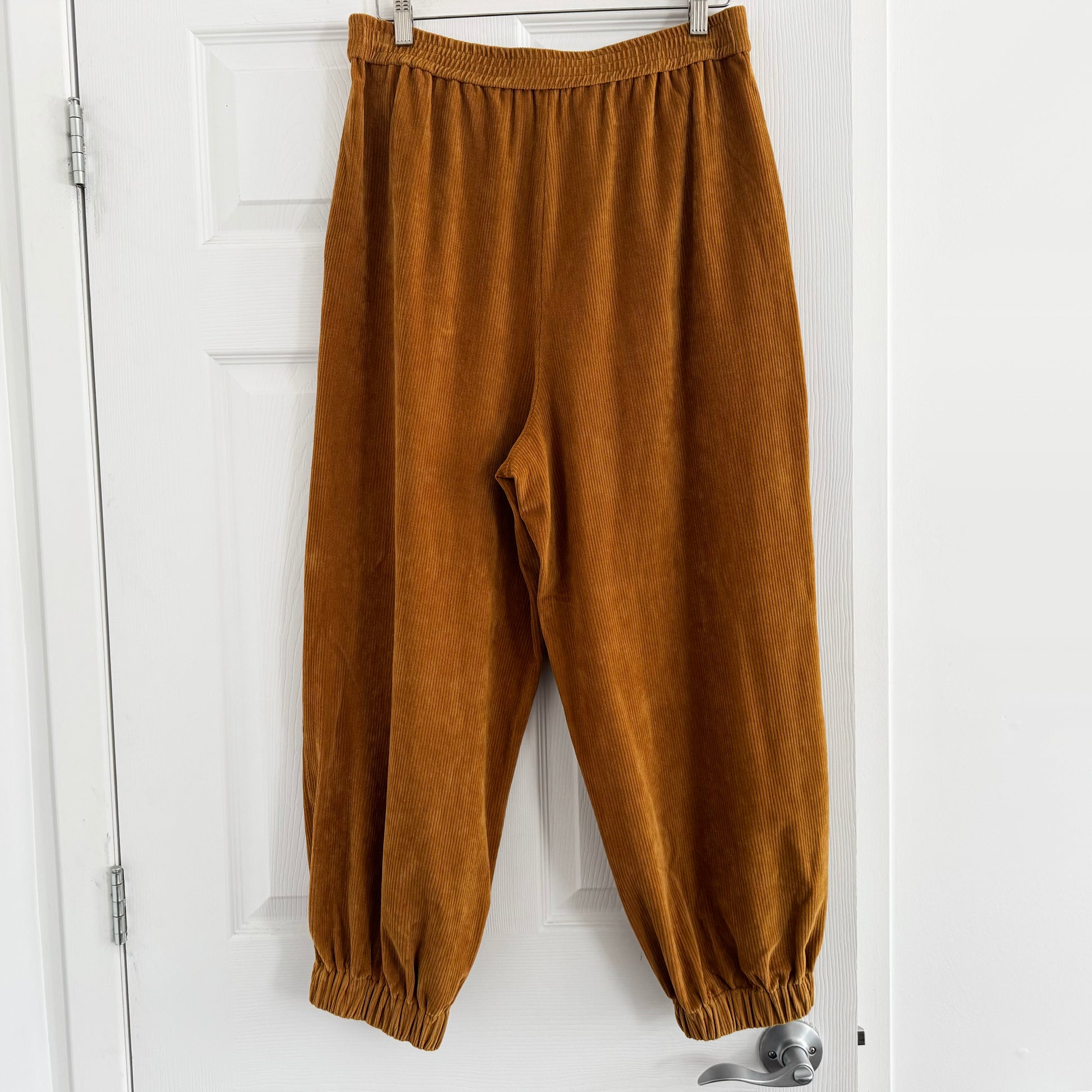 Tibi Corduroy Joggers in Brown, size Large. Fits true to size. I LOVE cord in the fall - and I think these are a really cool bridge piece between loungewear and an actual pant. I feel like you don't normally see corduroy done quite like this, and I love all the possibilities! I think the idea of pairing with a lug sole boot in bad weather is great, but something like the Birkenstock Boston and a sock would be cute for casual weekends. It's not too thin, not too thick, and has some stretch for ease of movement. 16 inch rise, 25 inch inseam. 68% cotton, 29% polyester, 3% elastane. In very good condition. Originally $540CAD, and selling here for $165CAD!