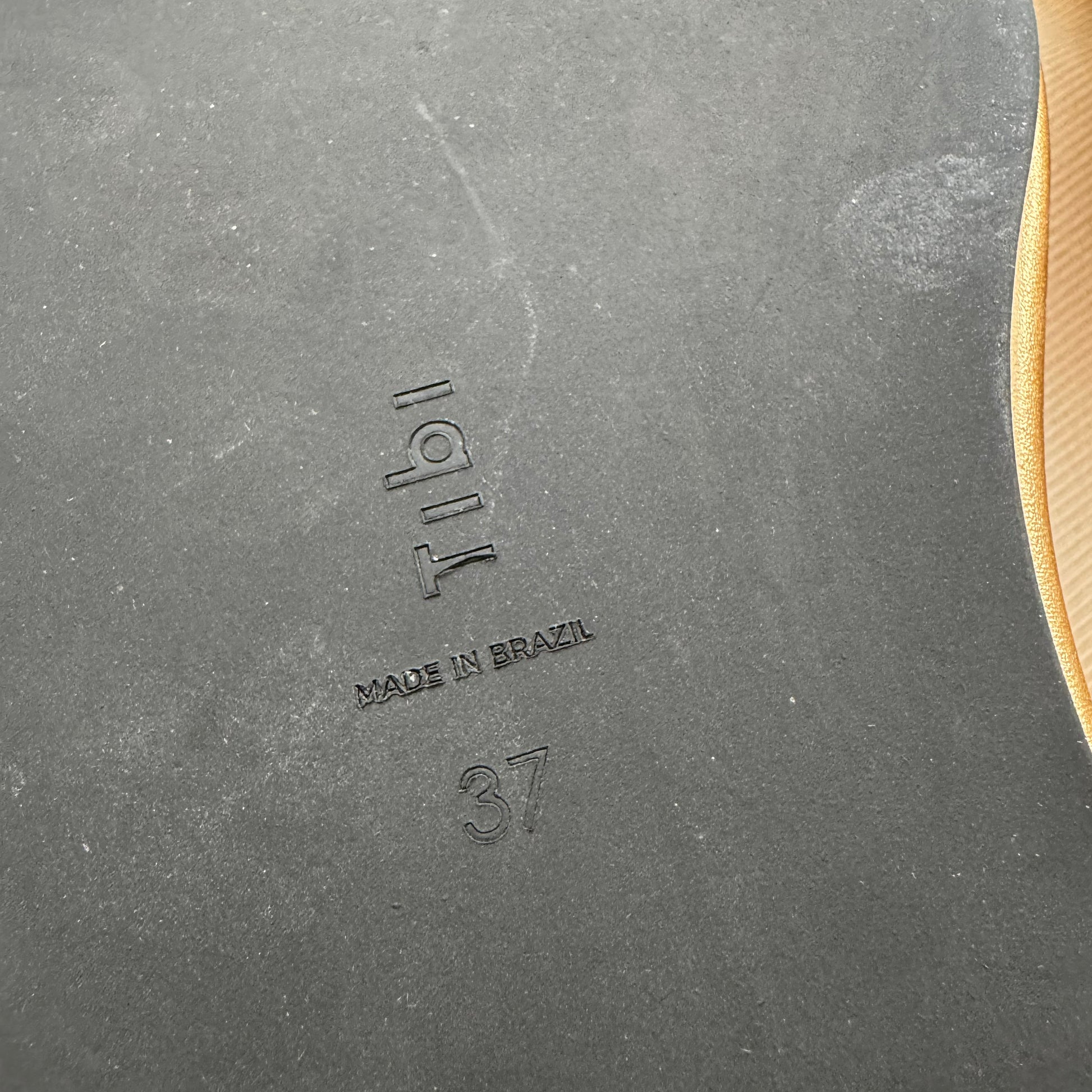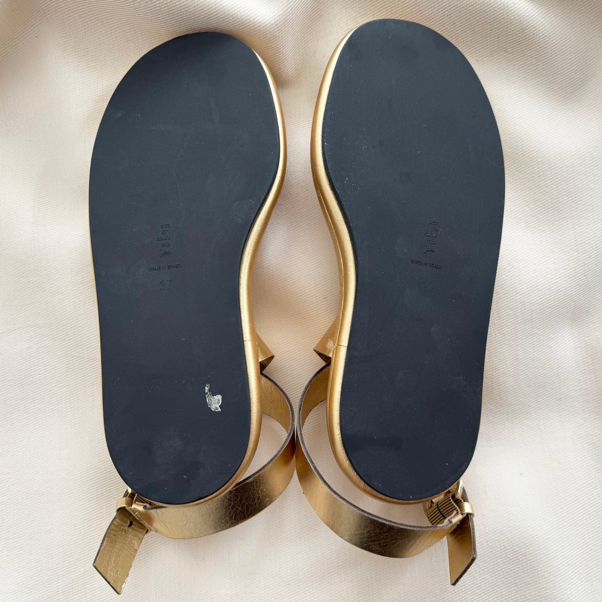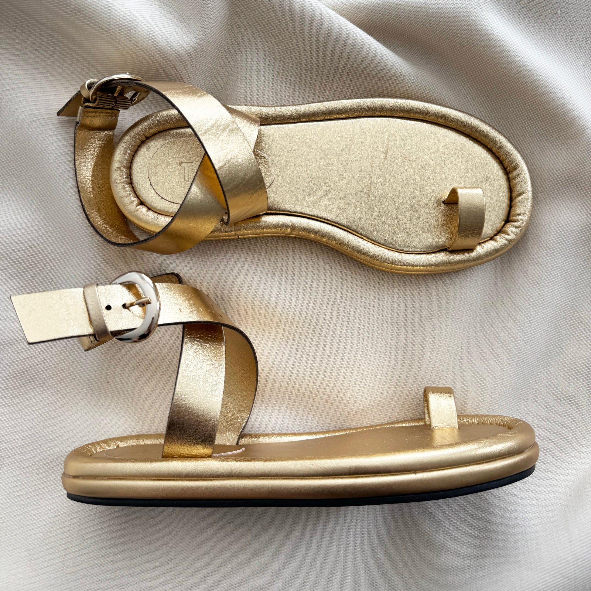 Tibi "Dwayne" Sandal in Gold, size 37. Fits true to size. Functional and beautiful - these modern sandals are minimalist and maximalist at the same time, like, they're simple and match with everything (black pants? Orange dress? Yes to both!). The brand said that they liked the idea of them paired with a Tabi sock, which admittedly, is pretty cool. They're lightweight and would travel beautifully too. Pair back to trousers, skirts, dresses, or denim - it's a super versatile little sandal. 100% Calf Leather (Upper), 100% Thermoplastic Polyurethane (Outsole). In very good condition - some very small scuffs on the upper. Does not come with original box. Originally over $600CAD, and selling here for $175CAD!