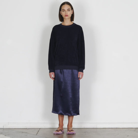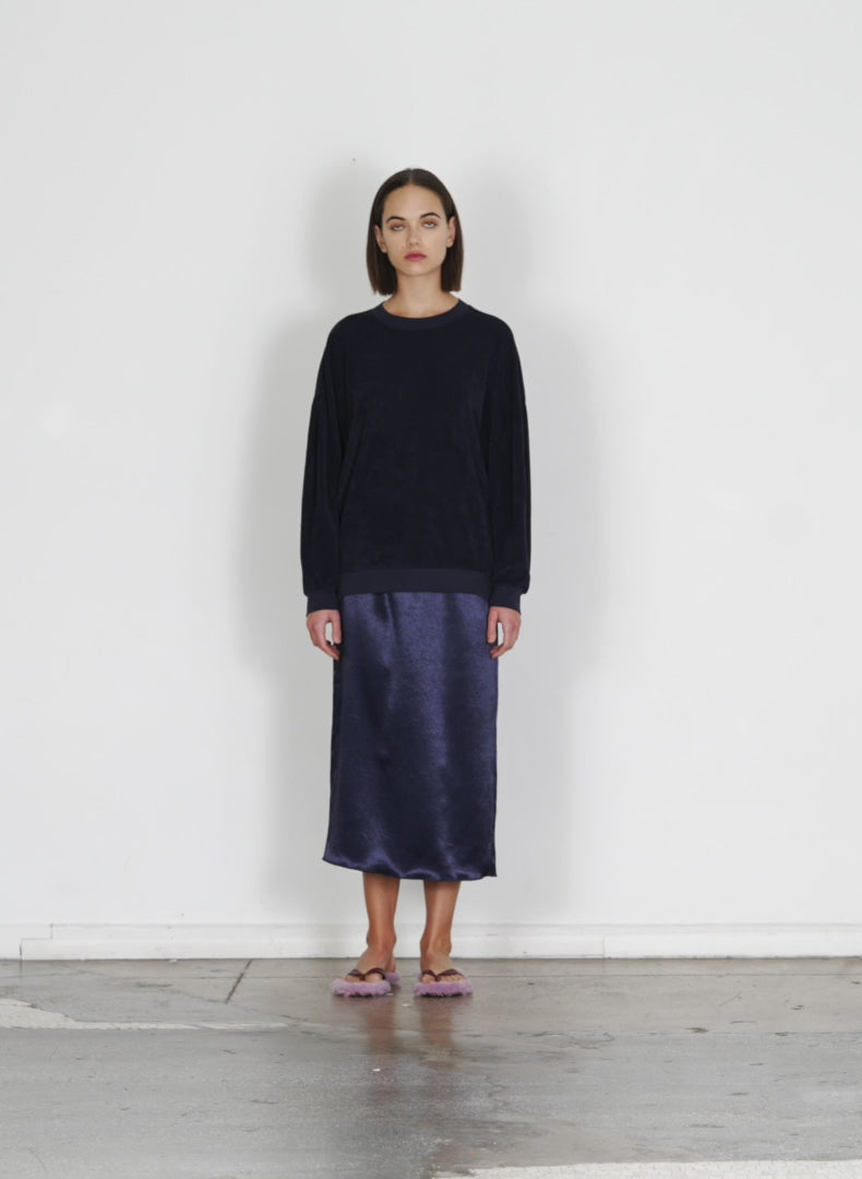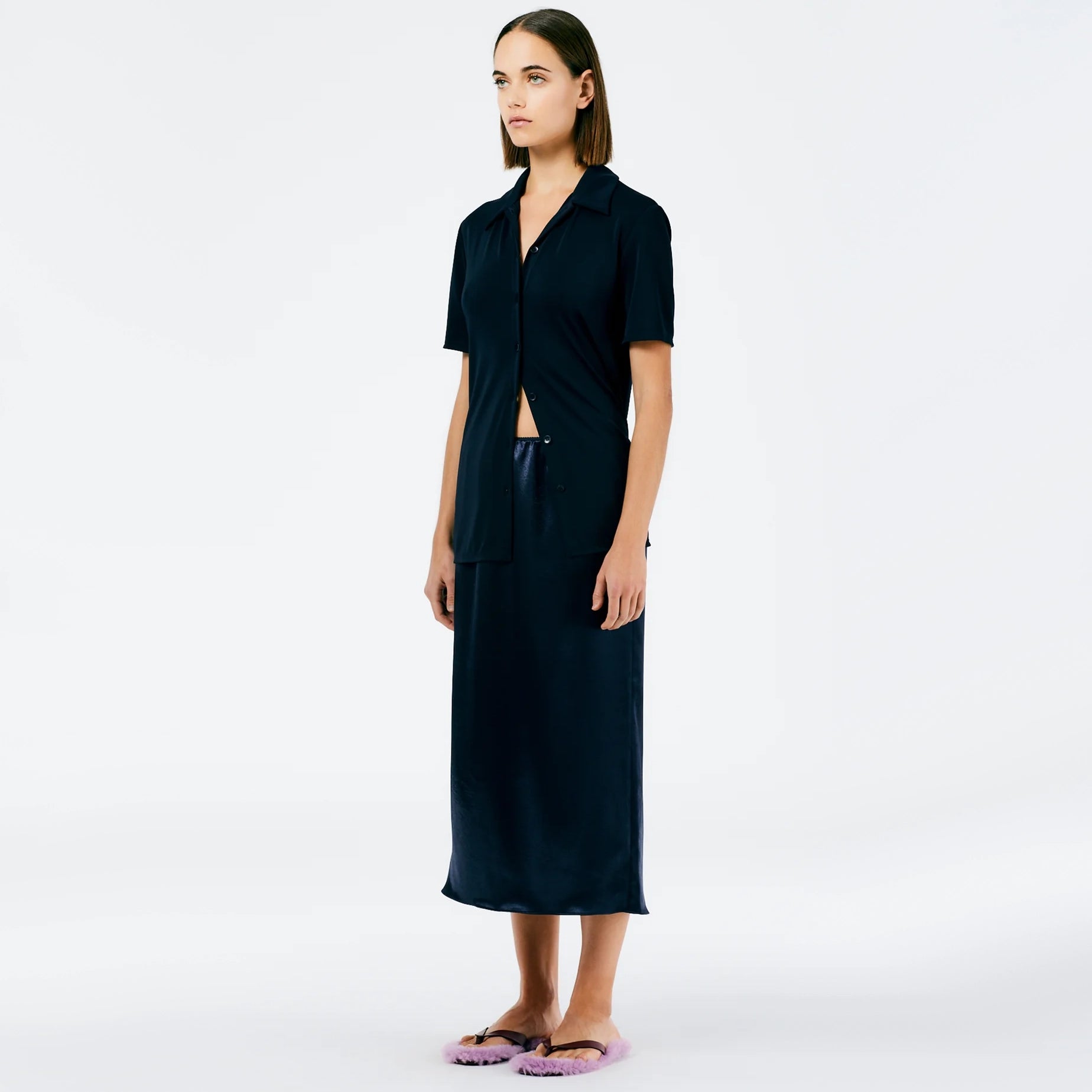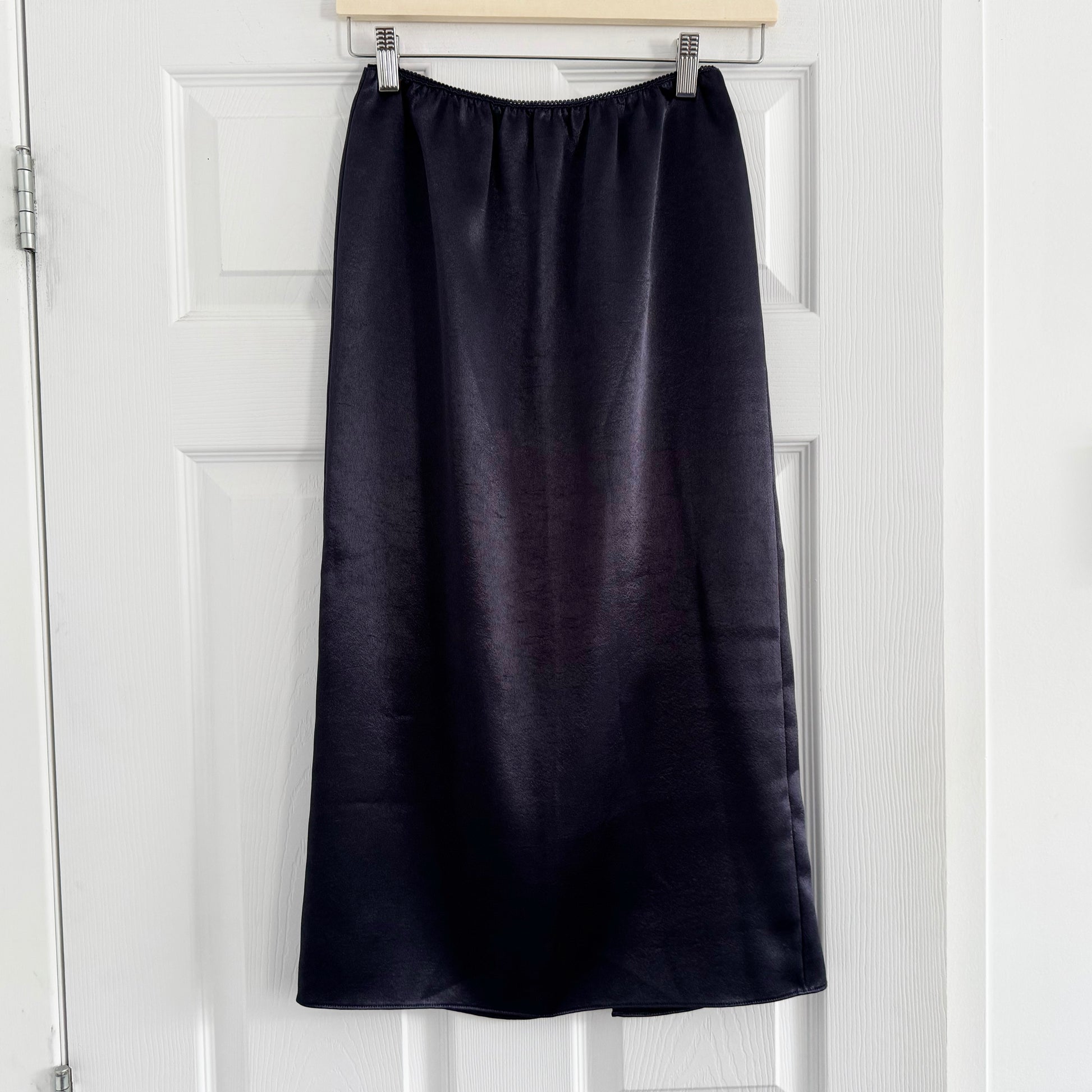 Tibi Navy Satin Slip Skirt, size XXS. Fits true to size. Such a beautiful weight and drape, this slip skirt would be beautiful in all seasons, dressed up or down, when you want some luxe satin texture to contrast with more matte finishes elsewhere in your outfit. Beautiful with suede, cashmere, or just a simple tee. 30.25 inches in length. 18 inches flat across at the hip. The waistband measures 13 inches flat, unstretched, and stretches comfortably to 17 inches to get on and off. 100% polyester. In excellent condition. Originally $550CAD, and selling here for $175CAD!