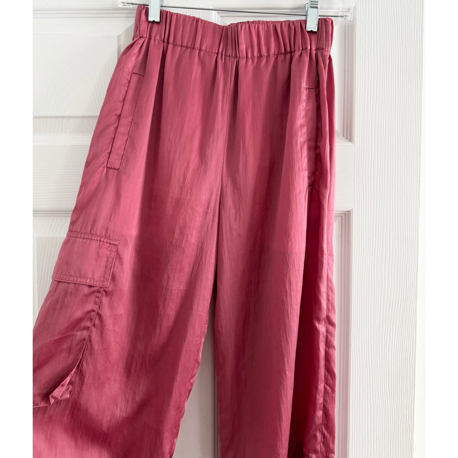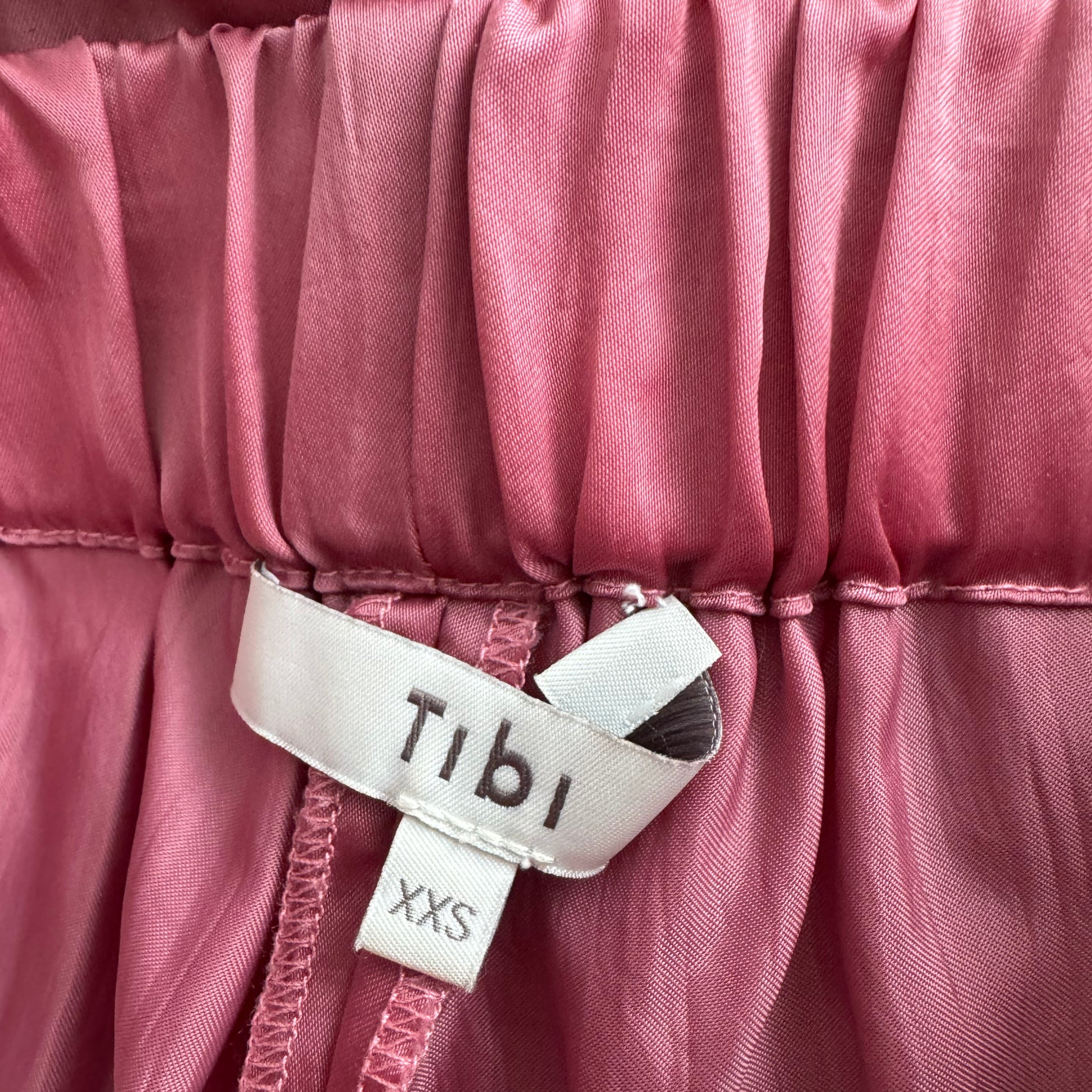 Tibi "Wilt" Silky Nylon Jogger in Rose Pink, size XXS. Fits true to size. Sporty, but not for doing actual sports! These are designed especially for a pant with more of a vibe than jeans, but more chill than a dress pant - but more chic than your literal track pant. Featuring a pull-on elasticized waist, functional side cargo pockets, side zippers, and chic shiny fabrication - these are a staple in the brand's collection right now. They have the relaxed elegance needed to transition from the grocery store, to the office, to evening with the right shoes (or in Tibi terms, a PWD: Play/Work/Dinner). Sneakers - sandals - boots - heels - flats - feel free to play around and experiment a little bit. The waistband measures 12 inches flat, and stretches to 17 max to get on and off. 12 inch rise. 24 inch inseam. 35 inches total length measured down the outside side seam. 100% Polyamide. In excellent condition. Originally $550CAD, and selling here for $135CAD!