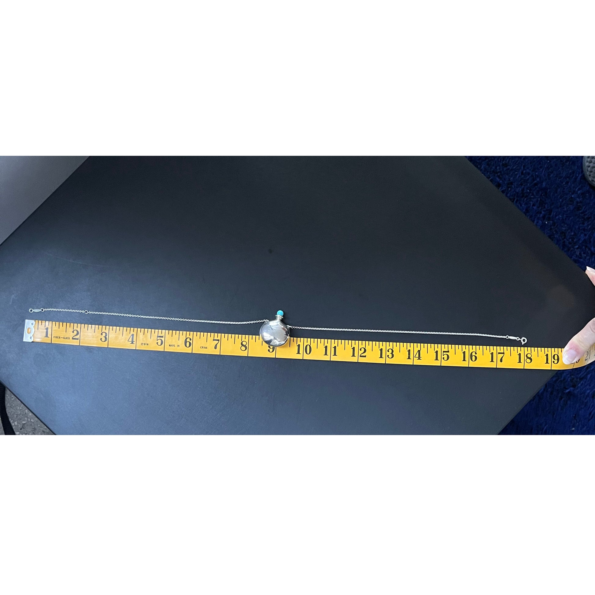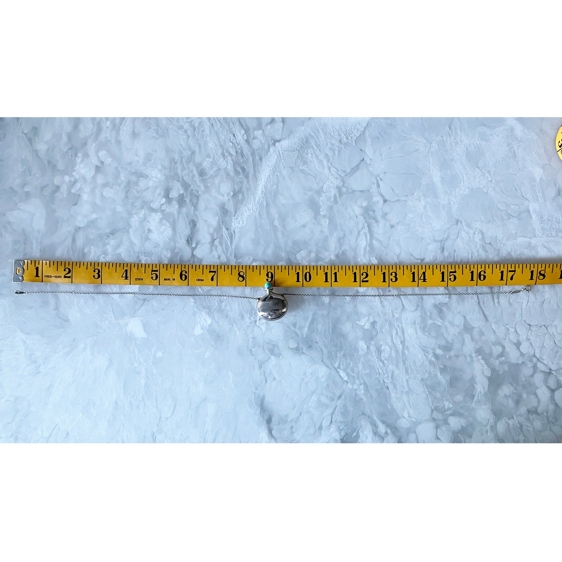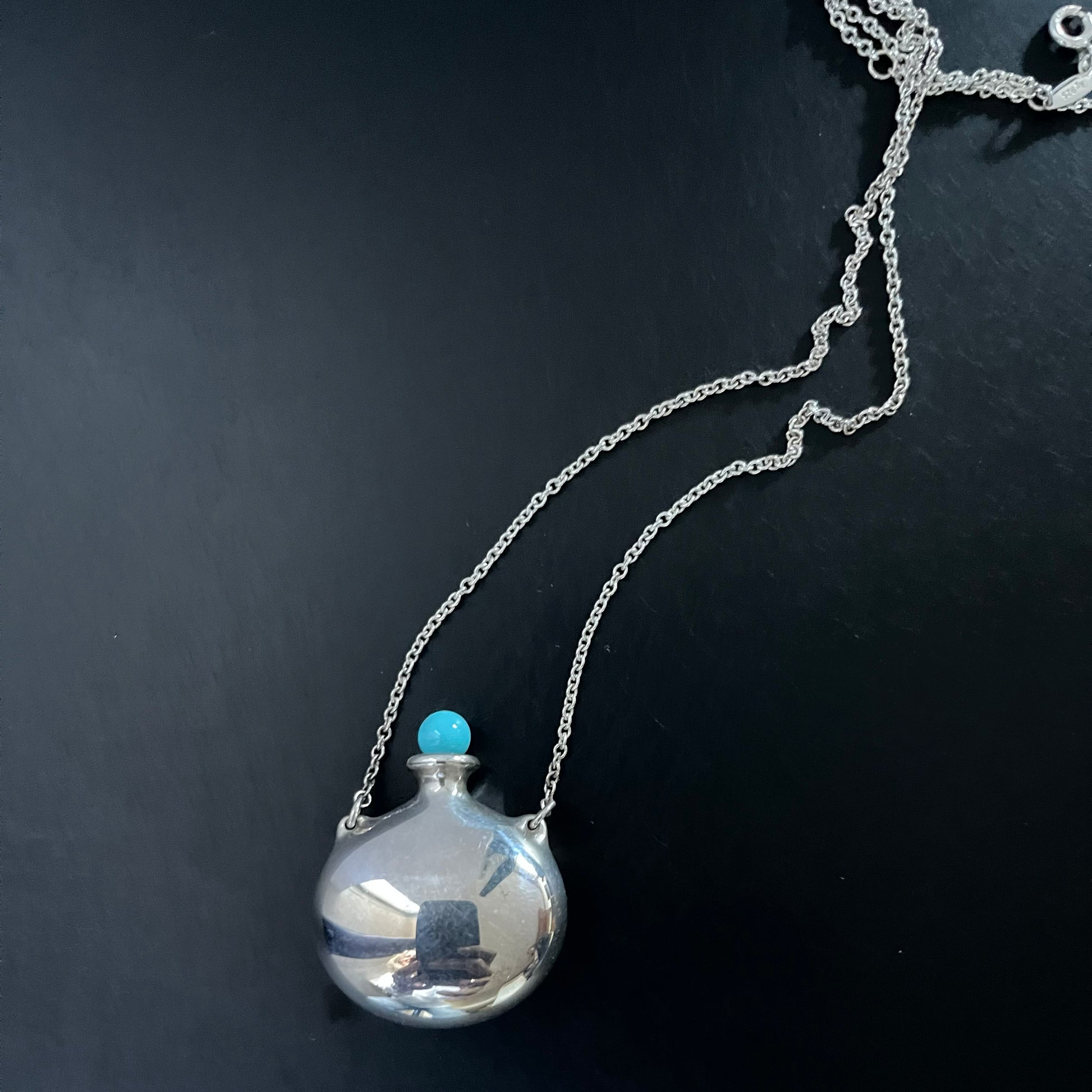 Tiffany x Elsa Peretti Bottle Round Bottle Pendant in Silver - the chain has been shortened from it's original length and is now 18 inches in total length! One of Elsa Peretti's first jewelry designs. Pendant in sterling silver with a removable stopper of hand-carved turquoise. The pendant is 35 x 28 mm. Original designs copyrighted by Elsa Peretti - a stunning and iconic piece! Lightly worn and in very good condition. Currently retails for $1900CAD, and selling here for $835CAD!