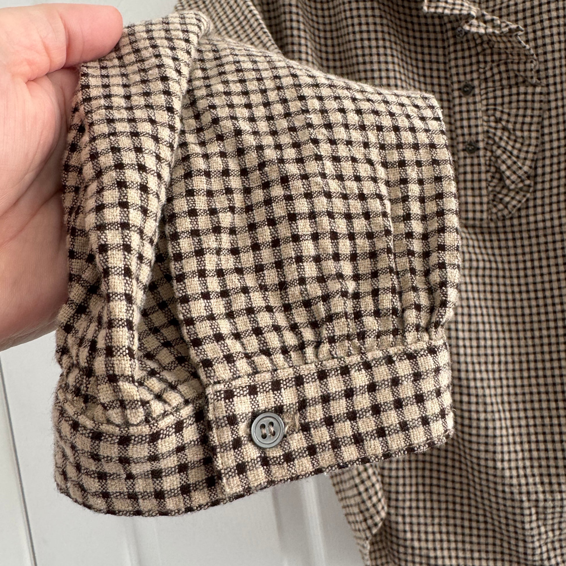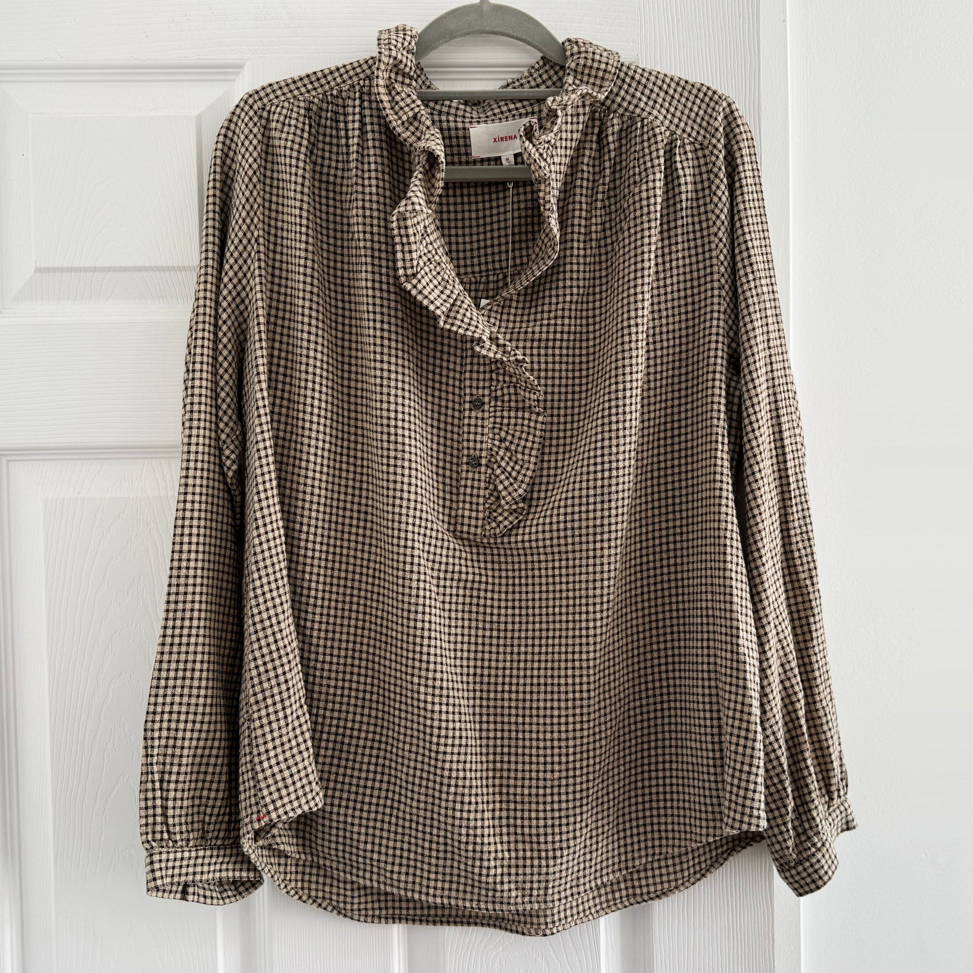 Xirena "Caspian" Top in Toffee, size Medium. Cut to fit loosely. Brand new with tags! Such beautiful colours - and a I love this soft fabric for a feminine take on a flannel shirt. It's sort of plush to the hand - it's very soft to the touch and a bit fluid around the body - just lovely! It's great alone, but cute layered too (the little ruffled collar pokes out from underneath). 23 inches armpit to armpit. 26-27 inches in length. 45% cotton, 36% viscose, 16% polyester, 3% other fibres.. Originally $370CAD, and selling here for $145CAD!