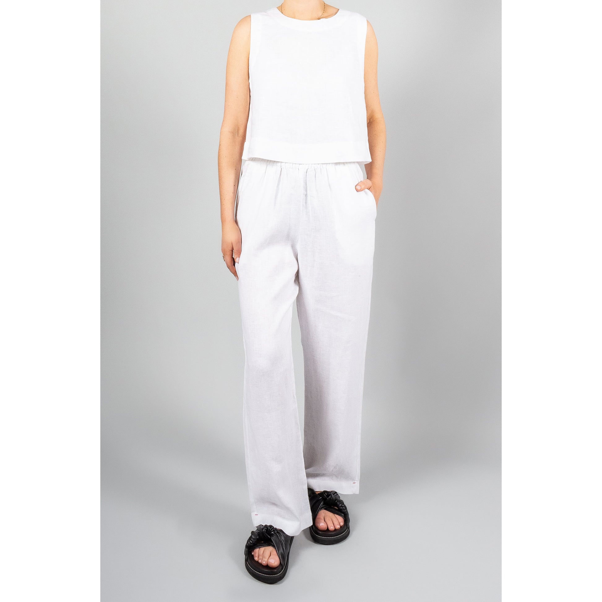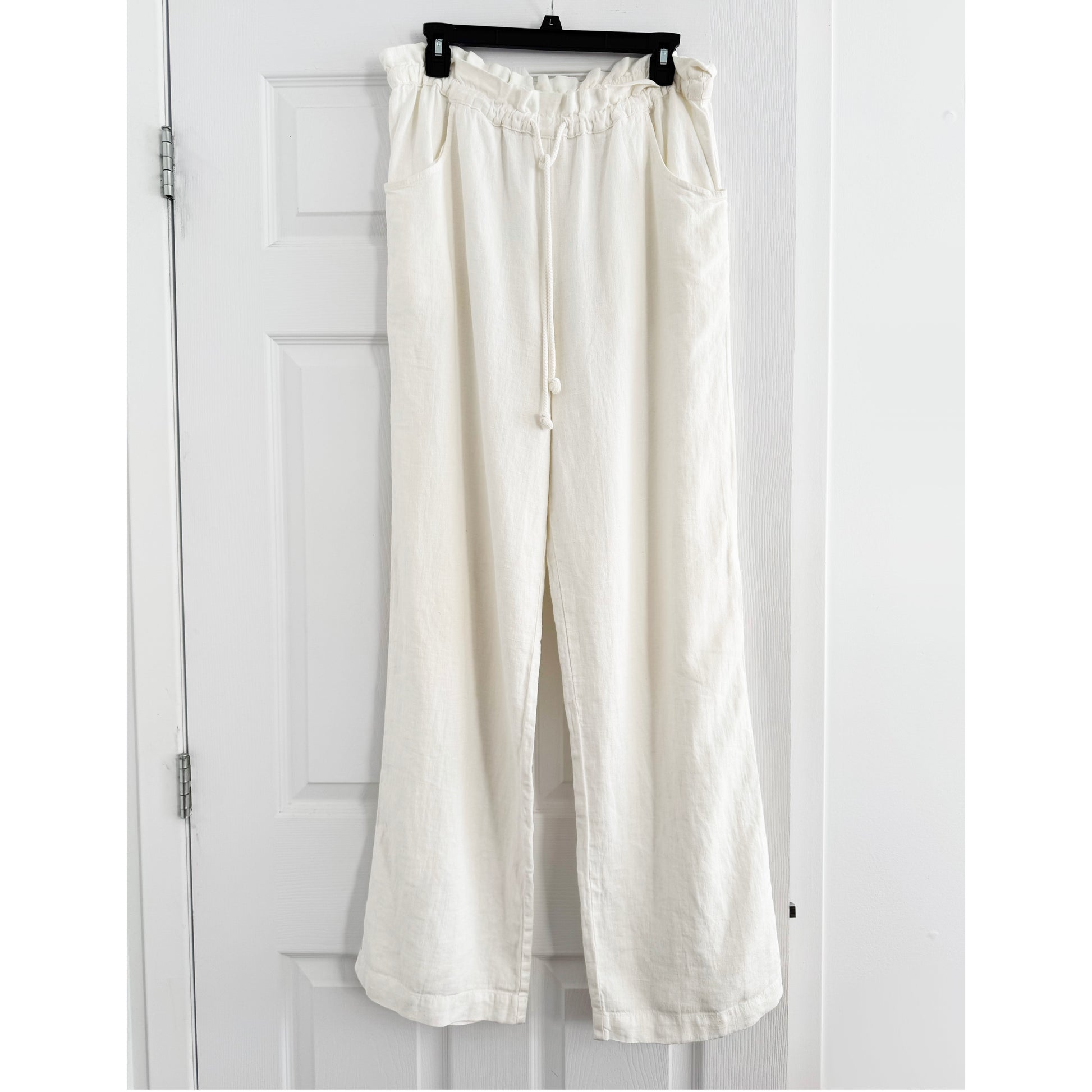 Xirena "Talyn" Linen Pants in White, size Large. Fits true to size. Relaxed and elegant - the linen pant is a must in warm temps - especially for beach/poolside wear! This comfy pair has an elasticated drawstring waistband. You can wear them cuffed if they're a little on the long side for you. 33 inch inseam. 14 inch rise (to the top of the waistband, 12 inch rise excluding the waistband. The waistband is 32 inches unstretched, and stretches to a max of 42 to get on and off. 100% linen. In excellent condition. Originally around $300CAD, and selling here $115CAD!