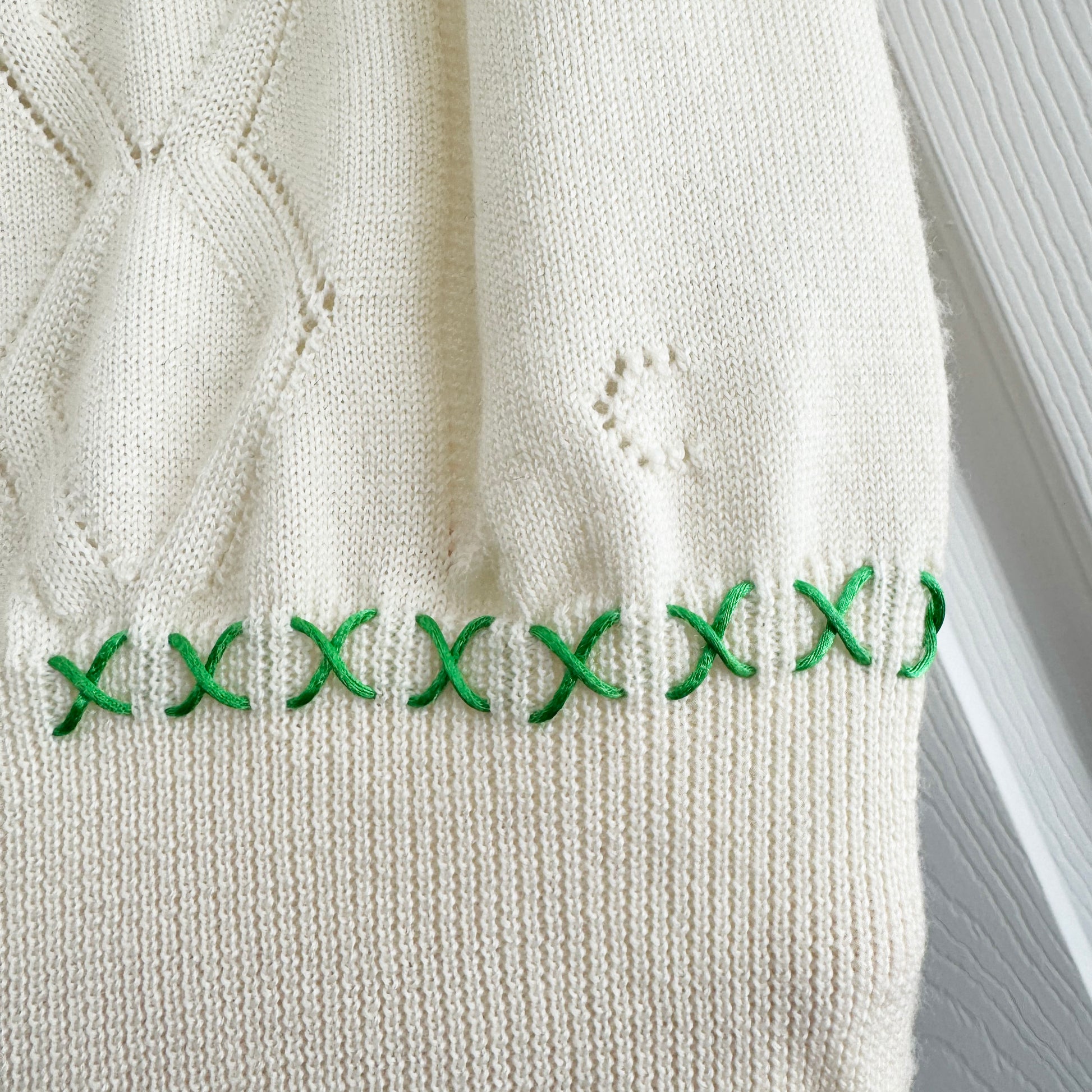 Pull court « Cross Stitch » en laine mérinos blanche Carven, Taille S (coupe slim, taille comme XS). Un joli petit pull en maille pointelle avec des détails de point de croix contrastés à l'encolure et à l'ourlet. Cela fonctionne à merveille pour les vêtements de mi-saison - agréable et léger mais qui reste un peu chaud. 100% laine mérinos. Porté quelques fois seulement et en excellent état. À l'origine 550 $ CAD, et vendu ici pour 125 $ CAD !🎉