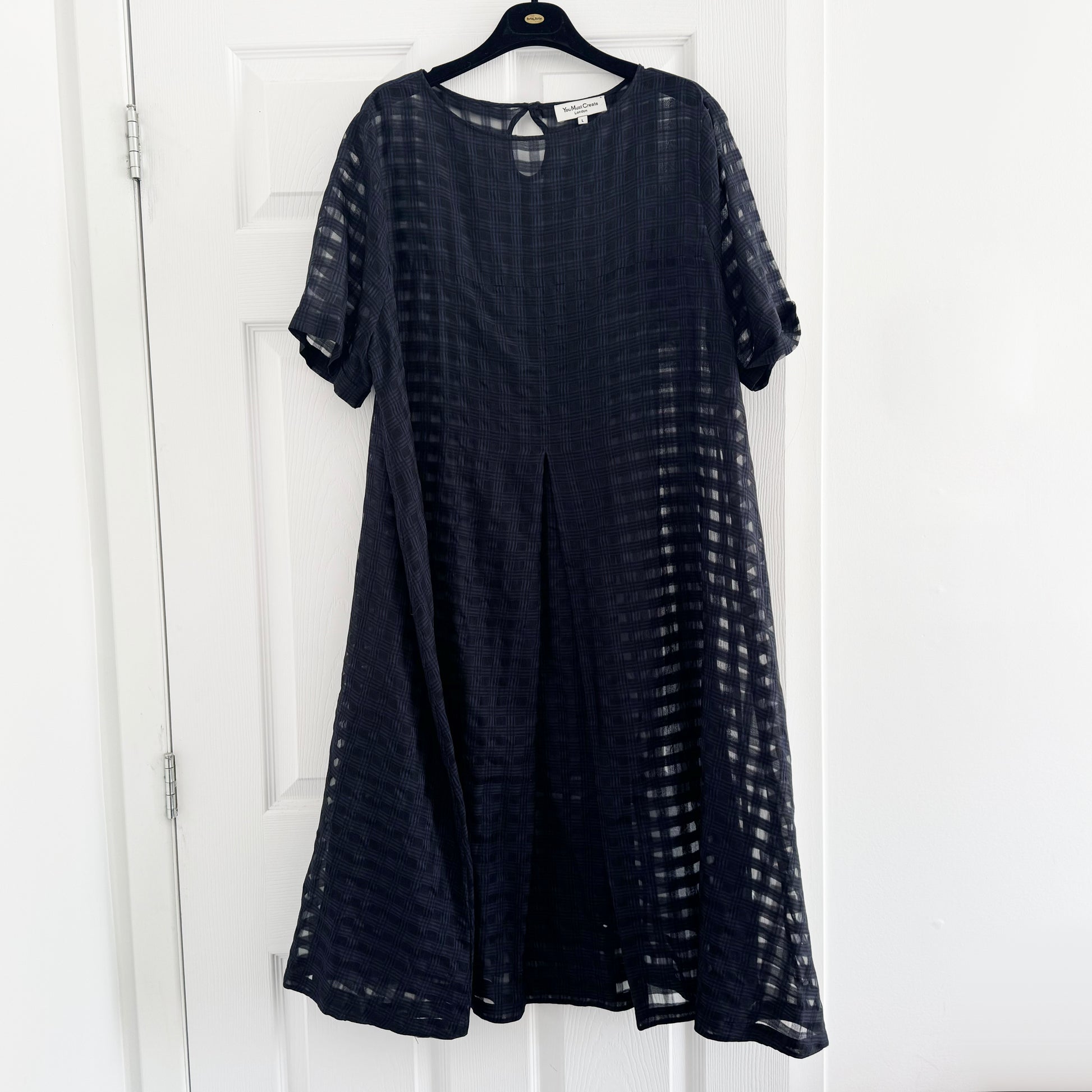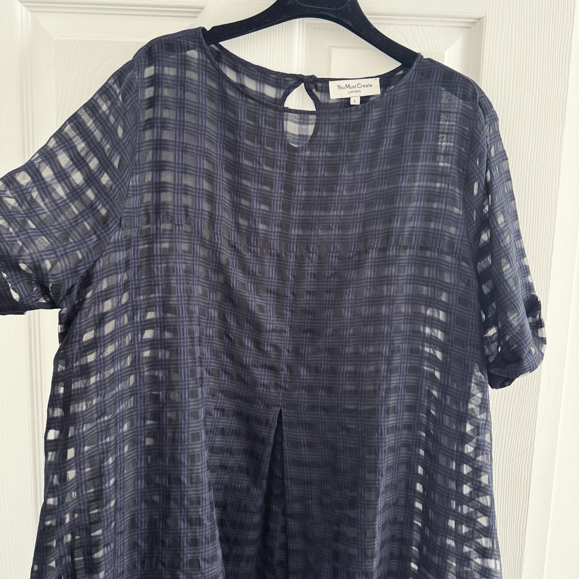 You Must Create "Cruz" Big Pleat Gingham Dress in Navy, size Large. Fits roomy by design, but could work for an XL as well! Done in a beautiful lightweight, sheer fabric - this stunning dress could be dressed up for dinner or down for daytime easily (just switch up the accessories!). It is sheer, and there is no slip included, so you'll either need a slip, or bike shorts underneath. 43 inches in length. 24 inches armpit to armpit. 84% cotton, 16% silk. Lightly worn and in very good condition. Originally over $500CAD, and selling here for $175CAD!