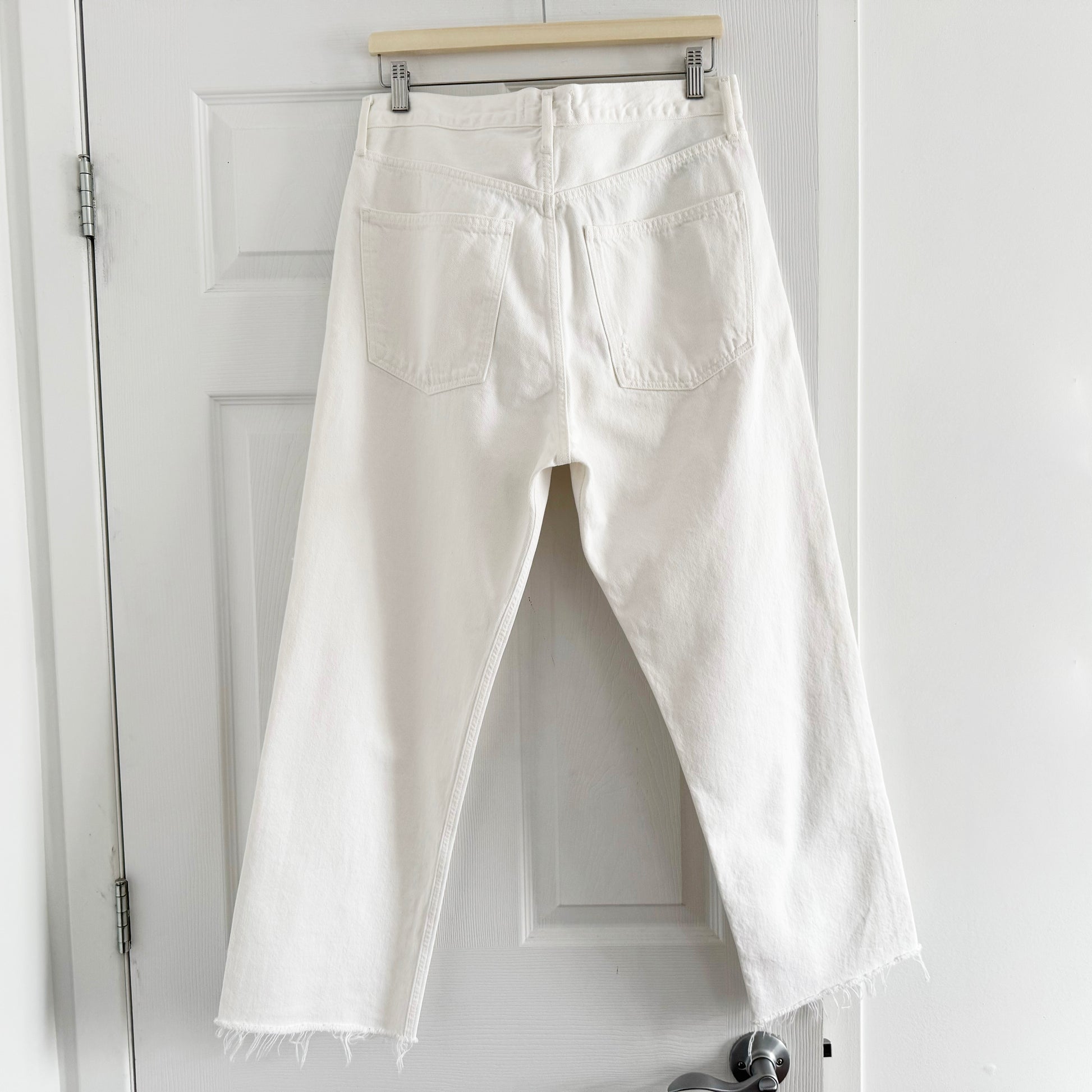 AGOLDE "90s Crop" Jean in "Element" White, size 29. Fits true to size for a not super tight fit. Frayed hem. Button fly. 34 inch waistband. 12.5 inch waistband. 26.5 inch inseam. 100% cotton. Like new - I'm pretty sure new without tags. Originally $265CAD, and selling here for $135CAD!