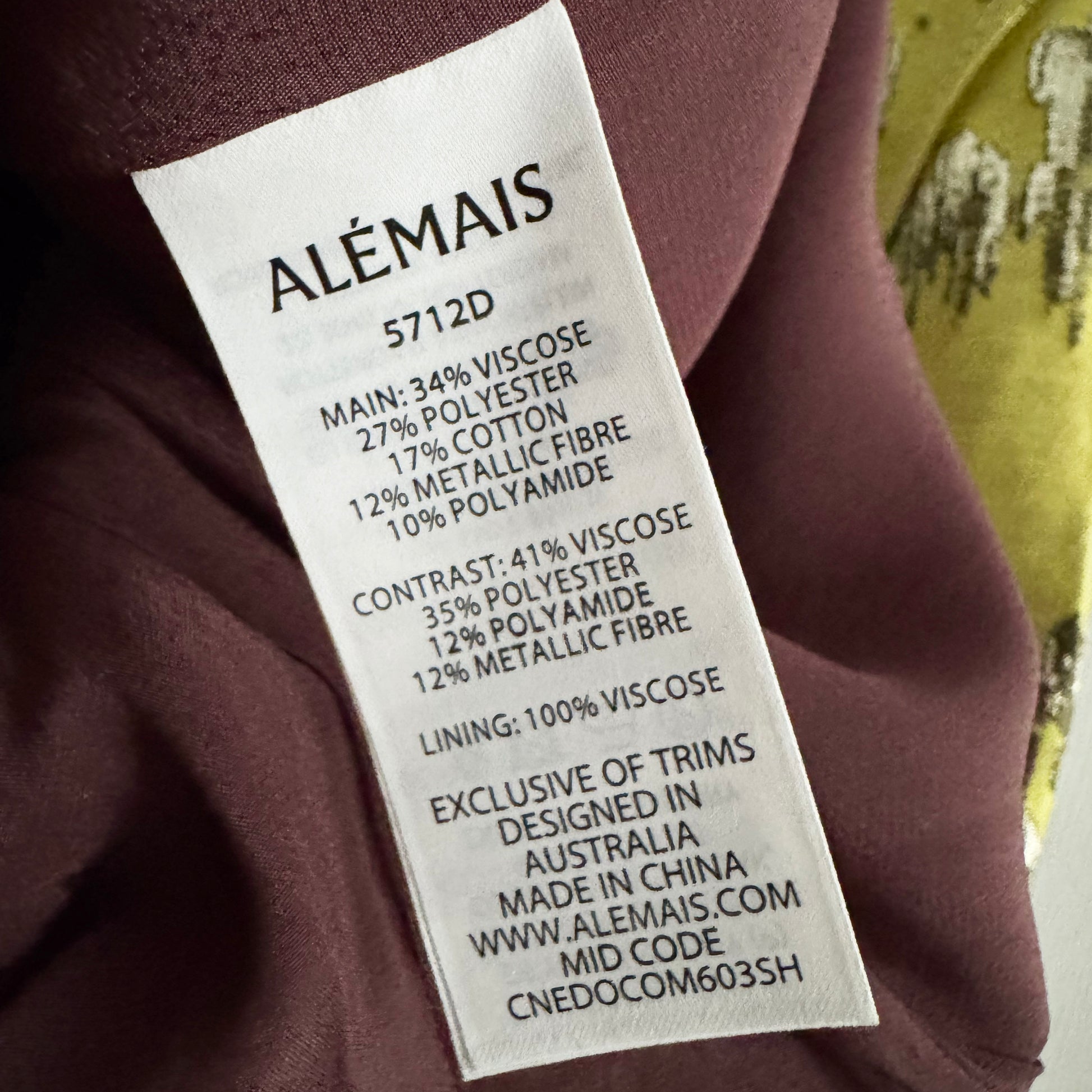 Alemais "Adriana" Jacquard Open Back Dress, size 4. Fits true to size for a slim fit. Brand new with tags! So sexy - so much texture!! This fitted midi dress features an open back with adjustable spaghetti straps and exposed darts. Gold fringe trim at hem. Invisible zip at centre back.The hips measure 19.5 inches flat, best to leave room for ease, as the fabric is structured, with no ease. 14 inches flat at the waistband, so 28 inches around, no stretch. The back is open, and the straps are elasticated and adjustable. 15 inches from shoulder to waistband, and xx inches from waistband to hem. 34% Viscose 27% Polyester 17% Cotton 12% Metallic Fibre 10% Polyamide. Currently retailing for $1100CAD, and selling here for $495CAD!