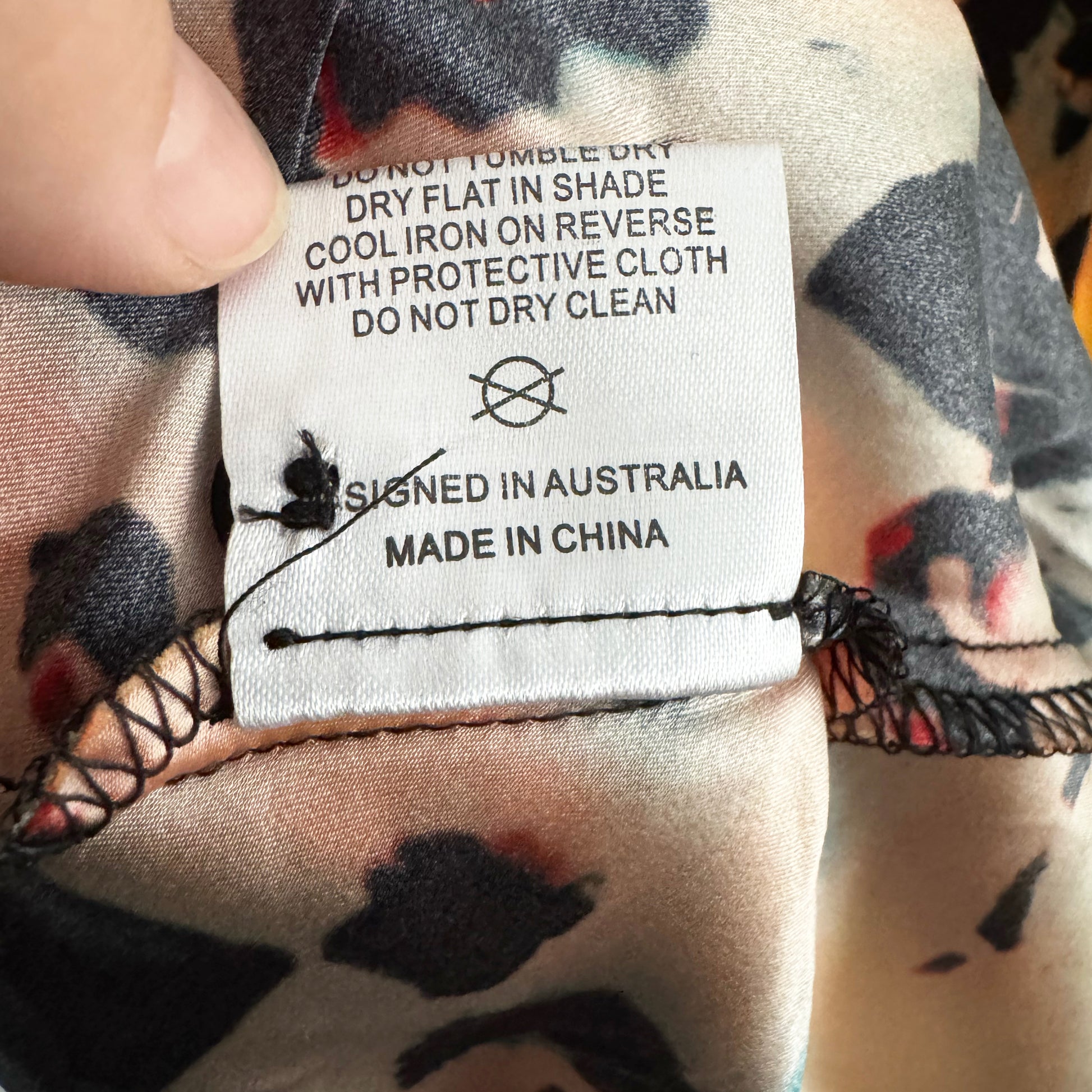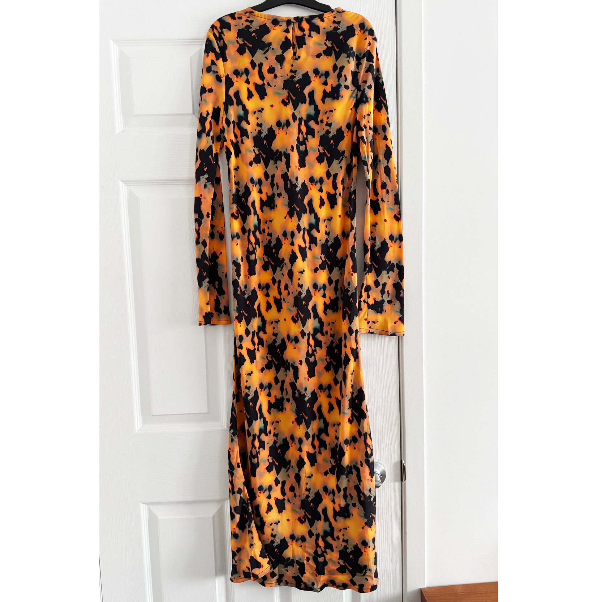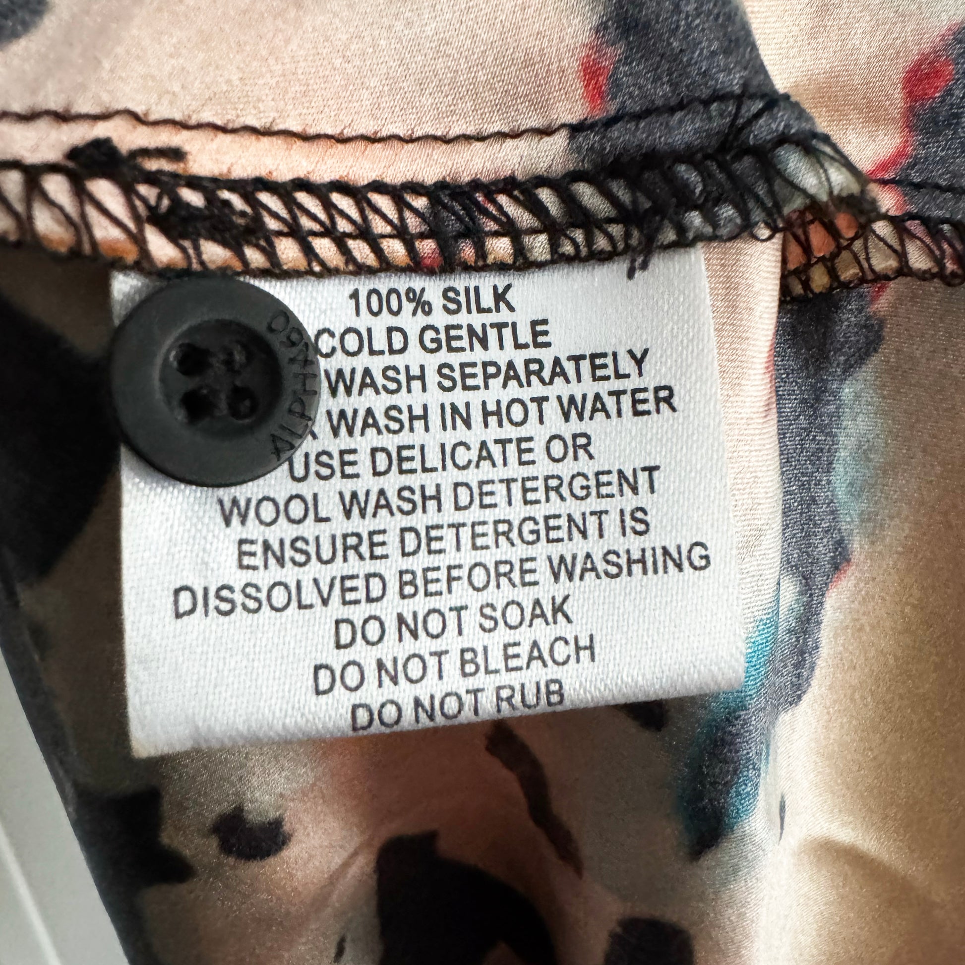 ALPHA60 "Adrian" Dress in "Tortoise", size Small. Fits true to size. A long sleeve style that has a slimline, bias-cut silhouette that drapes elegantly over the body. Featuring a high round neckline that is finished with a centre back split with a button and rouleau opening. This simple dress is cut from a beautiful silk satin that has been cut on the reverse side and has been printed with custom print. 20 inches armpit to armpit. 52 inches in length. 100% Silk. In excellent condition - worn once. Originally $350CAD, and selling here for $165CAD!