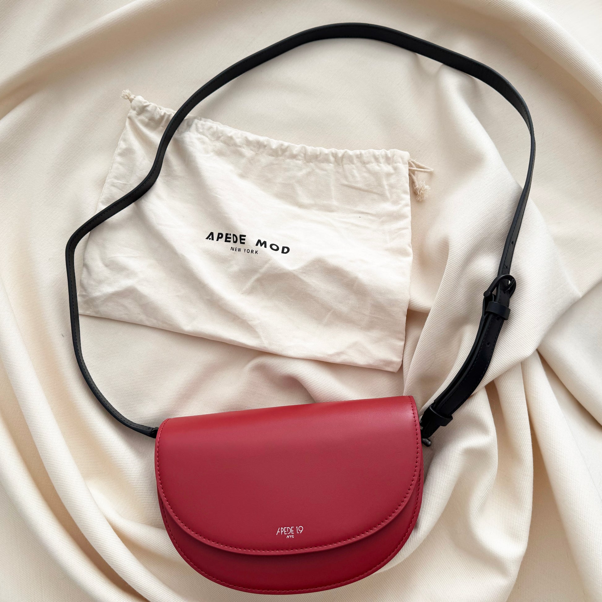 Apede Mod 1.9 Crescent Bag in Red. A gorgeous little bag that offers the perfect pop of red! It holds the essentials - a small wallet, a phone, keys, etc, and has a small zip pouch for flat valuables, some cash and a few cards (in case you are forgoing a wallet all together). The strap is removable (you could switch out for other straps if you like to do that!), and adjustable. This company makes such cute handbags (it’s what they specialize in) - and the quality feels really good - more like what you’d expect from a bag several times this price point. 100% leather. Used maybe once and in excellent condition. Comes with original dustbag. Originally around $600CAD, and selling here for $225CAD!🎉