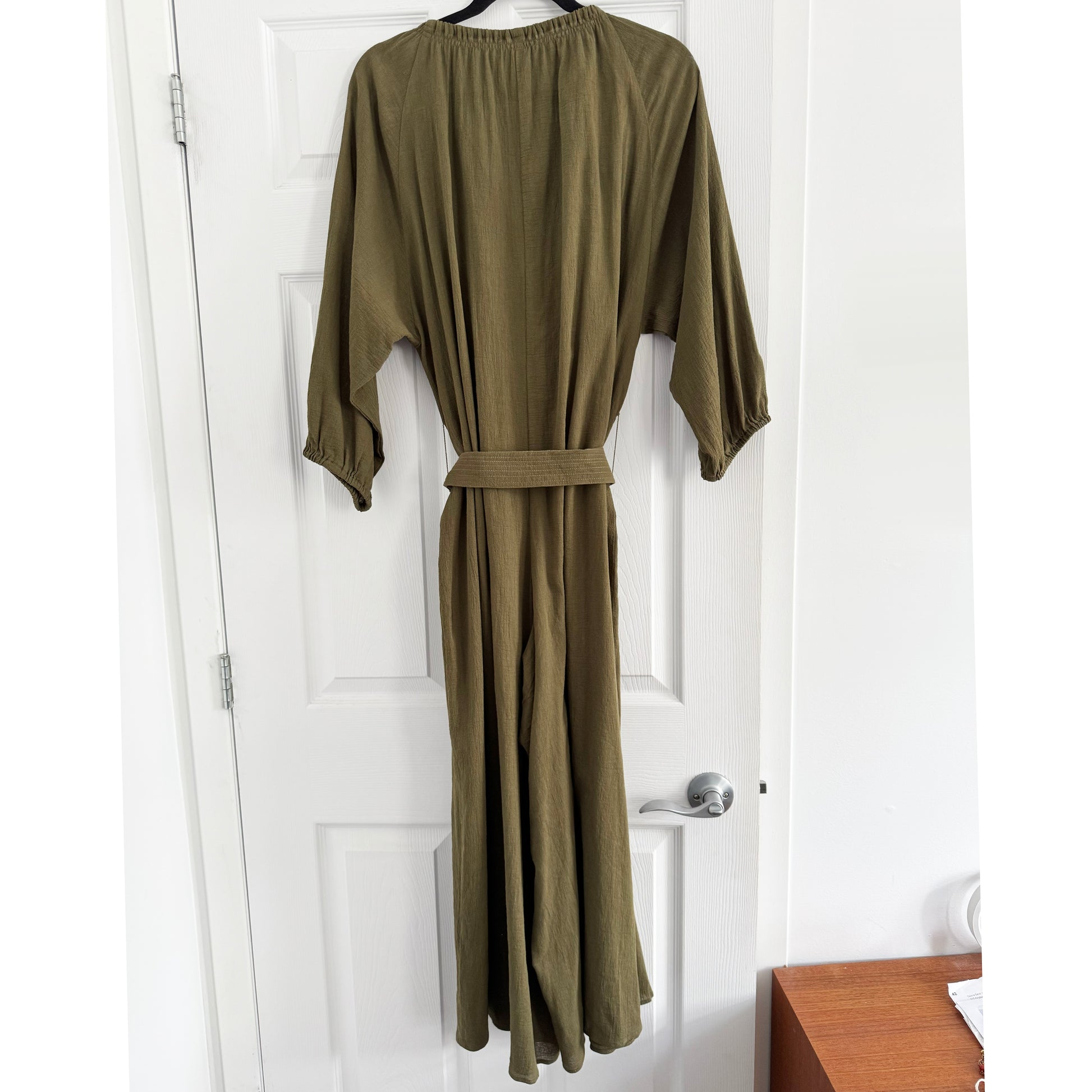 Apiece Apart "Isla" Romper in Khaki, size Medium. Fits true to size. Easy AND chic?? It's a perfect combination - and honestly, it's a pretty perfect piece for anything from lounging to travelling to going out for dinner. That like "I wanna wear my pyjamas out but I don't want to wear my pyjamas out" temper tantrum meltdown outfit. That "life is good and i just want to feel happy and free" outfit. I can't believe that anyone would ever part with this jumpsuit, but I'm secretly happy they did since I would sell this piece a million times over with great joy. Hook and eye closures up the front allow the wearer to control how much cleavage to show. Elasticated neckline. 100% cotton. 53 inches total length. 24 inch inseam. 100% cotton. In excellent condition. Originally $500CAD, and selling here for $165CAD!