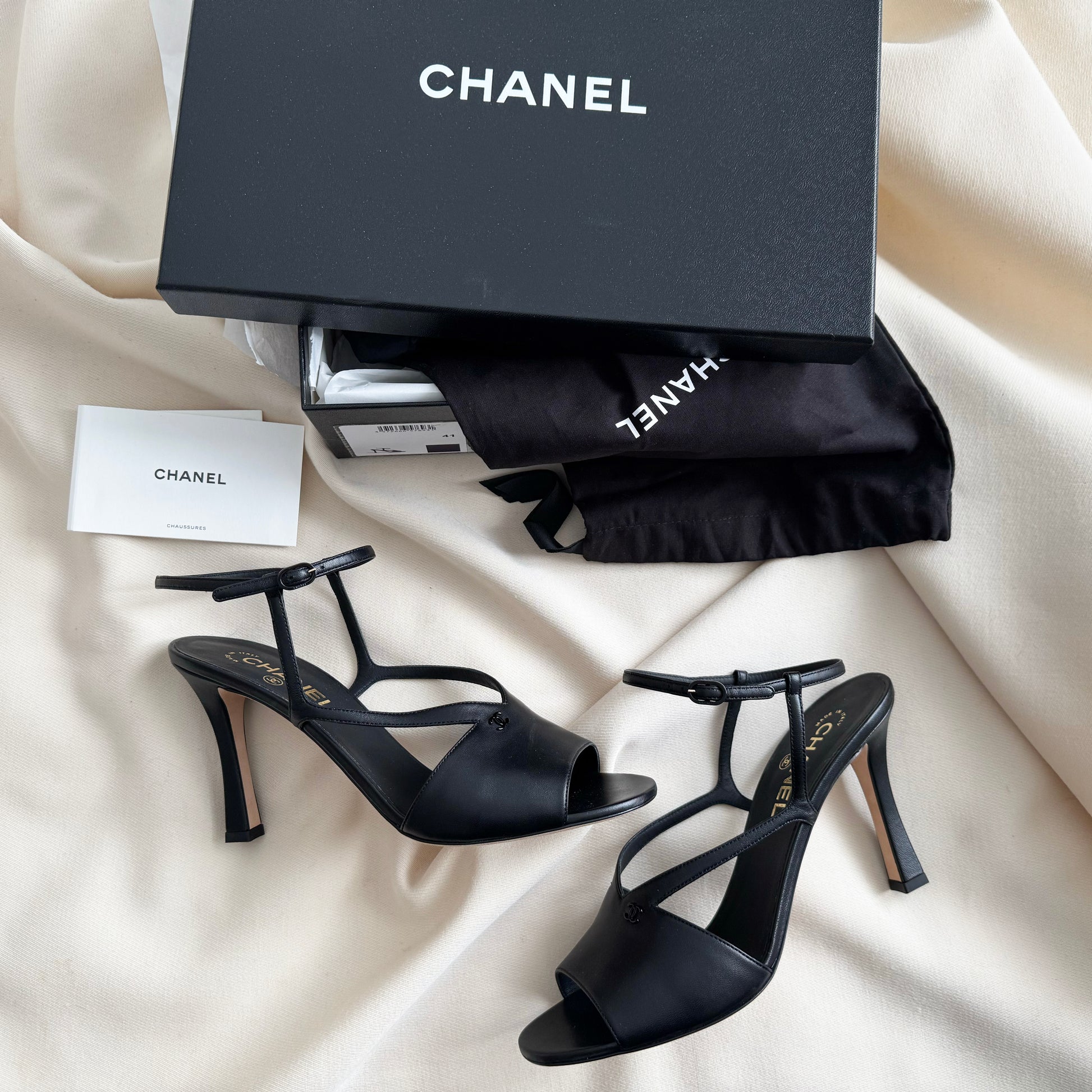 Chanel High Heel Leather Sandals in Black, size 41C. Fits like a 10.5 - an average (or just very, very slightly wider than average) width. Brand new in box! Absolutely stunning - so sexy!! I love the curve of the heel - it's so feminine and SO flattering. One thing that I think is so smart is how wide the band around the foot is - it's more comfy than thin straps - and more supportive! A very subtle logo on the top of the foot strap. 100mm heel height. Never worn - in original box, with original dustbags. Originally around $2000CAD, and selling here for $695CAD!