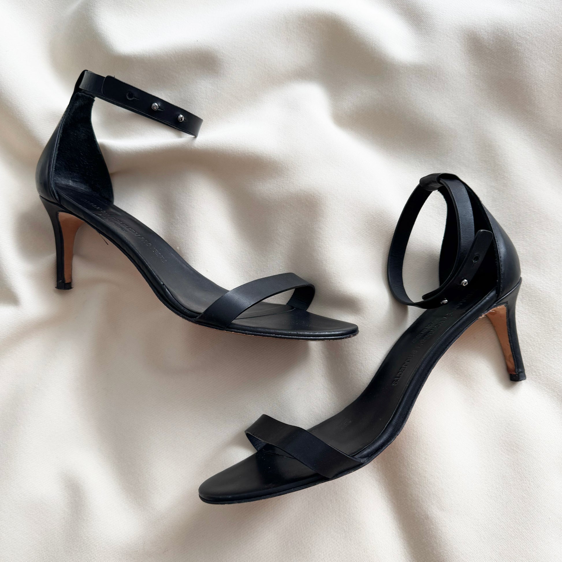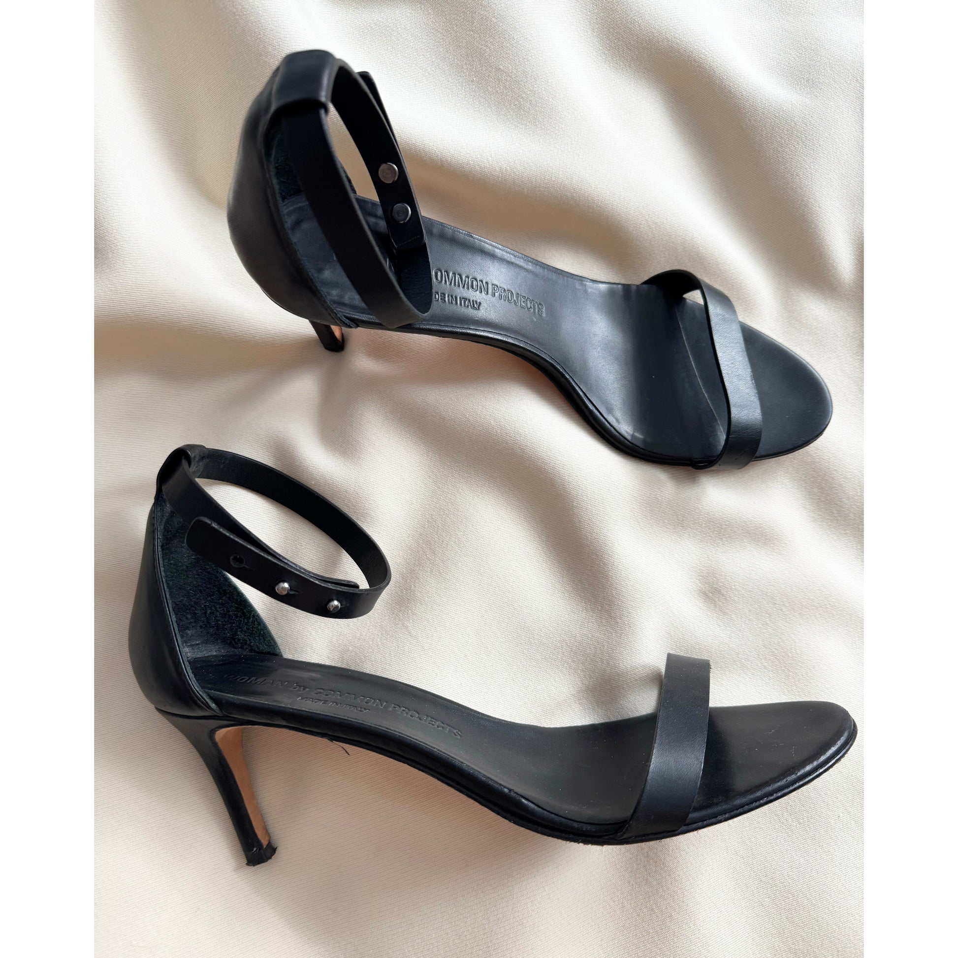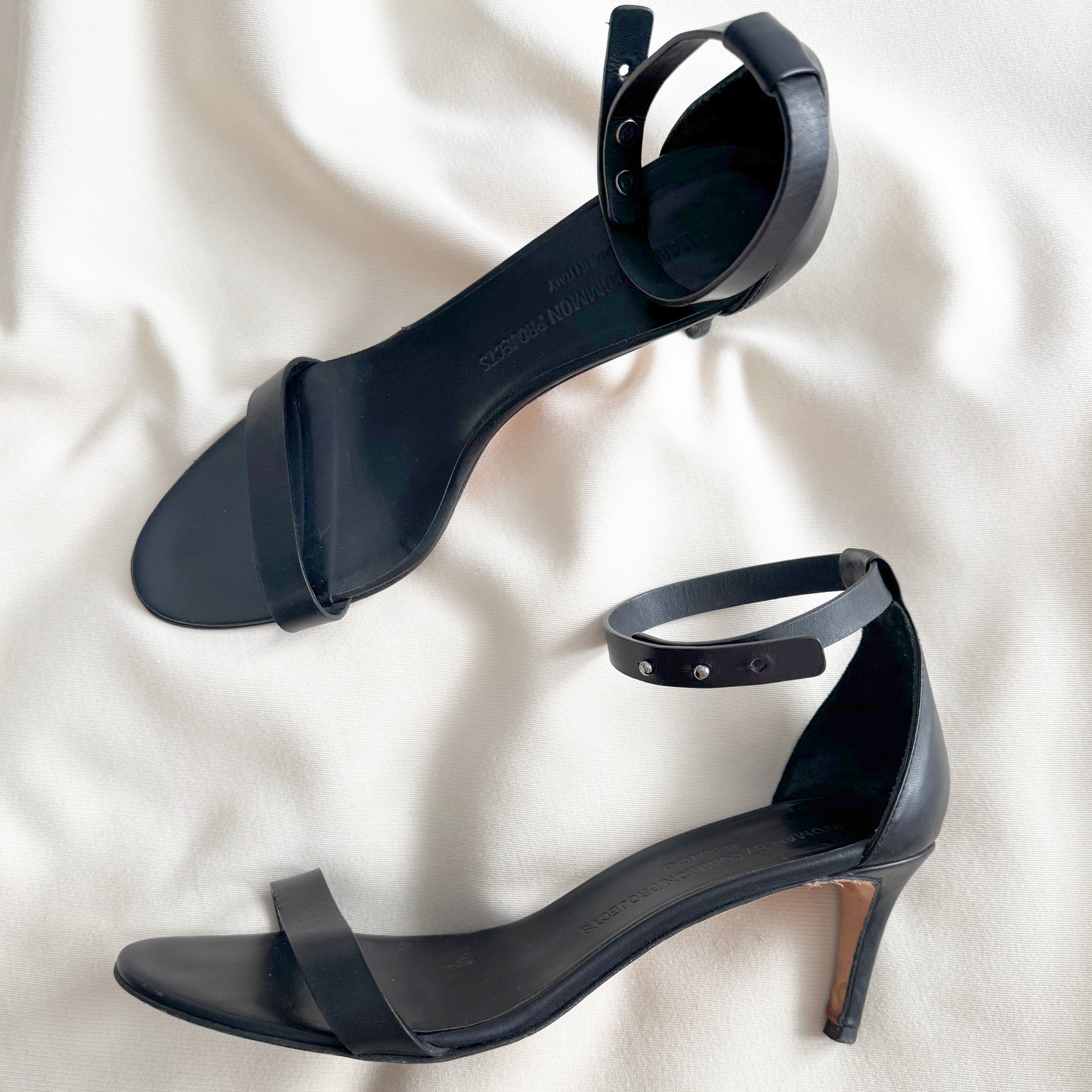 Common Projects Minimalist Black Sandals with Ankle Strap, size 40. Fits true to size. A versatile little heel - with an ankle strap to keep your foot secure. It's just one of those shoes that works with nearly everything - great if you are travelling! Very reasonable 70 mm heel height. Worn maybe twice - the only wear you'll notice is the sole. Does not come with original box or dustbags or anything. Originally $700CAD, and selling here for $165CAD!