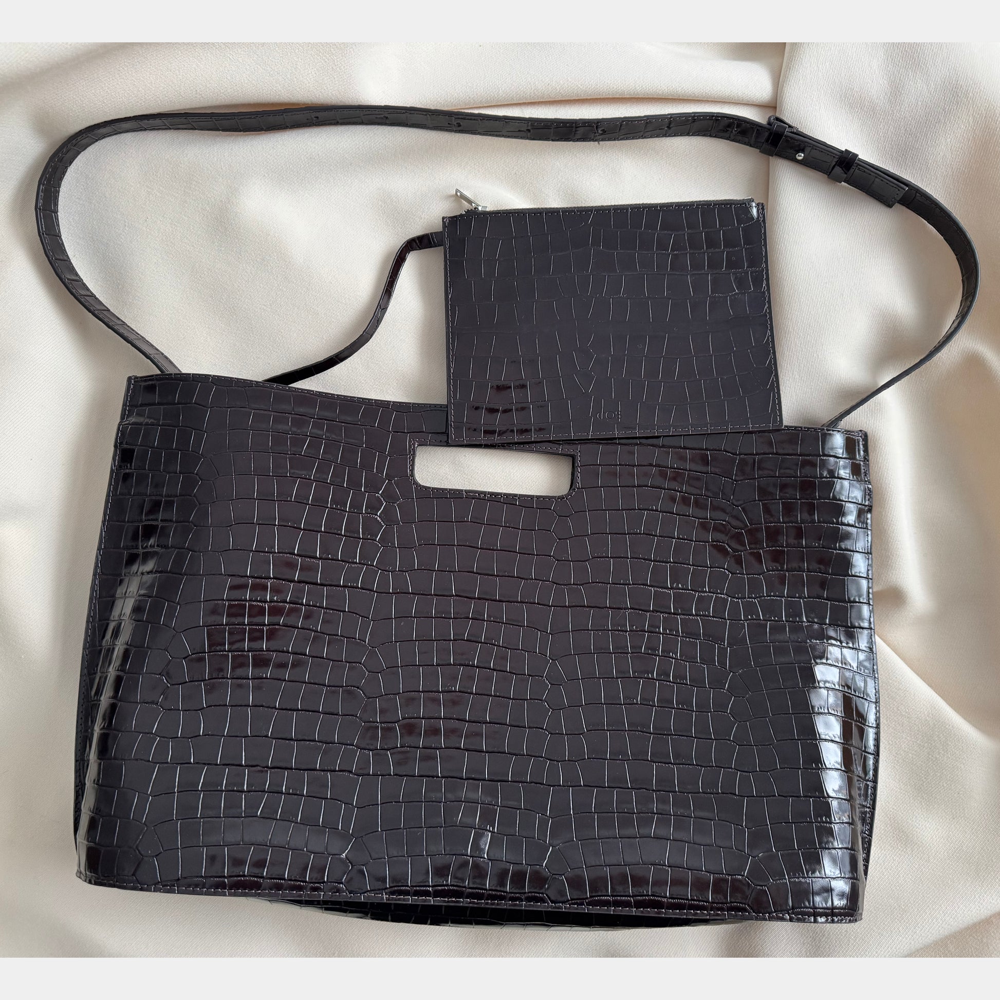 COS "Folio Oversized" Bag in Croc-Effect Leather in Brown. So sleek - and serves all kinds of needs - from work bag to drama day bag - and with the removable strap it becomes whatever you need it to be! Crafted from crocodile-effect leather, which has some structure to it, it holds it's shape: a slim silhouette with angular sides and an oval-shaped base. Style it across the body or carry it by the cutout handle. Height: 11.5 inches, Width: 19 inches, Depth: 4 inches. The strap length is 40 inches at the maximum, and 28 inches on the shortest. Shell and lining: 100% Leather. Excluding trims. Like new. Currently selling for $540CAD, and selling here for $235CAD!