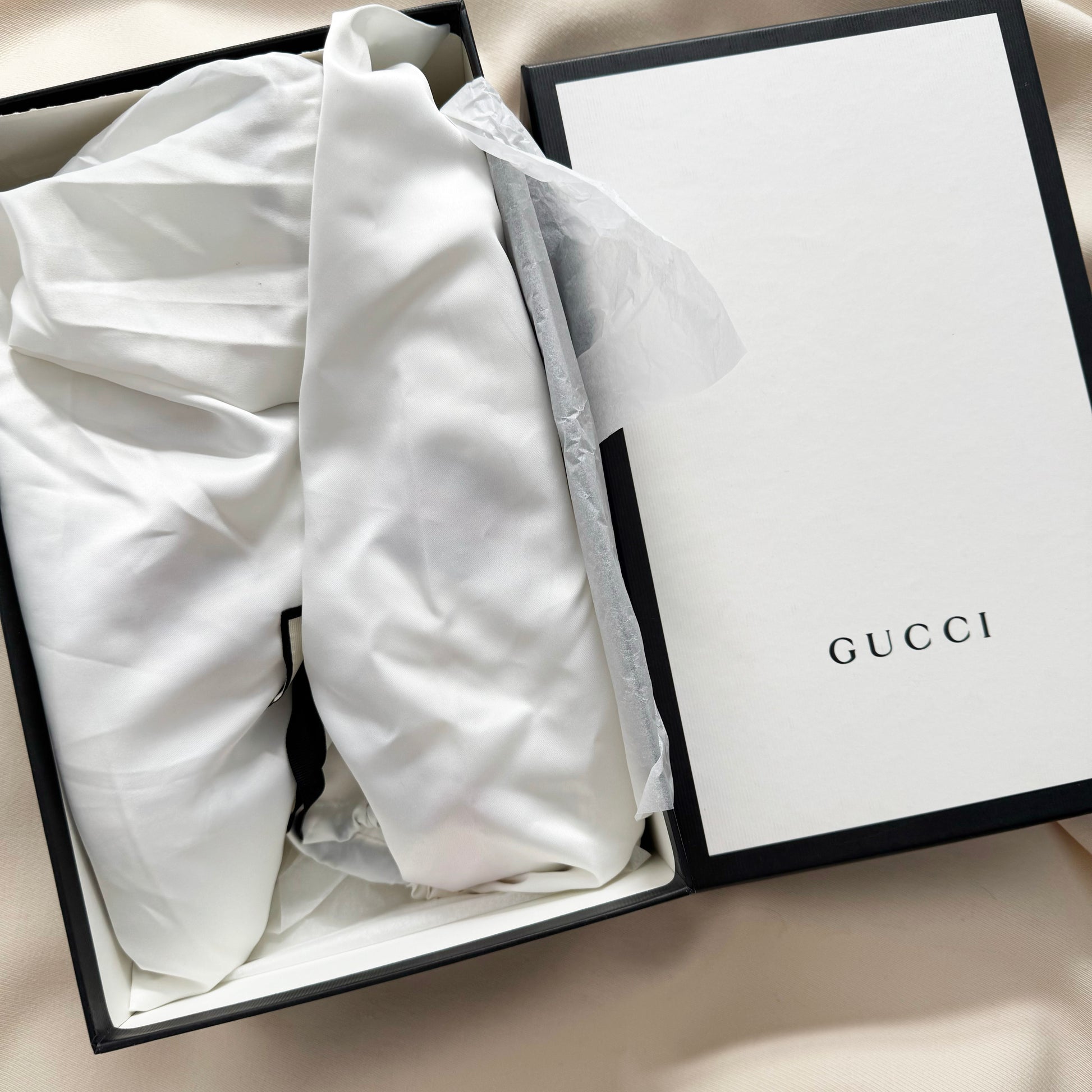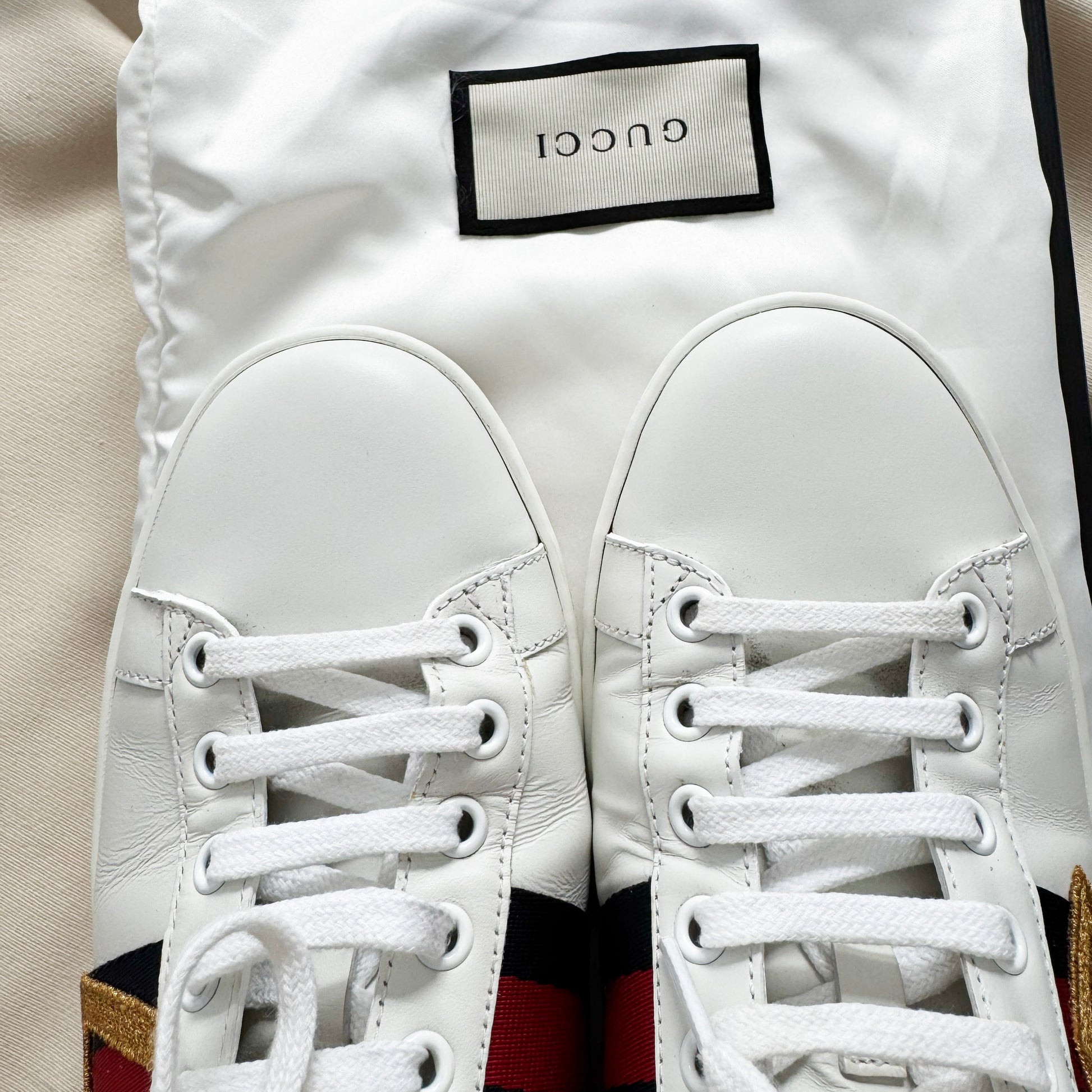 Gucci "Ace" Loved Sneakers in White, size 38 (Fits roomy, like an 8.5). An iconic sneaker from an iconic era in the company's history! A playful take on a clean white sneaker from the Alessandro Michele era - his unique brand of rebellious-vintage preppy is basically the designer version of The Royal Tenenbaum's incarnate. If they're your can't live without everyday go-to sneaks it's nice to be able to pick them up secondhand in such good condition. In excellent condition - worn only a few times the wear is really only visible on the sole and some very light creasing on the upper. Comes with original box and dustbags. Originally retailed for $800CAD, but thanks to runaway inflation over the last few years, this season's versions retail for over $1200CAD