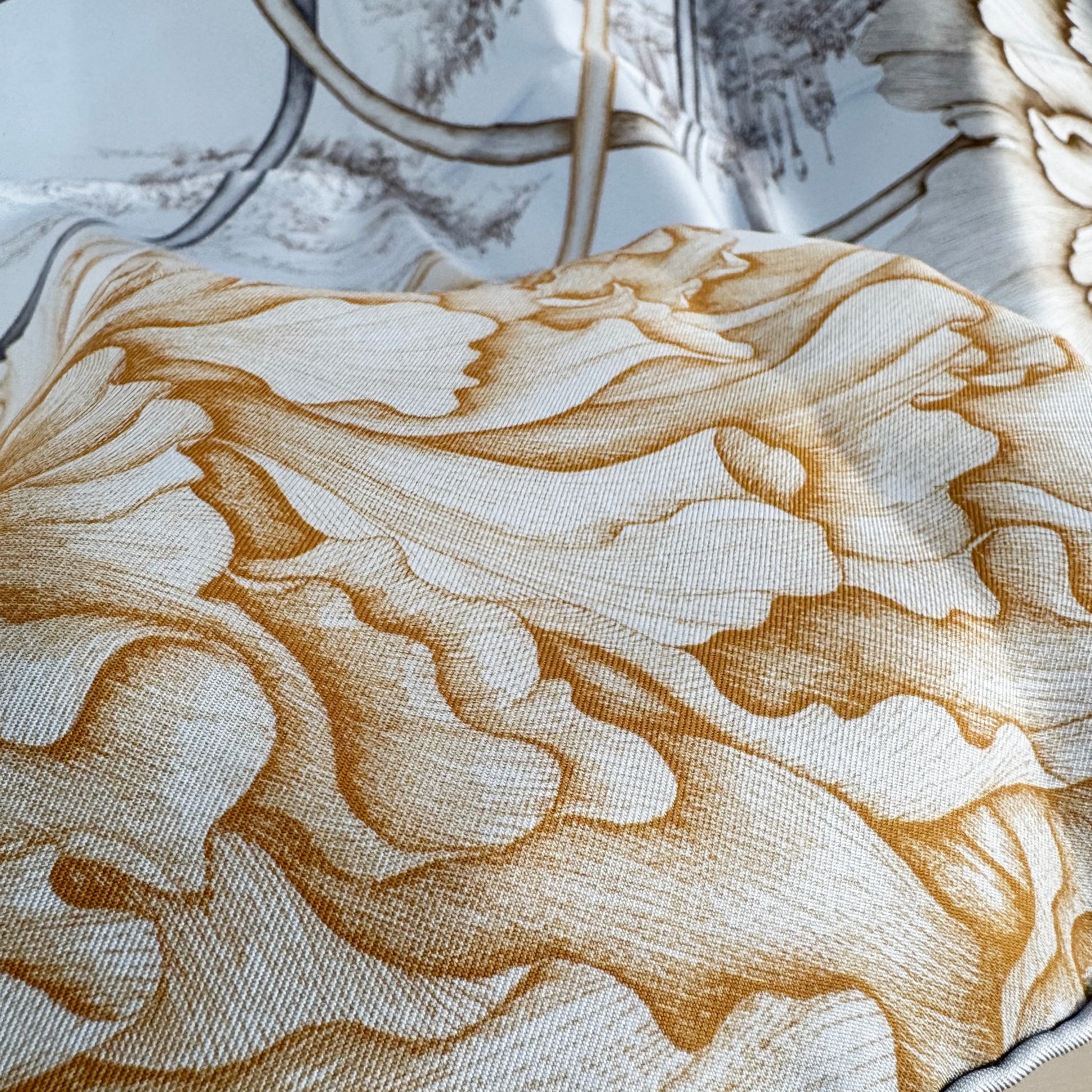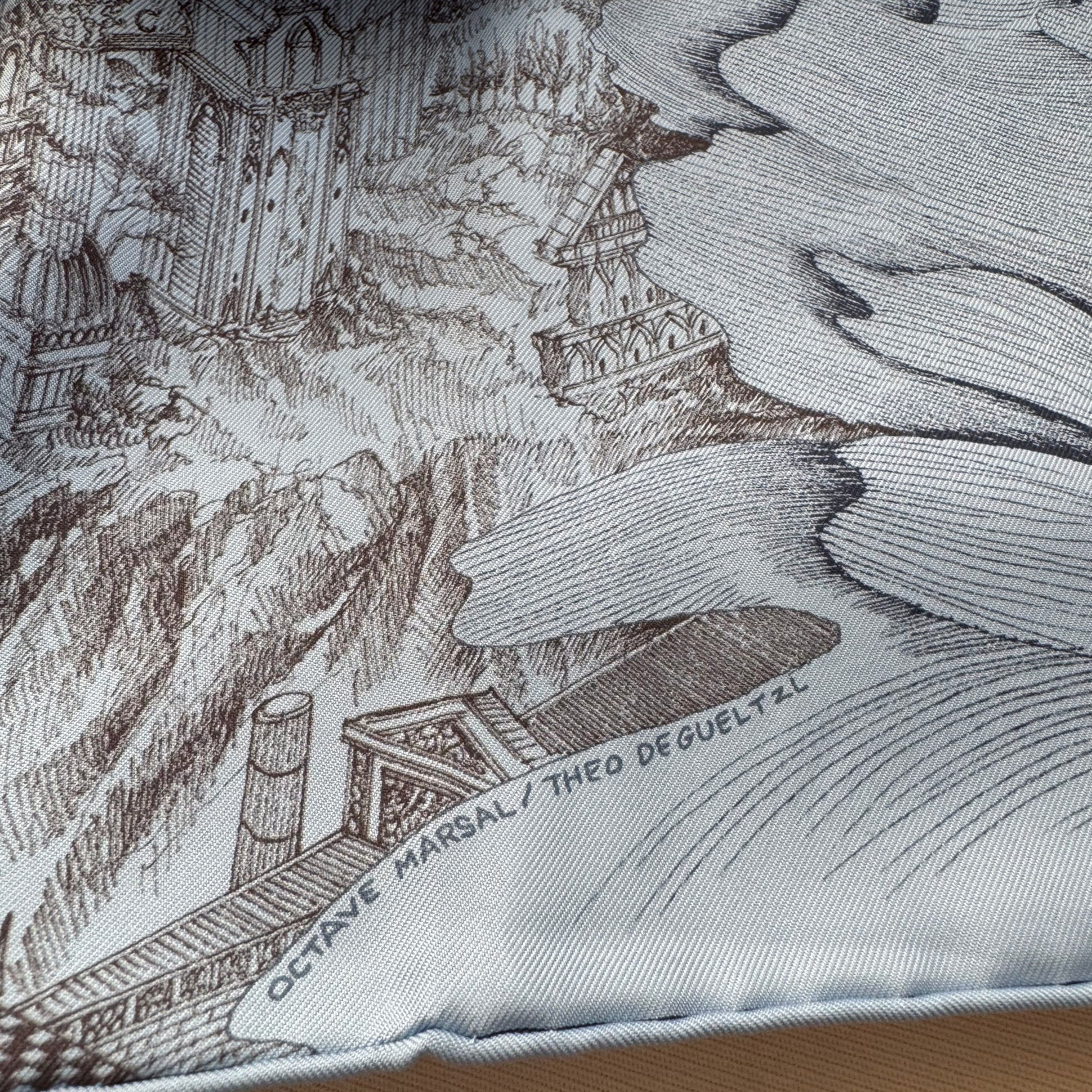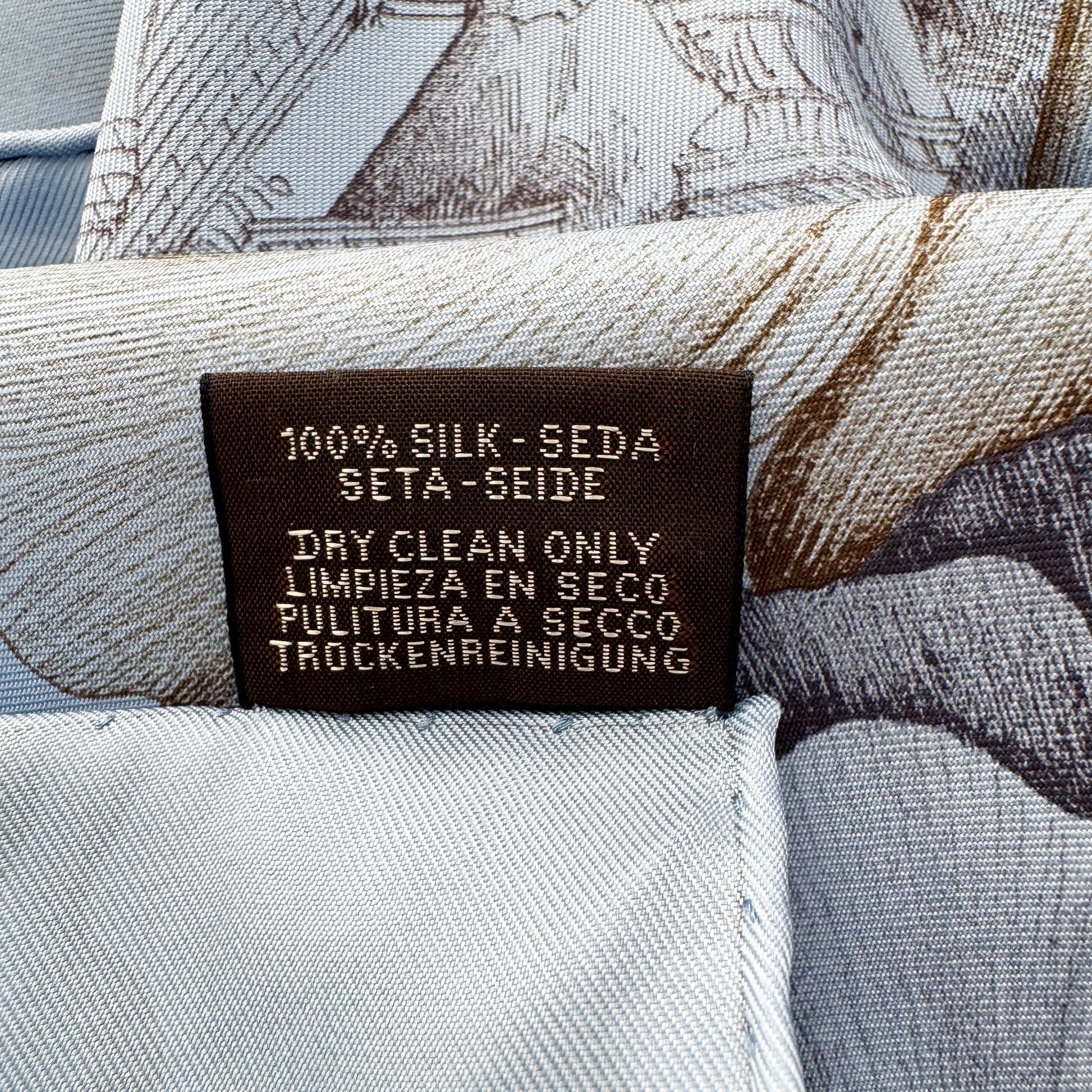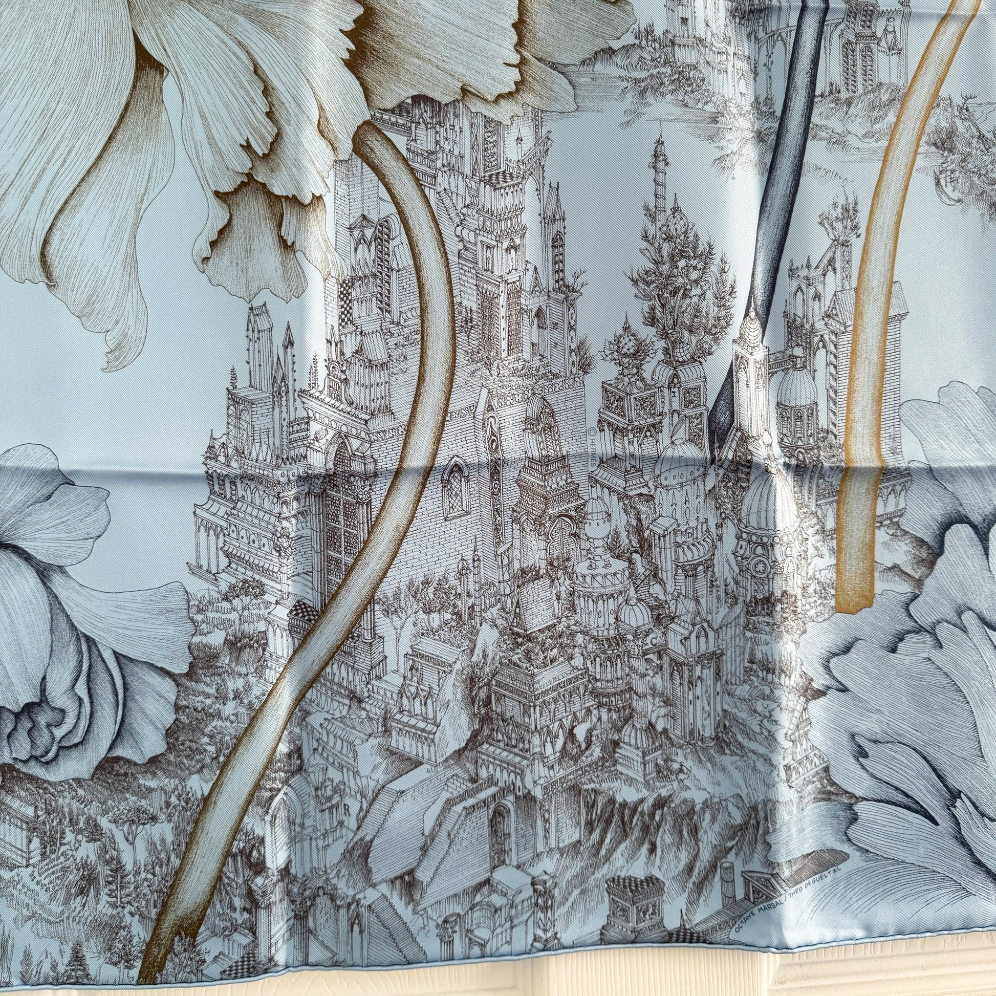 Hermes "A L’Ombre des Pivoines" 90cm Silk Scarf in Blue. The title of the scarf translates to "In The Shadow of Peonies" in English, this stunning scarf shows a city in the shadow of giant peony flowers, done in absolutely breathtaking detail. Giant peonies, fragile though powerful, rise from a proliferation of architectural forms in this poetic play on scale, blooming over an imaginary city. Artists Octave Marsal and Theo de Gueltzl show a city filled with details of beautiful palaces and vast residences, even more incredible because this design can be viewed from all angles as if it was not designed with an intended up or down. A dream for a girl with blue eyes I should imagine - this lovely shade manages to be both soft and bright at the same time. It's hard to describe but it's heavenly. 100% silk. In excellent condition - no signs of wear - like new. Does not come with the original box though. Originally $750CAD, and selling here for $485CAD!