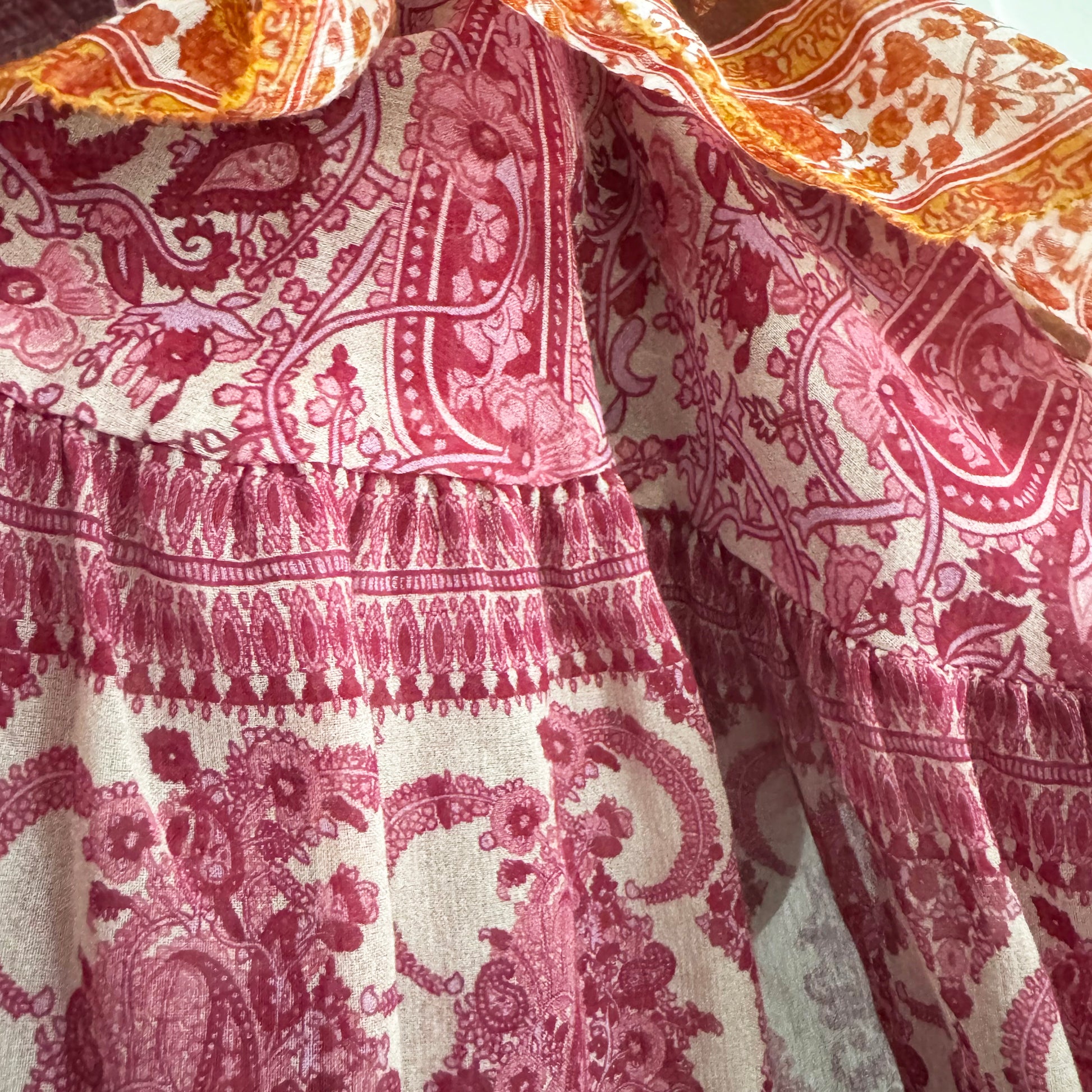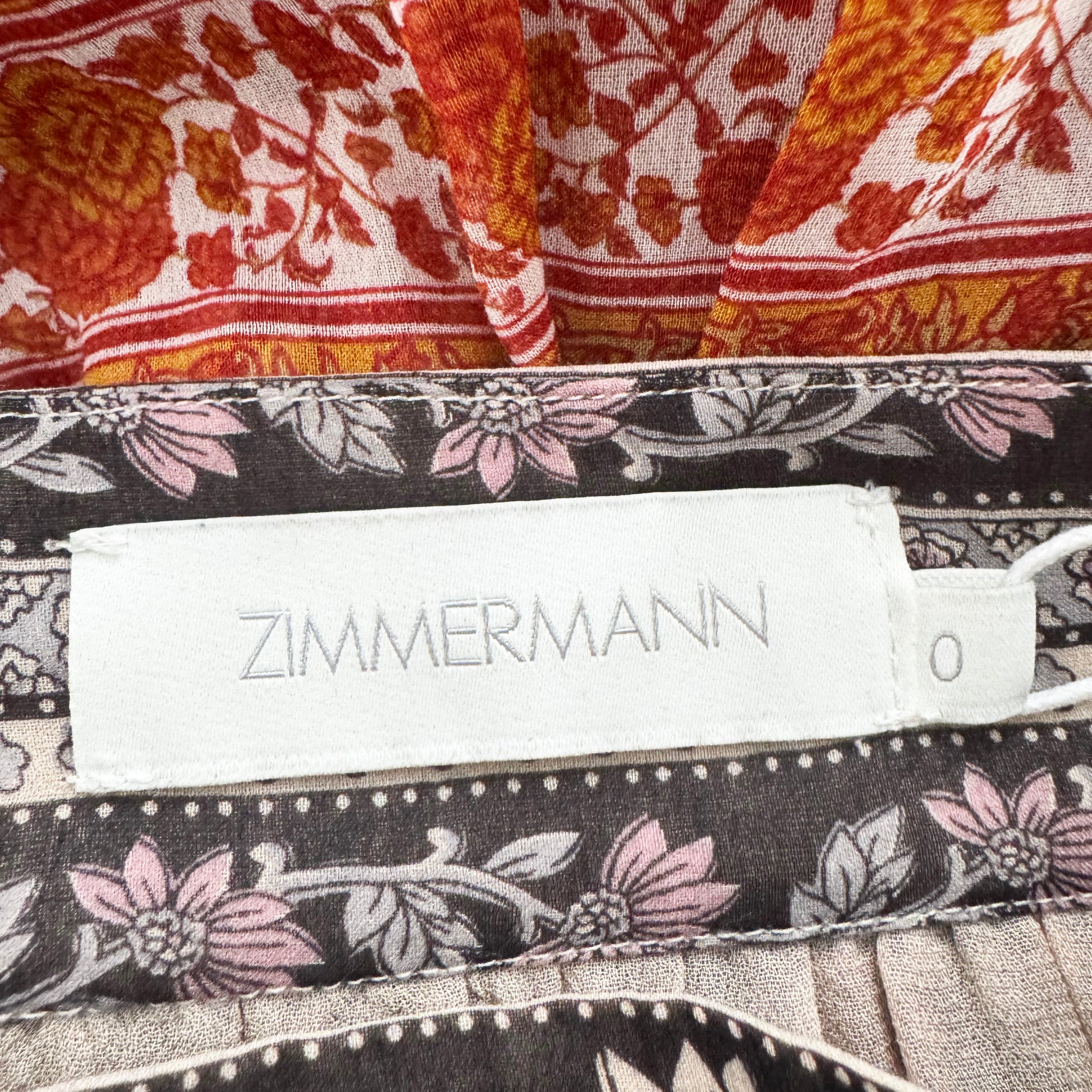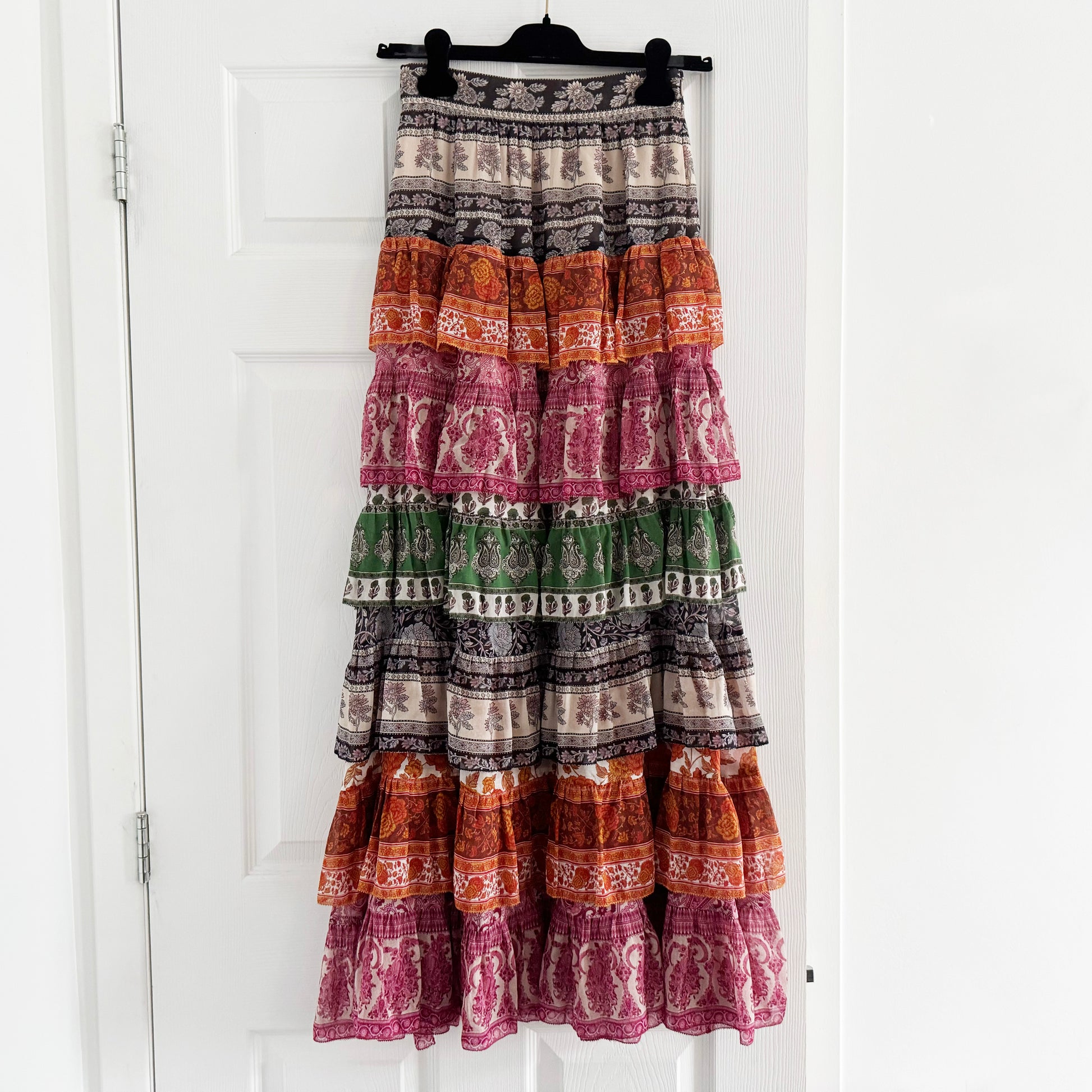 Zimmermann "Amari" Skirt, size "0" (fits like XXS/XS). Brand new with tags! Quite possibly the most beautiful fabric from Zimmermann's entire archive of beautiful fabrics - this one really gets me! The colours are both vibrant, and soft. The cut is so feminine, but not girly - just so sexy, in that Latin kind of way. Pair with a cropped top and flats or high heels (depending on the occasion). I love this for a celebratory moment - whether that's a nice lunch and an afternoon of shopping on vacay, a dinner in the city or an event, like a wedding maybe? It goes anywhere you want to look amazing! 25 inches actual waistband. 42 inches in total length. 76% Cotton, 24% Silk. Originally $948CAD, and selling here for $225CAD!!!