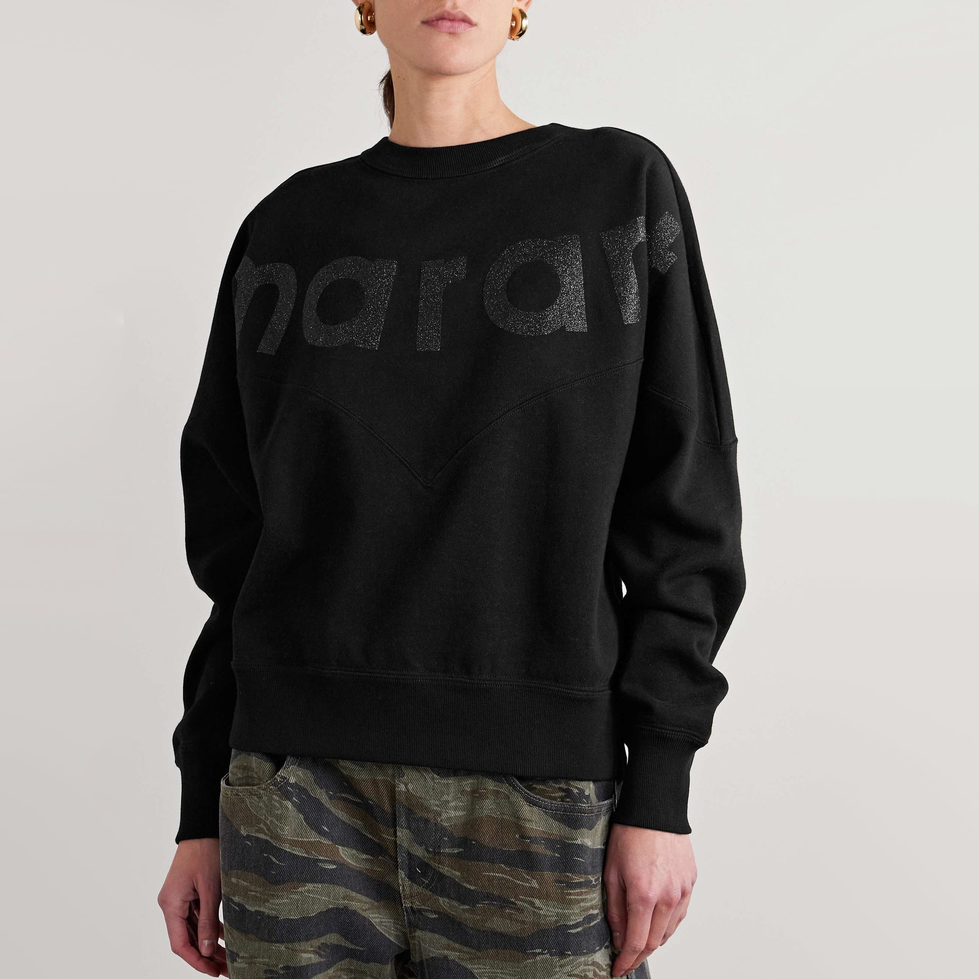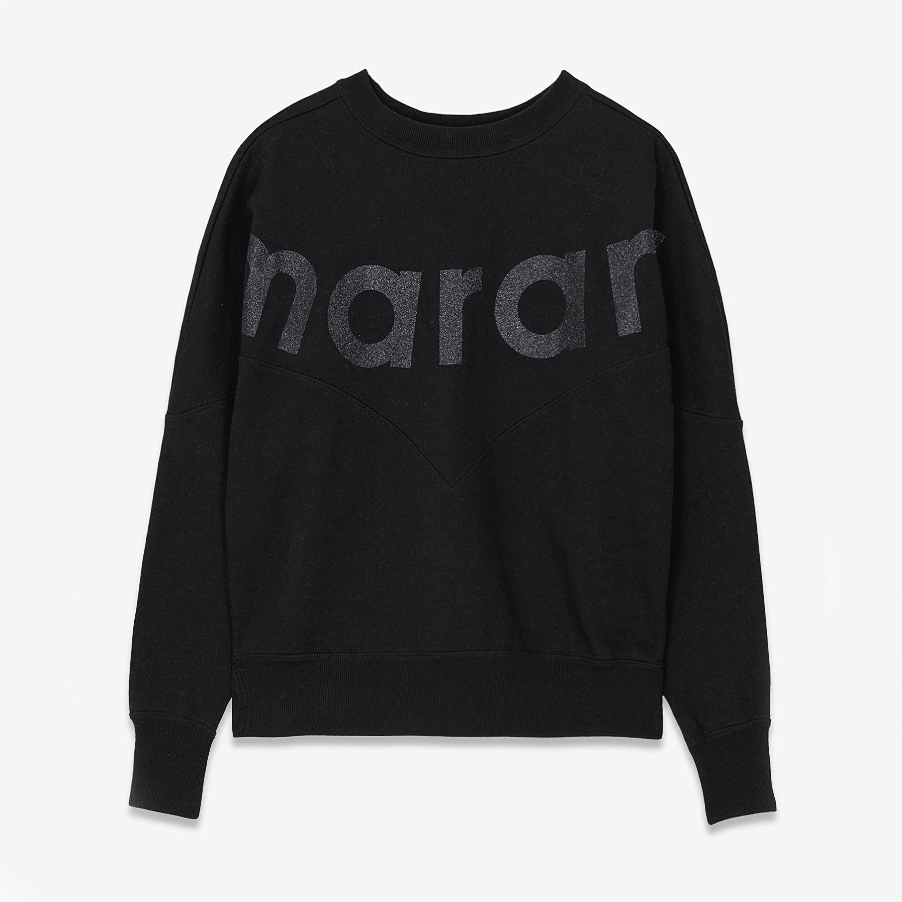 Isabel Marant Etoile "Houston" Sweatshirt in Black, size 40. Fits like a 6/8 ish. The humble sweatshirt, elevated to a different category under this iconic French designer's care. Easier to care for than a knit, but just as comfy! These are the cozy weather staples that a modern wardrobe relies on, and they're done so that they are a little more special, so that they don't feel out of place kicking around with a nice denim or cargo pant. This version features her logo, but done in letters with a little sparkle. Very fun for the season! 25 inches in length. The design makes it hard to give an underarm to underarm measurement exactly, but the fit tapers to 21.5 inches flat at the ribbed waistband (unstretched). 88% cotton, 12% polyester. Only worn a few times and in excellent condition. Originally $560CAD, and selling here for $195CAD!