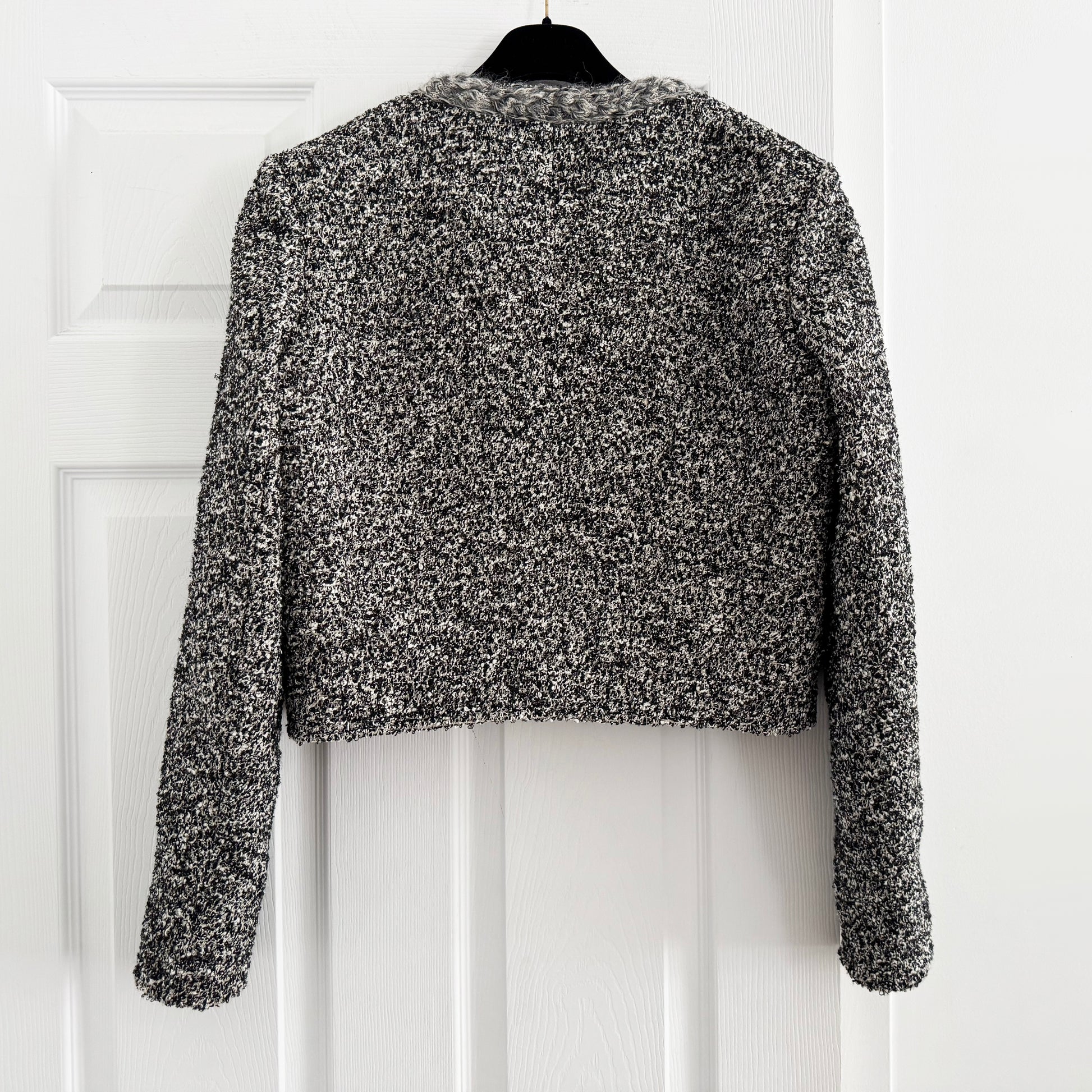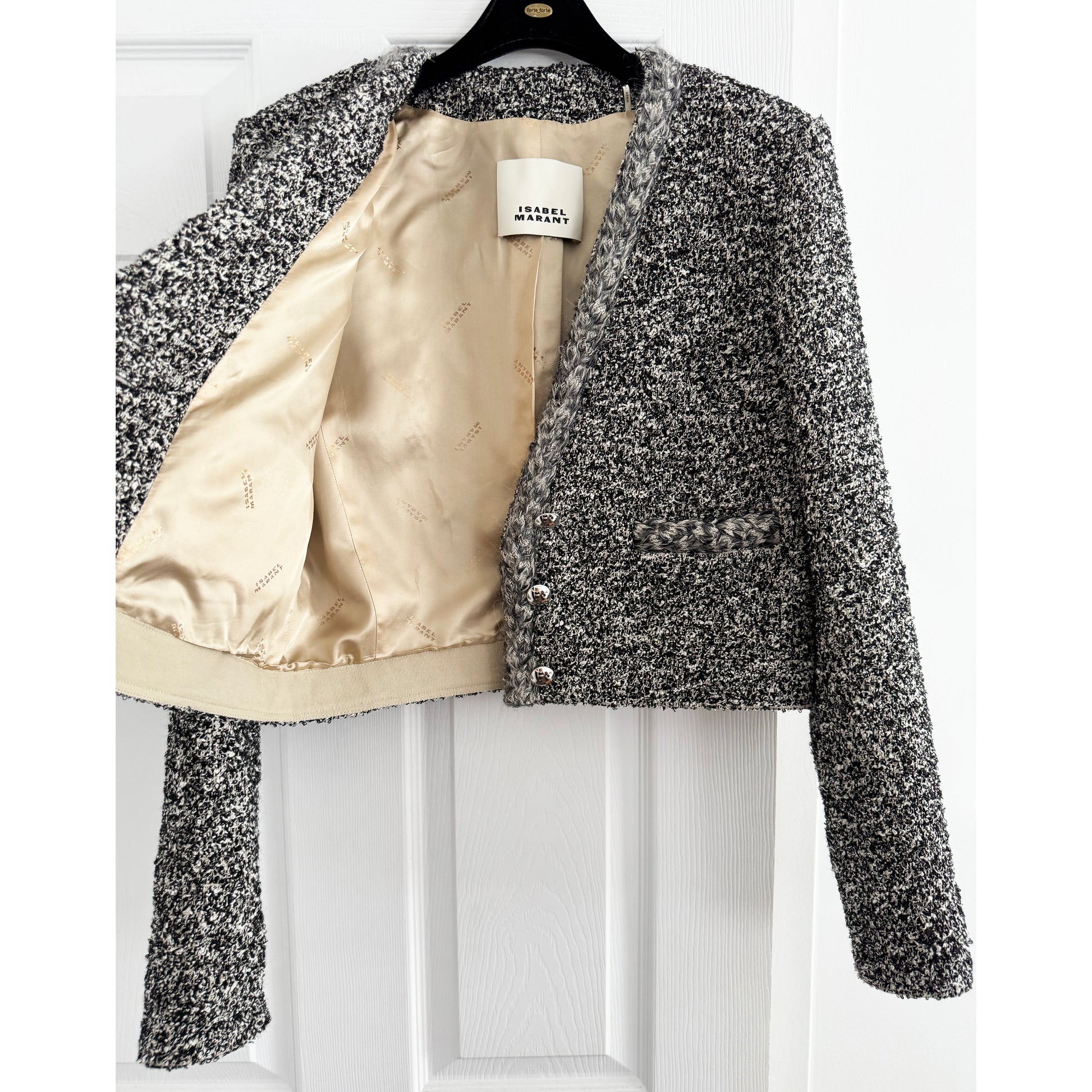Isabel Marant Gwendoline Cropped Tweed Blazer in Grey, size 40. Fits like a size 6 ish. Such a beautiful design - Marant has ALWAYS included her own version of a Chanel jacket in her collection - always slightly different but always amazing! This beauty is done in a cropped silhouette, with a gorgeous contrasting trim detail. It's shown paired with a little mini skirt - but styled with denim feels so perfect to me too. 20 inches in length. 20 inches armpit to armpit. 29% acrylic, 22% polyester, 22% wool, 20% cotton, 7% other fibers. In excellent condition. Originally $1200CAD, and selling here for $445CAD!