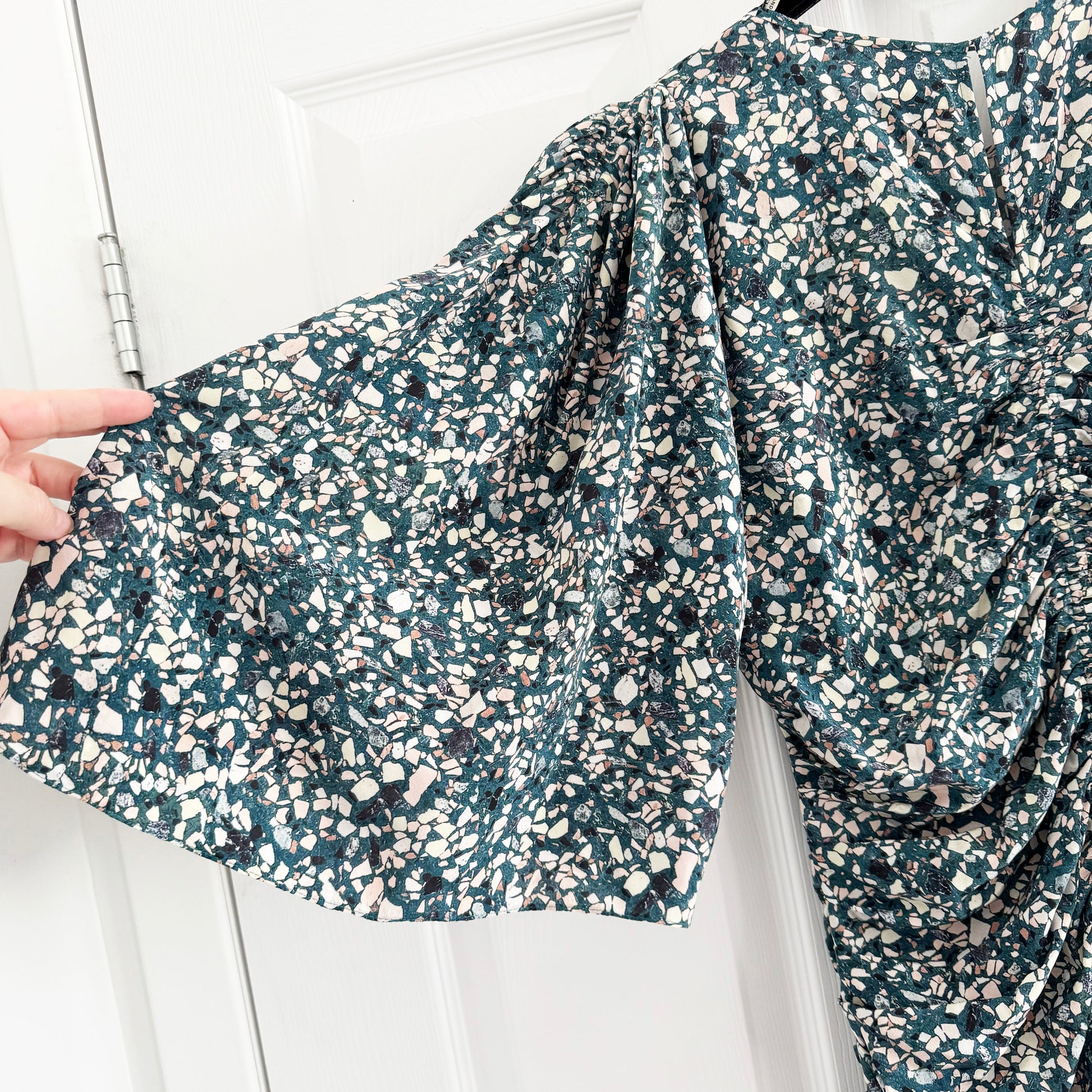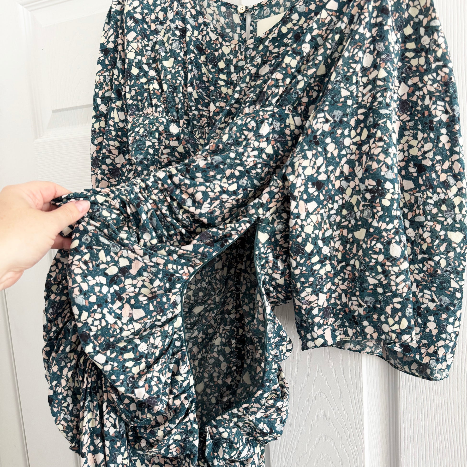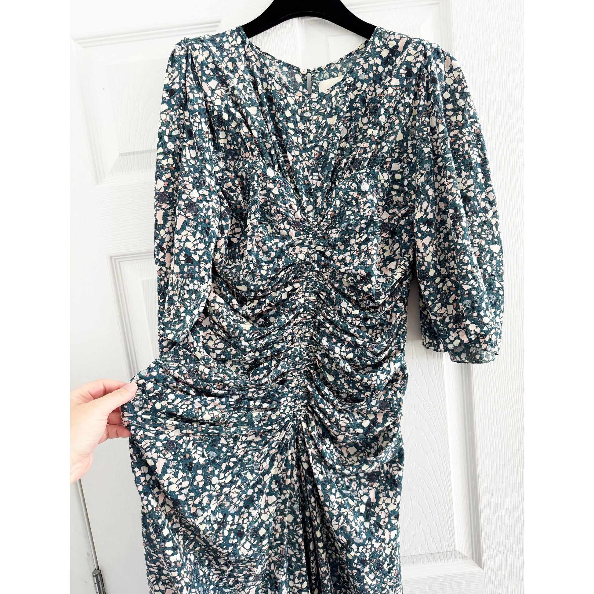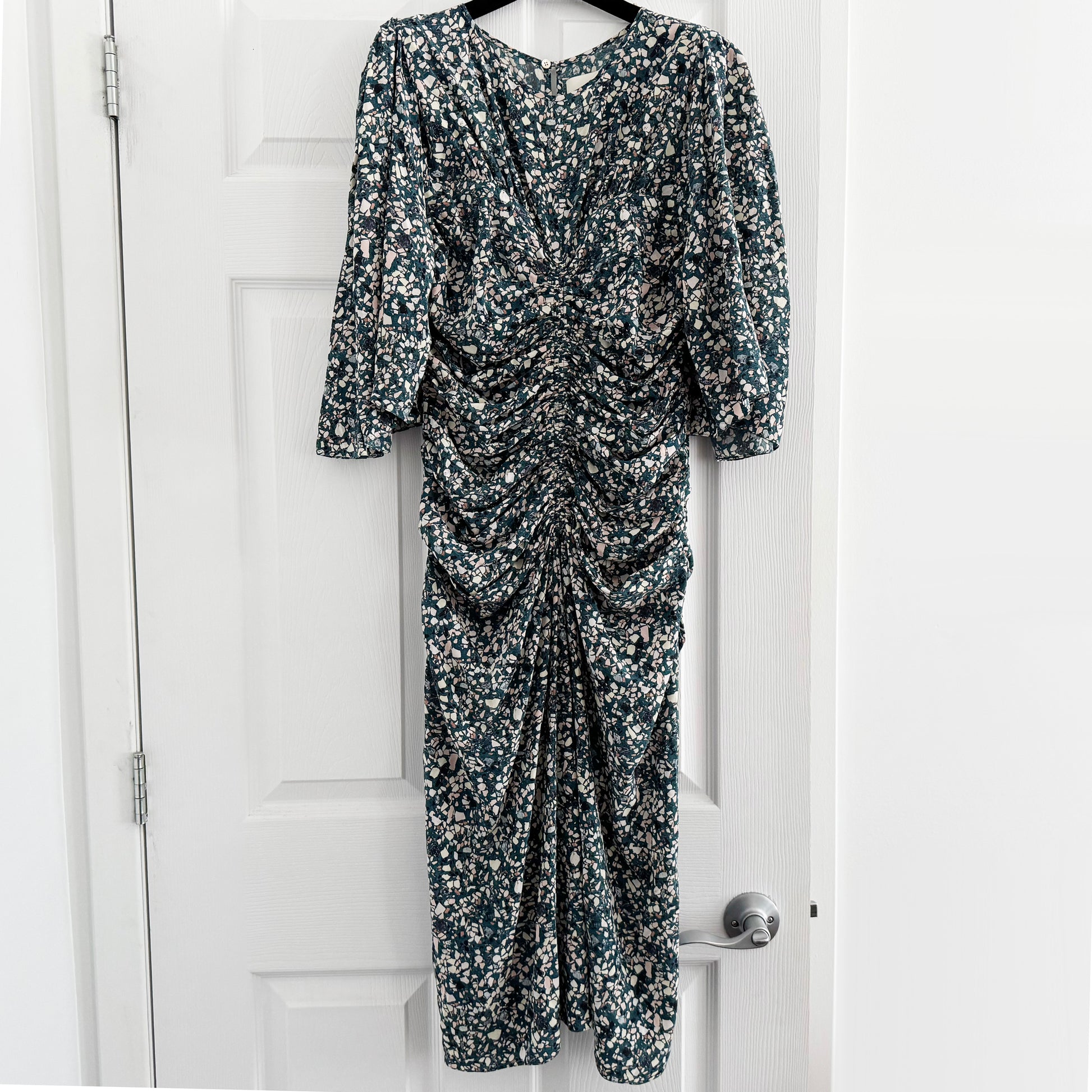 Isabel Marant "Lurner" Dress in Green, size 40. Fits like size 6. It's always about the beautiful fabrics with Isabel's mainline collection - and this is such a great example - what a beautiful print! It works for when you need a dress that's not black, not white, not too bright, it has sleeves, and where you can ALSO wear a bra!! It's a rare one, even though you wouldn't think so necessarily. The waist measures 31-32 inch waistband. 45 inches in length. 19 inches armpit to armpit. 20 inches flat at the hips. 91% silk, 9% elastane. In excellent condition. Originally $1600CAD, and selling here for $395CAD!