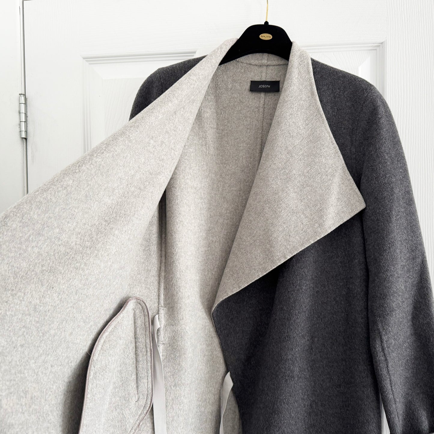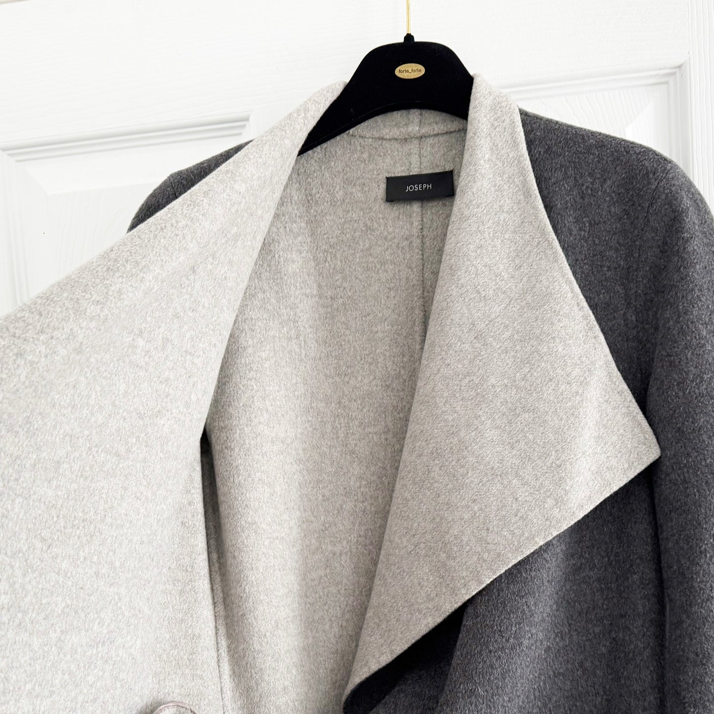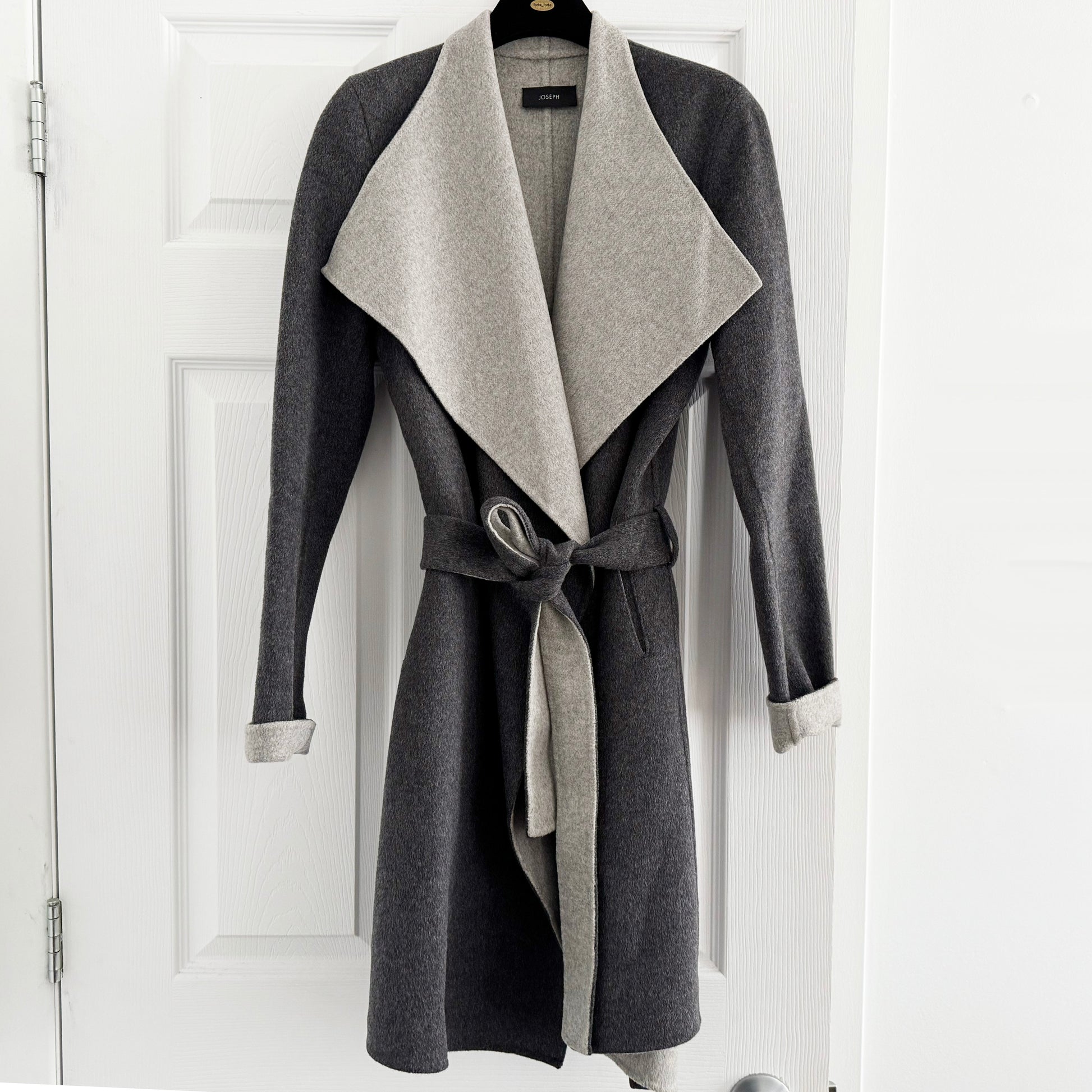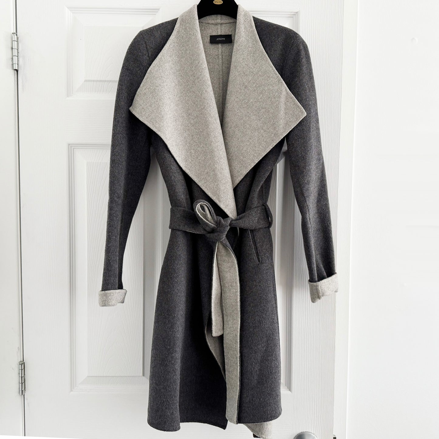 Joseph Grey Doubleface "Lisa Long" Coat, size 34. Fits like a size 2. Such a luxurious coat, lightweight but warm and cozy - great for travelling, and great for everyday life in the city. This coat is a staple in the collection every season for very good reason!! This version features a gorgeous contrasting grey colour palette. 60% wool, 40% cashmere. In excellent condition. Originally $1400CAD, and selling here for $235CAD!