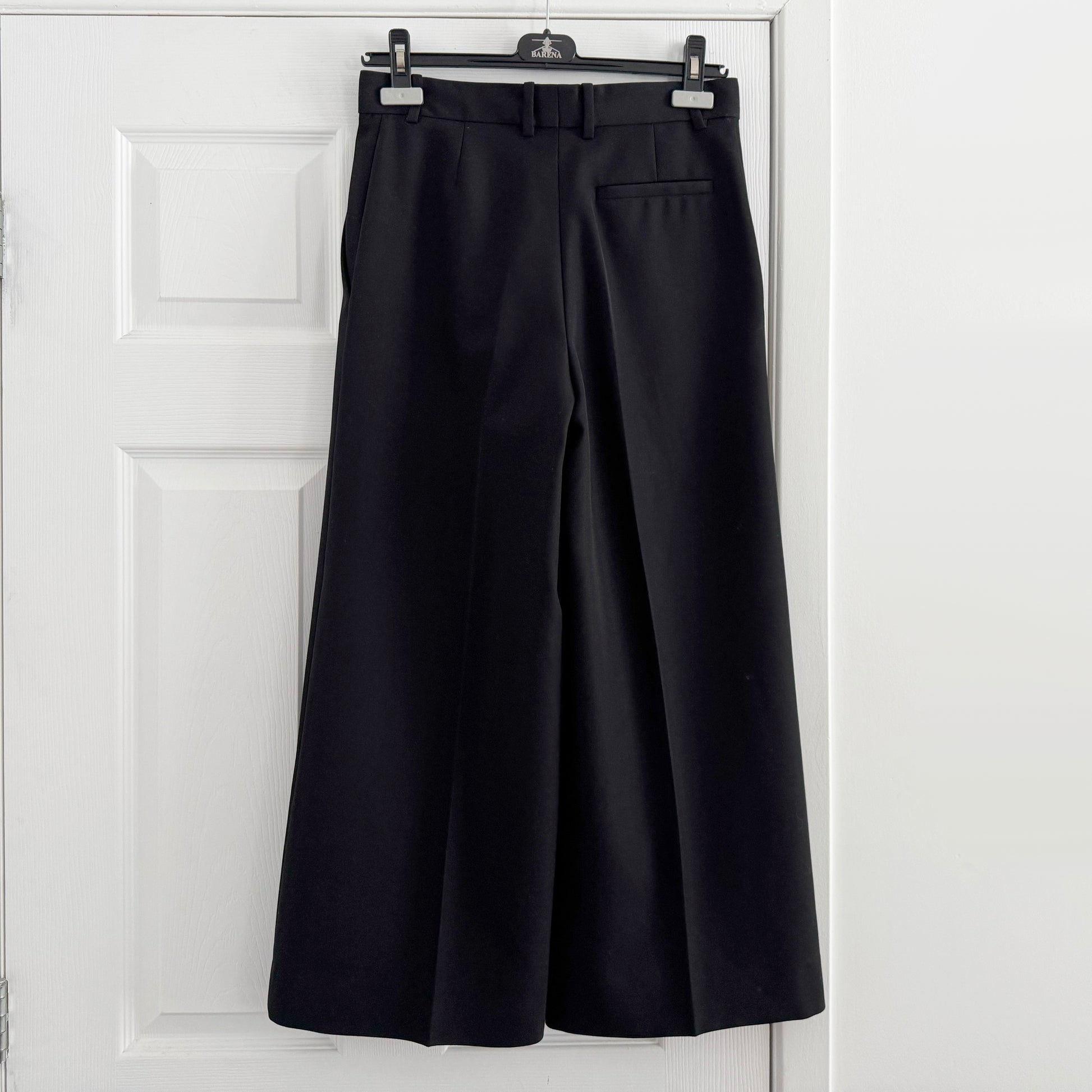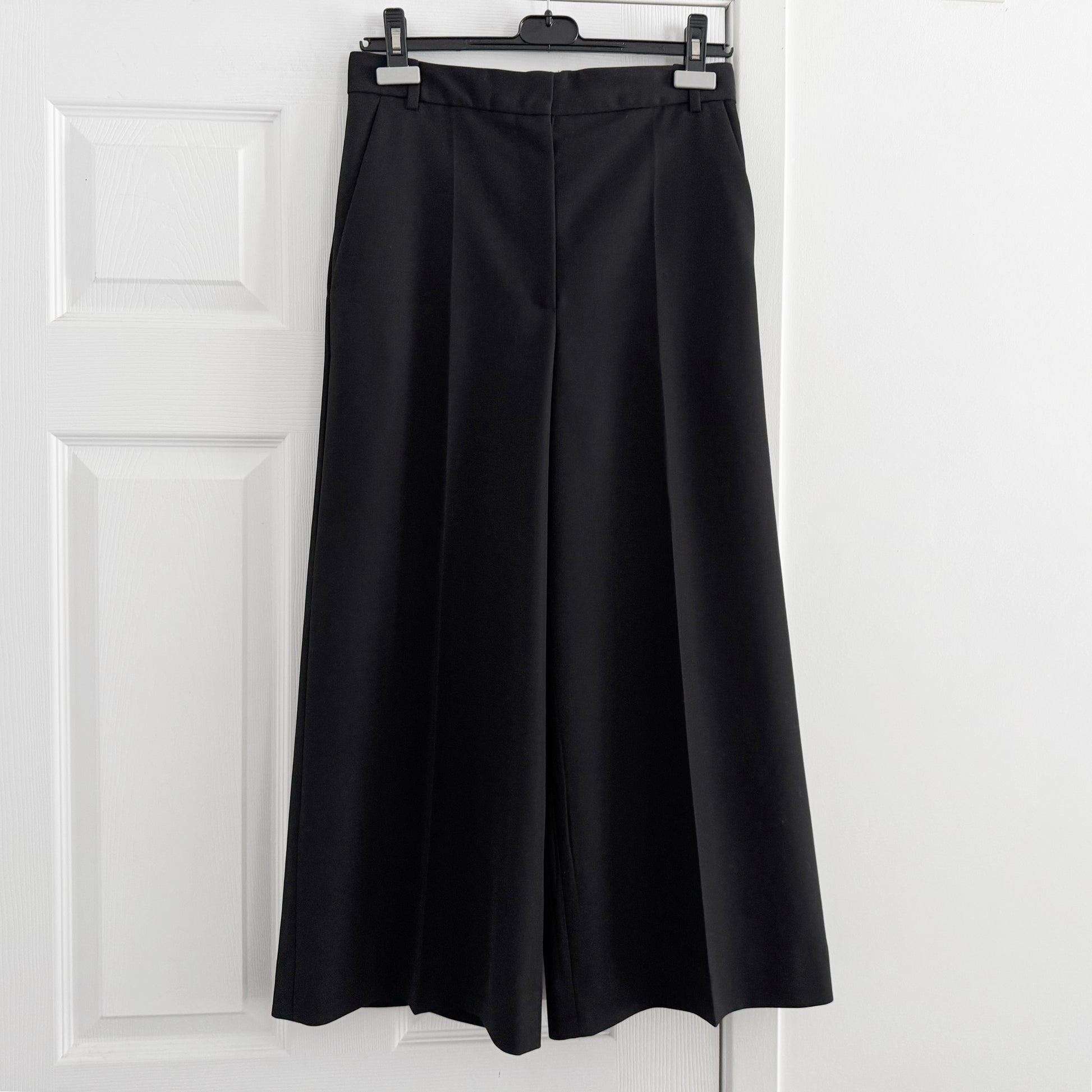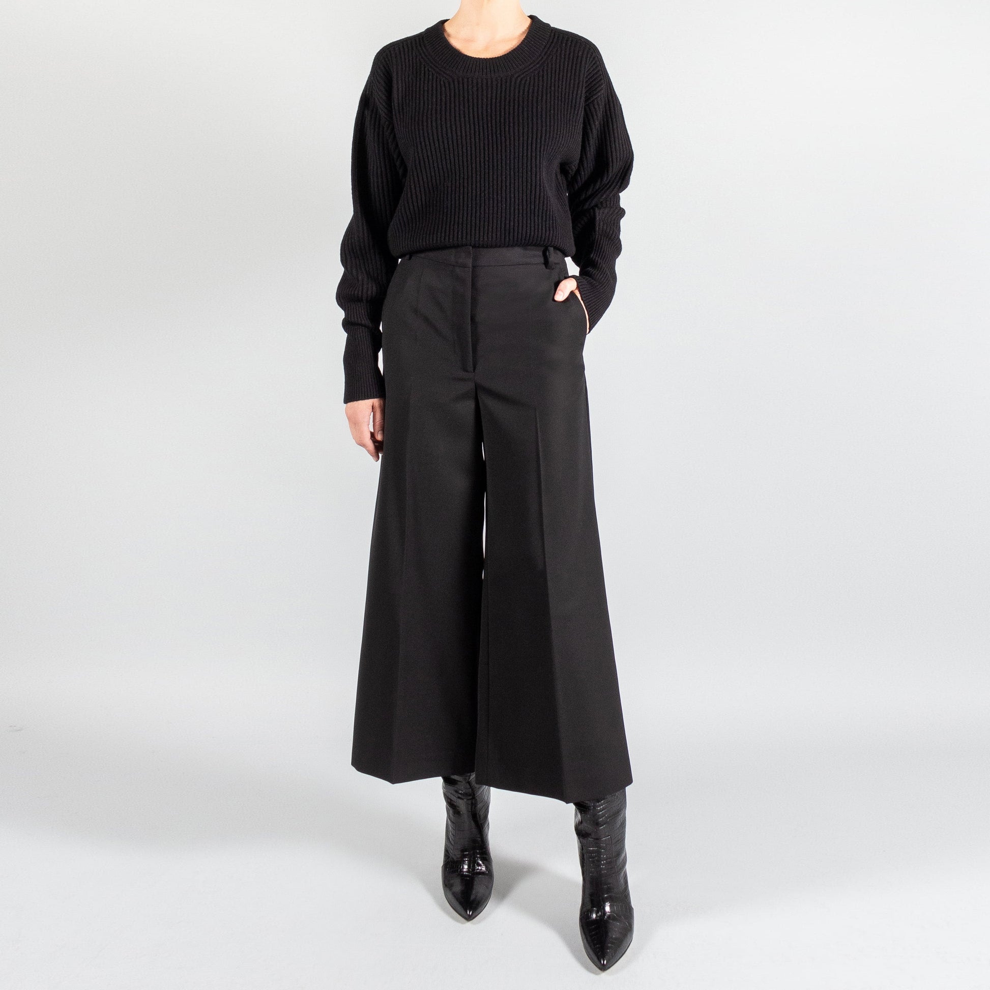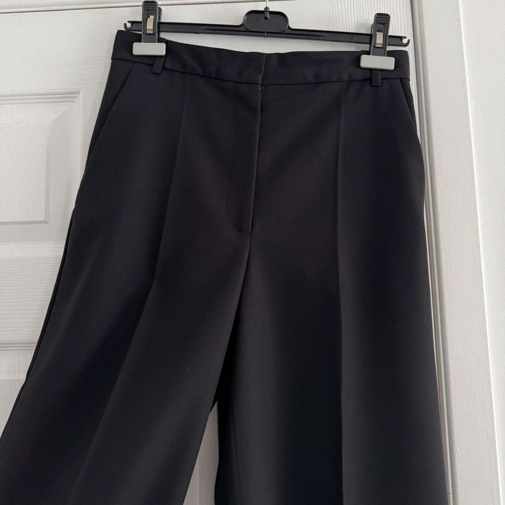 Joseph "Travis" Wool Granite Trousers in Black, size 36. Fits like a size 2. A contemporary take on a culotte, these feminine wide-leg trousers are constructed from a versatile mid-weight virgin wool blend. High-waisted, this essential wardrobe essential features a front pleat designed to elongate the silhouette and can be worn with both flats and heels alike. For the girls who measure their clothes: 12.5 inch rise. 24.5 inch inseam. 36 inches in total length, from waist to hem. 15 inches flat across at the waistband. 55% Polyester 45% Virgin Wool. Worn a few times and in very good condition. Originally over $700CAD, and selling here for $275CAD!