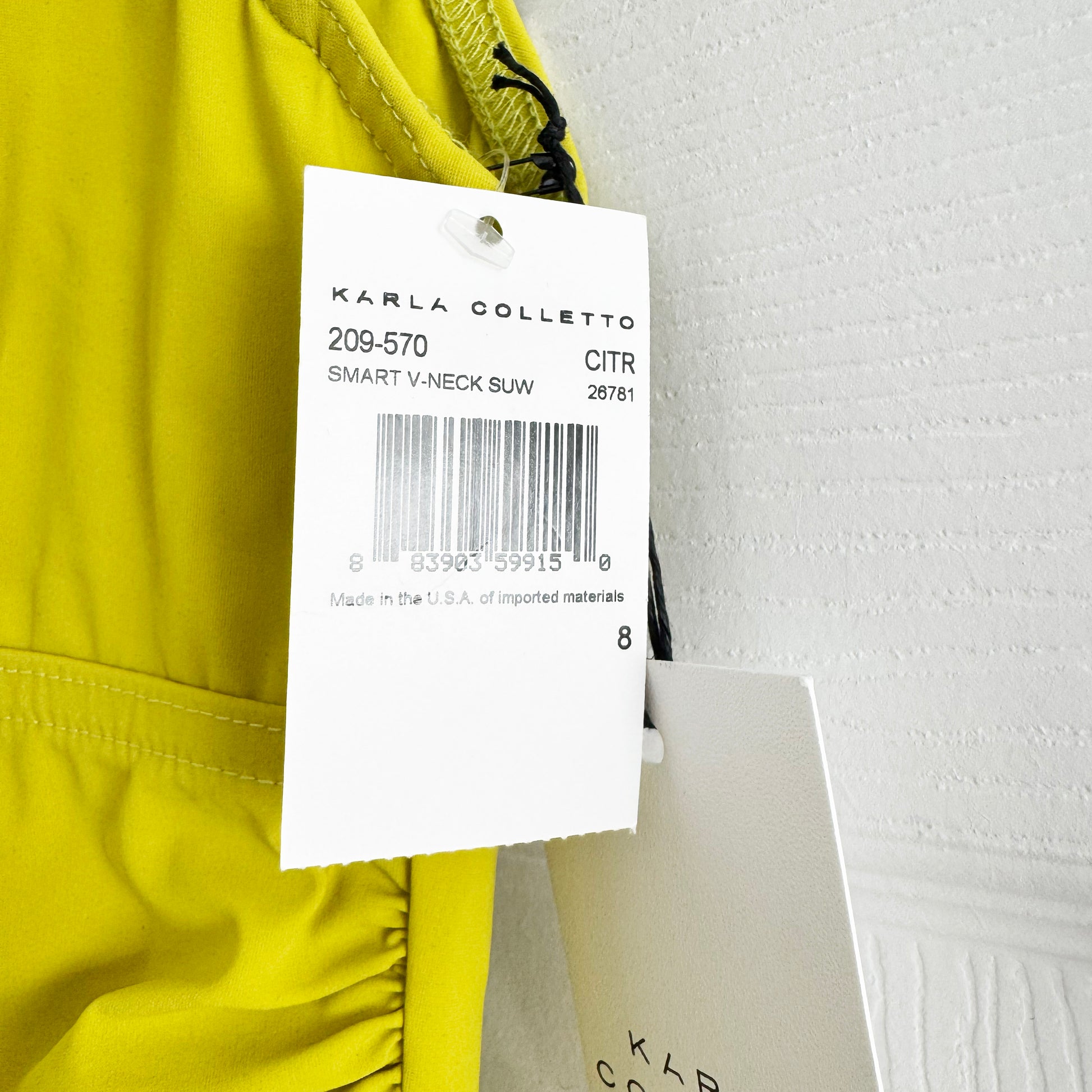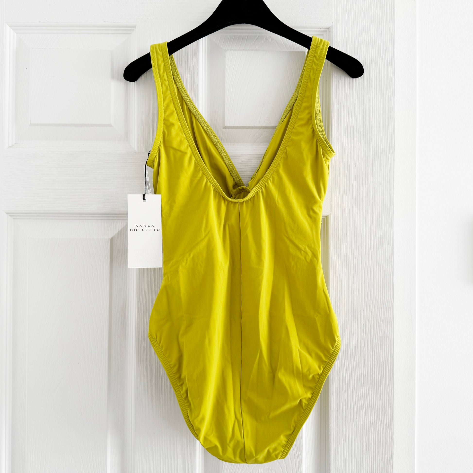 Karla Colletto V-neck One Piece Swimsuit in Citrus, size 8UK. Fits a slim size small. Brand new with tags! Karla Colletto’s swimwear is cut from the finest fabrics using innovative manufacturing techniques and tailoring expertise. This new iteration of the Smart swimsuit has a deep V-neck and a ruched silhouette. 72% polyamide, 28% elastane. Originally over $400CAD