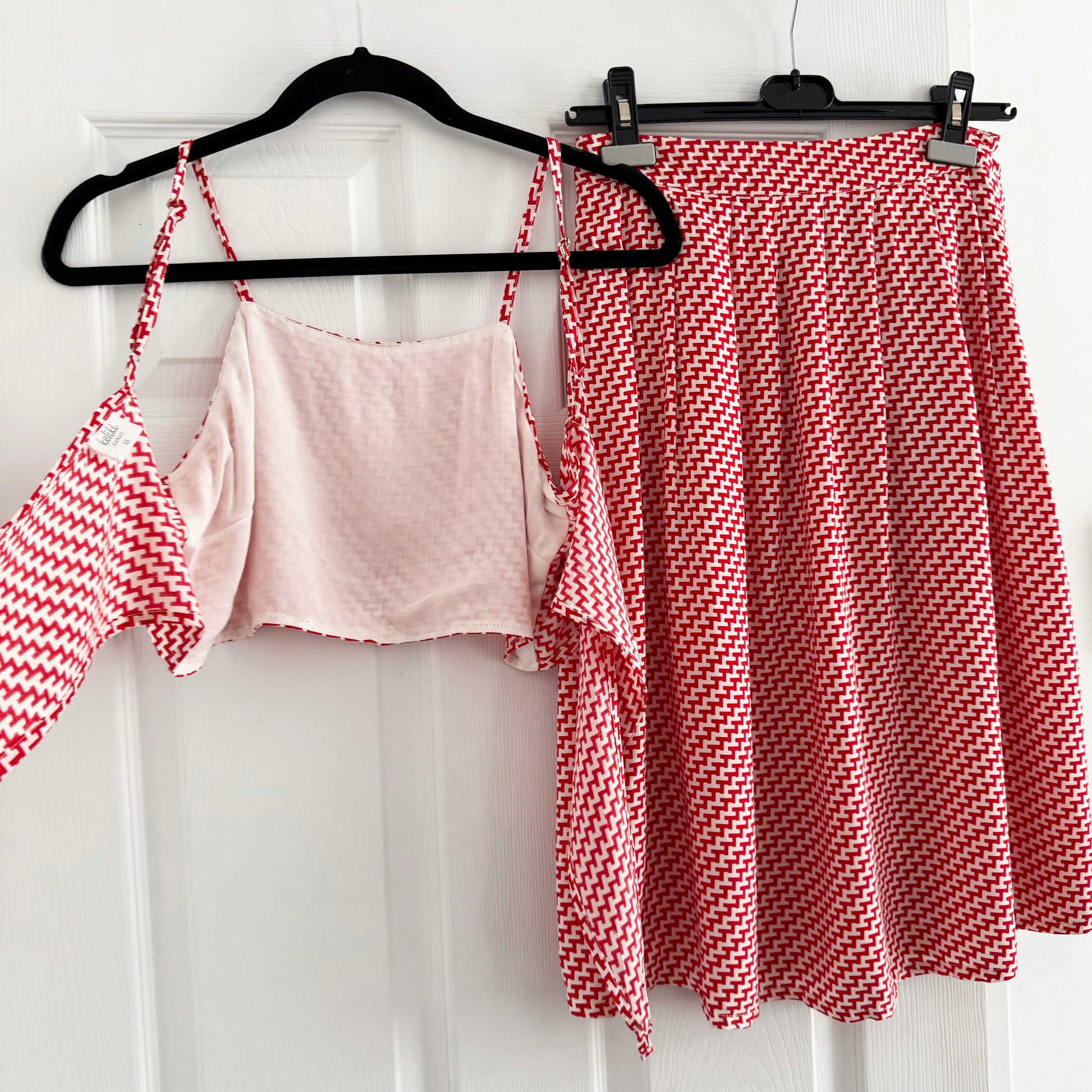 Keliki Hawaii Printed Red Crop Top and Skirt Matching Set, size XS. Fits true to size. Absolutely adorable for warm weather wear! The top has adjustable shoulder straps and a tie back, so has lots of wiggle room to adjust the fit. The skirt is just past the knee on most, and features pleats around the waistband (which gives it a flowy fit - it has lots of movement!), a zip back closure, and pockets. 28 inches waistband. 24 inches in length. 100% rayon. In excellent condition. Originally likely around $150USD for the set, and selling here for $75CAD!
