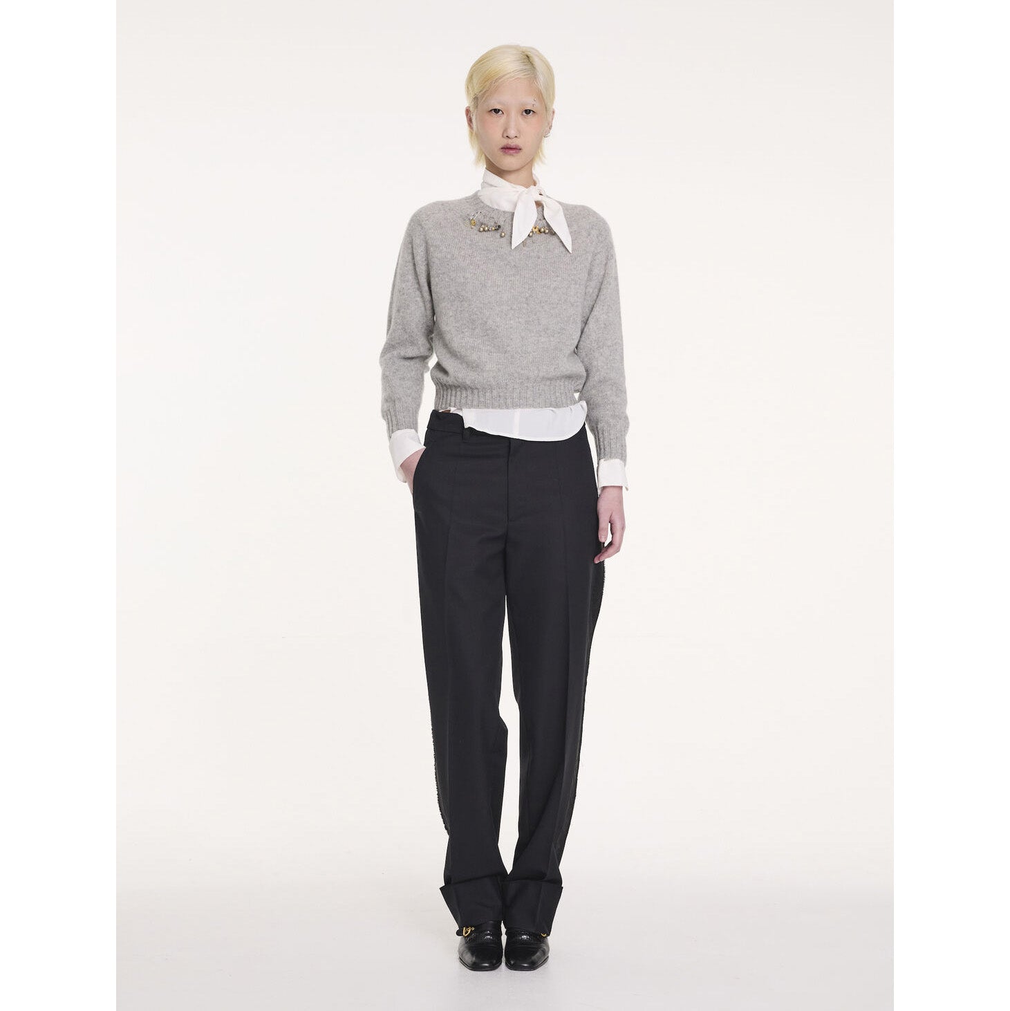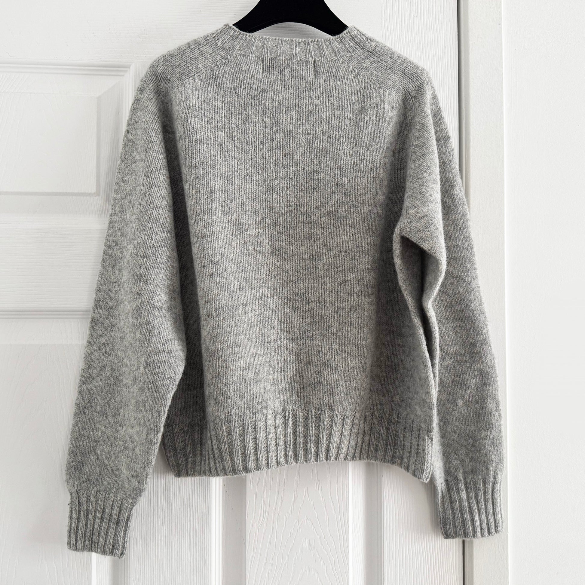 La Fetiche "Clarke" Sweater in Grey, size Medium (fits more like what you'd expect from a Small). A gorgeous classic little cropped knit - perfect for layering, or wearing with skirts and higher waisted pieces. The feel of this reminds me a lot of vintage knits - in a really nice way (shoutout to that made in Scotland knitwear) - but for those that are sensitive to wool, this won't be a piece you'd reach for if you only wear knits next to your bare skin. 100% wool. In excellent condition - but I think this piece DID originally come with some little safety pin jewel decorations at the neckline, and it no longer has them. At the time of writing, it is currently available full price a few places in case you miss this one, or you want it in another size. Originally $685CAD, and selling here for $185CAD!