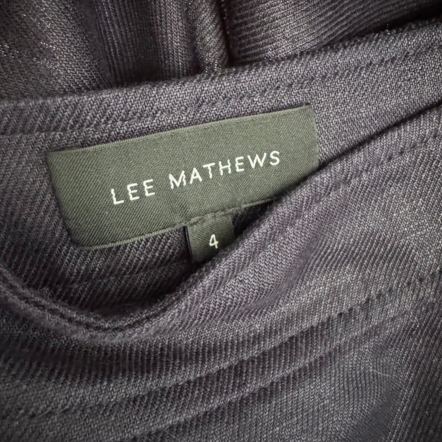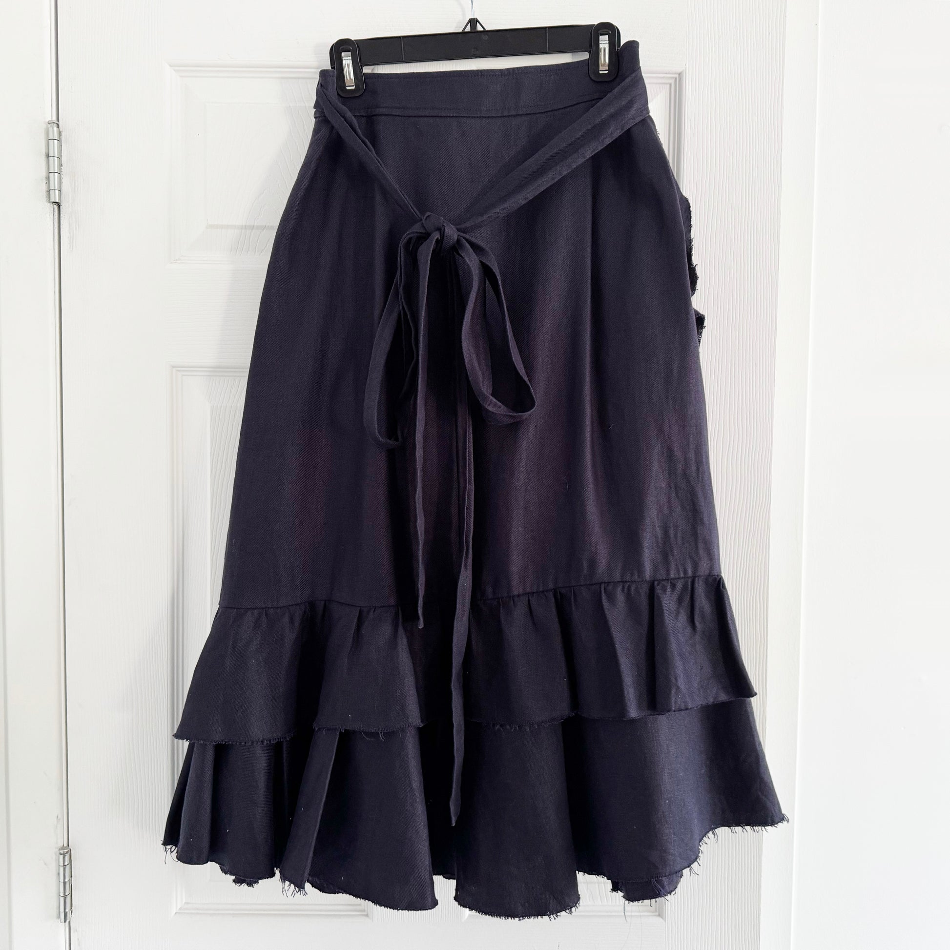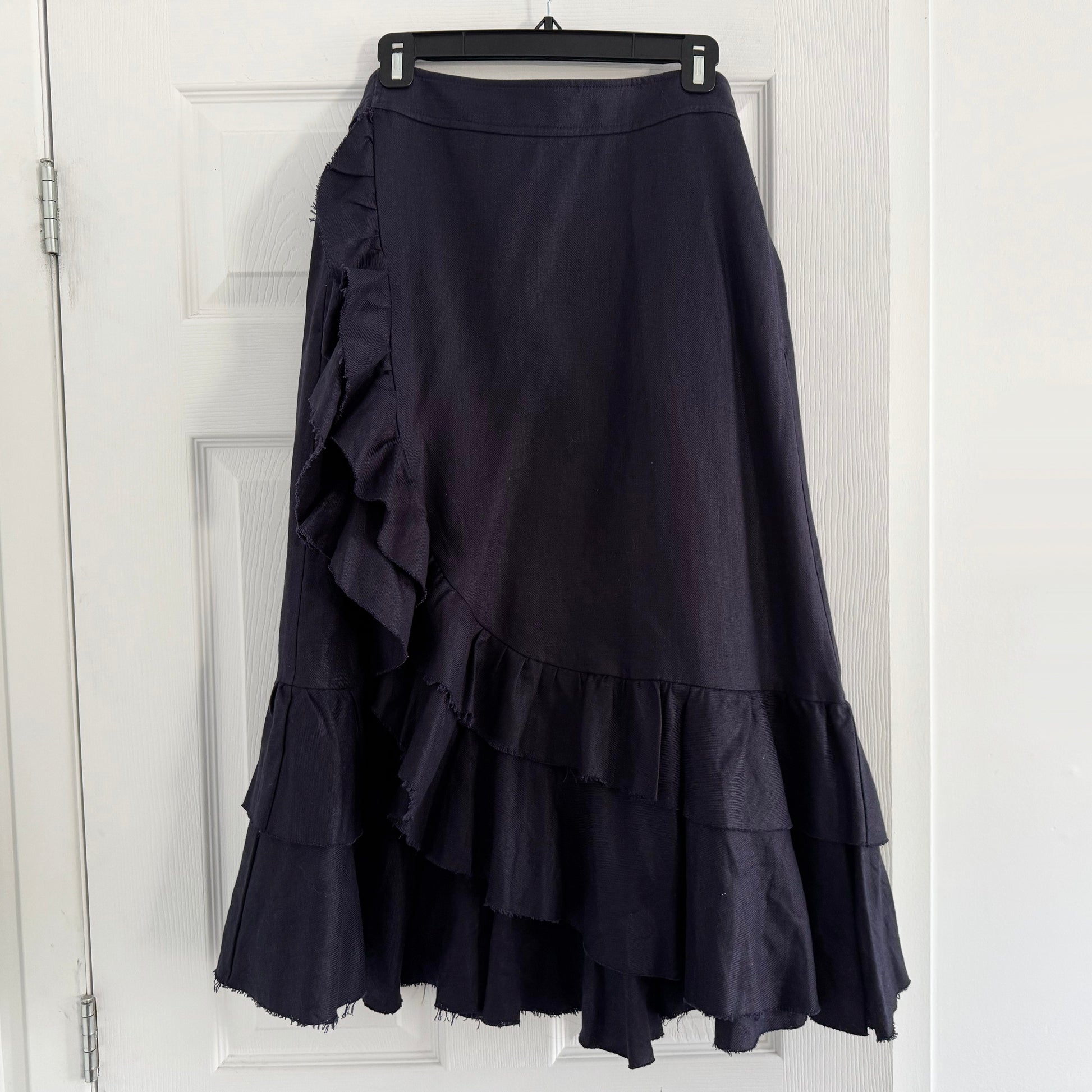 Lee Mathews Linen Wrap Skirt w Ruffle in Navy, size "4" (size L/XL). Insanely beautiful - and so timeless! This piece is done in a sturdy linen twill fabric that drapes beautifully. It's a true wrap skirt - the smallest the waist can go is 32 inches, but can be adjusted upwards to 38 inches maybe? It just crosses over less underneath. 100% linen. In excellent condition. Originally around $800CAD, and selling here for $195CAD