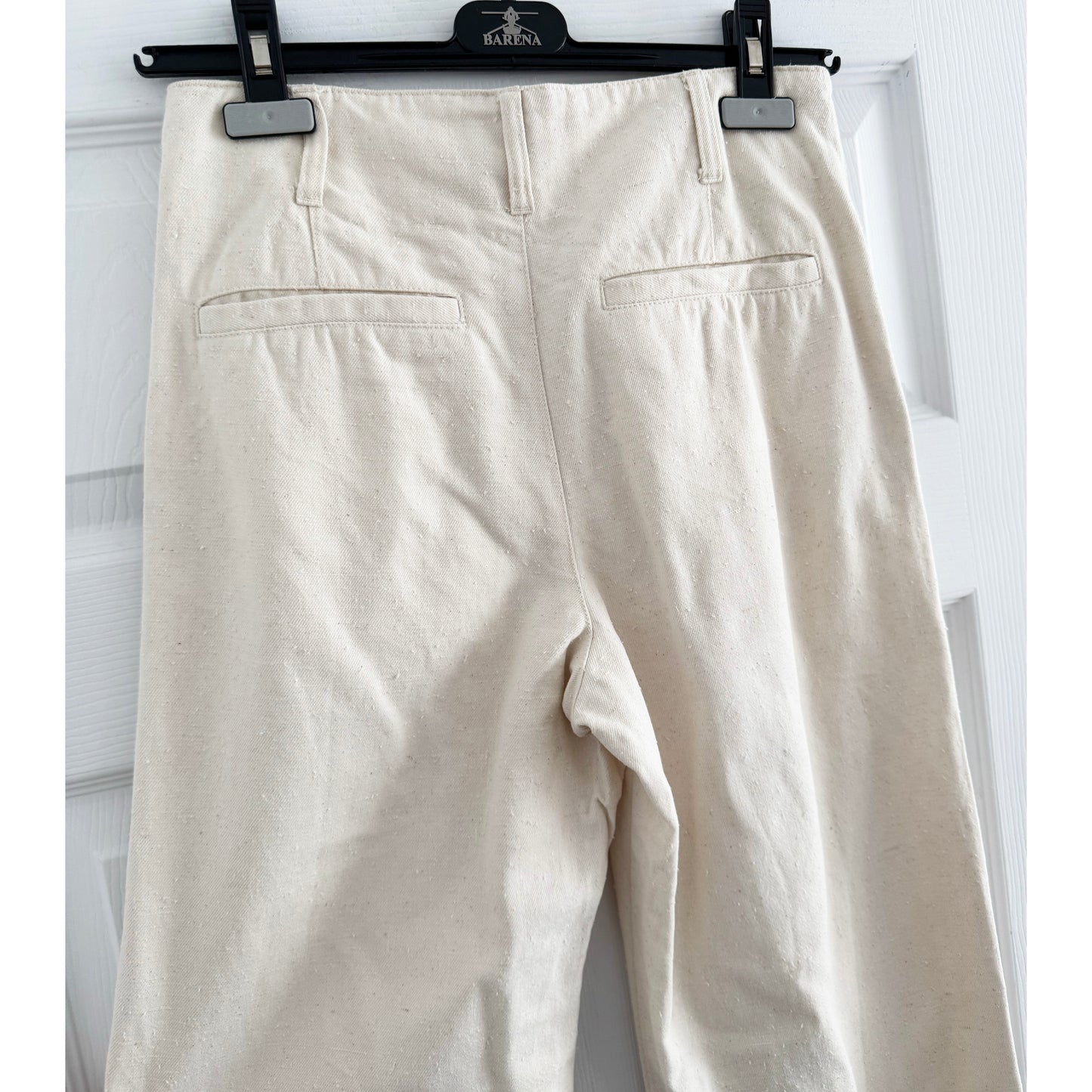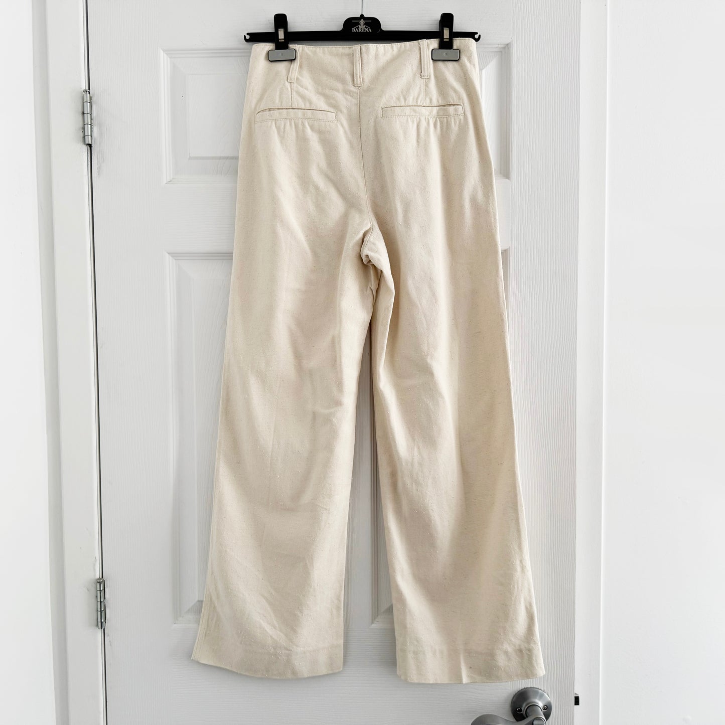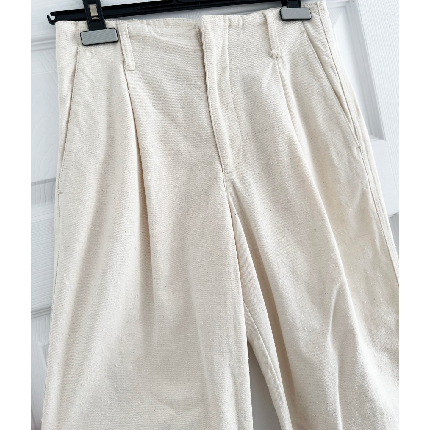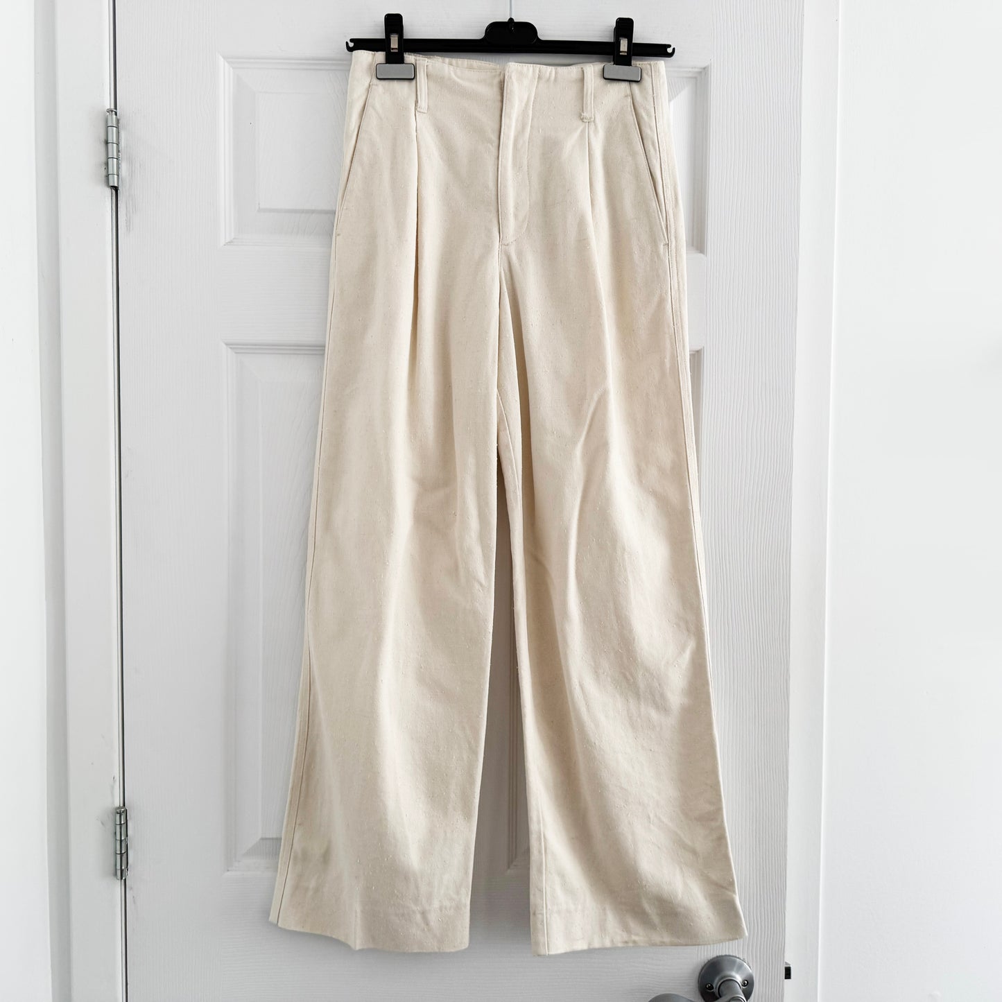 LouLou Studio "Jiva" Pants in Ivory, size XS. Hemmed about 2-2.5 inches or so! Fits true to size. An absolutely stunning high waisted pant, done with a pleat in the front - a menswear reference that so perfectly suits the cut! The fabric isn't too light, but neither is it too heavy - it holds the silhouette exactly as it should, without flopping around too much. Pair them with anything under the sun, but DEFINITELY with the matching top for a chic coordinated vibe. 28 inches actual waistband. 11 inch rise. Hemmed to a 27.5 inch inseam (there's 2 inches of the fabric underneath to let it down if you want to!). Zip fly. 55% cotton, 28% viscose, 12% linen, 7% silk. There is some variation in the thread - texture wise and also there are the odd little bits where the colour varies, like in the close up shot. It's just a normal part of it! Lightly worn and in very good condition. Originally $390USD, or like $500CAD or so, and selling here for $175CAD!