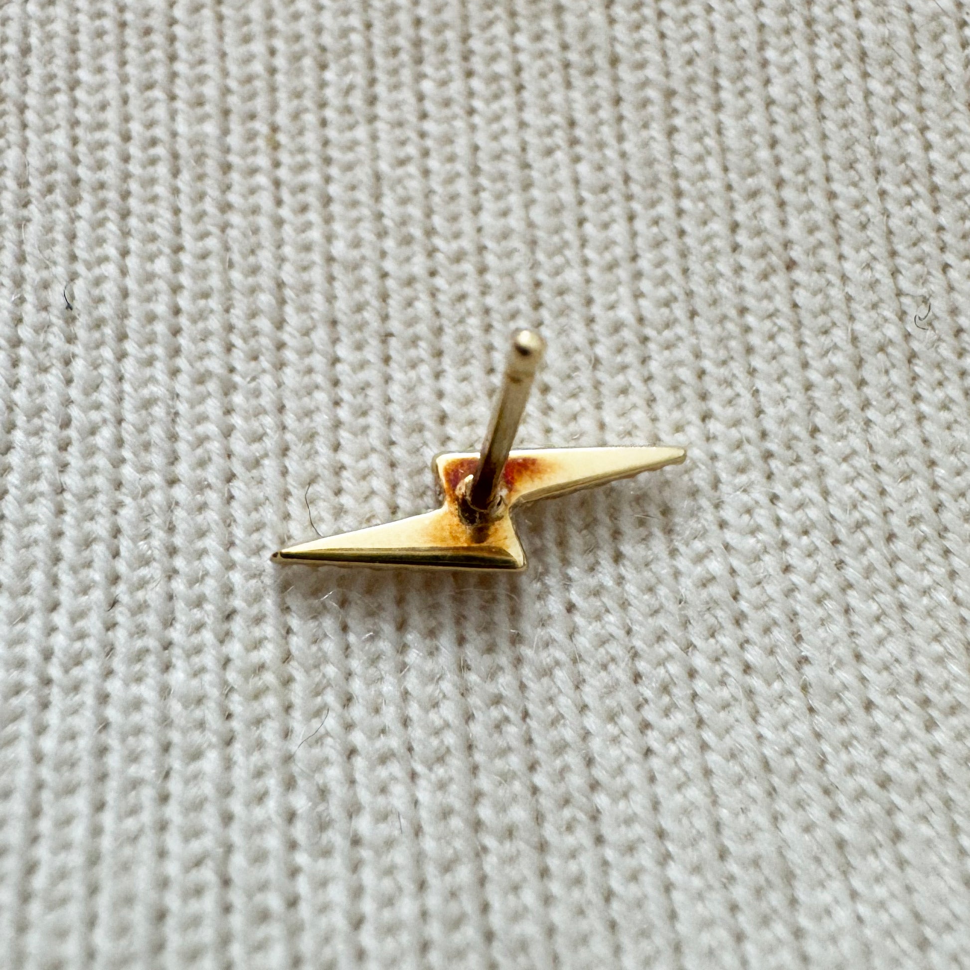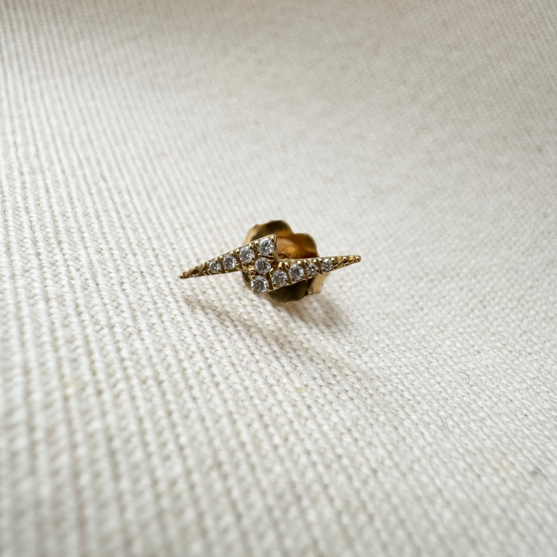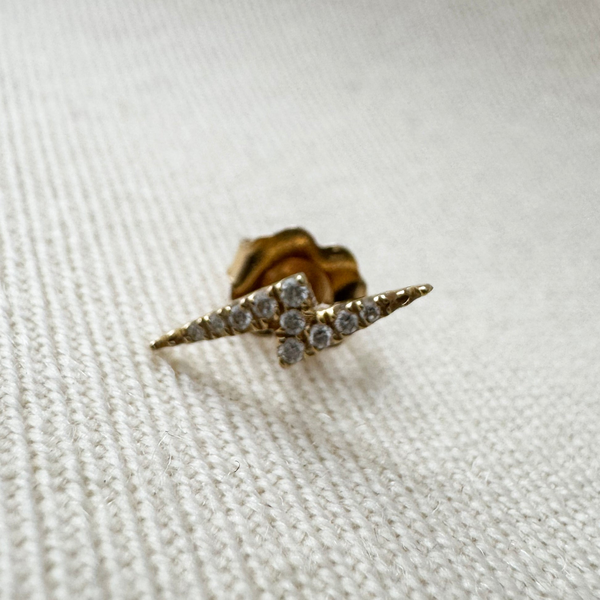 Maria Tash Lightning Bolt Earring. A striking solid gold lightning bolt featuring a flash of white diamonds on its surface. Includes a traditional butterfly backing in a matching colour and karat. Item sold a single earring.