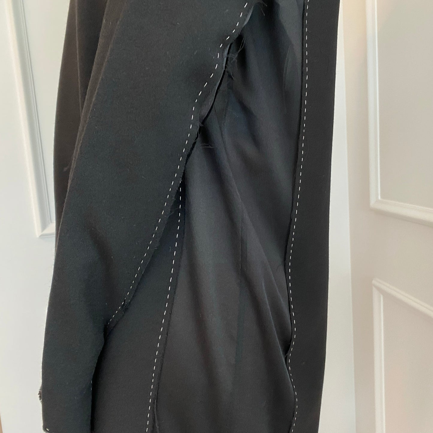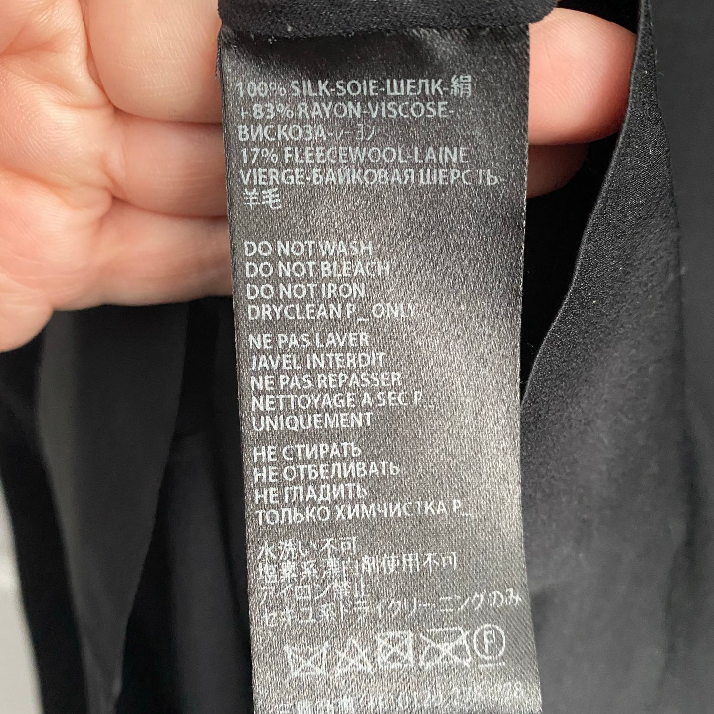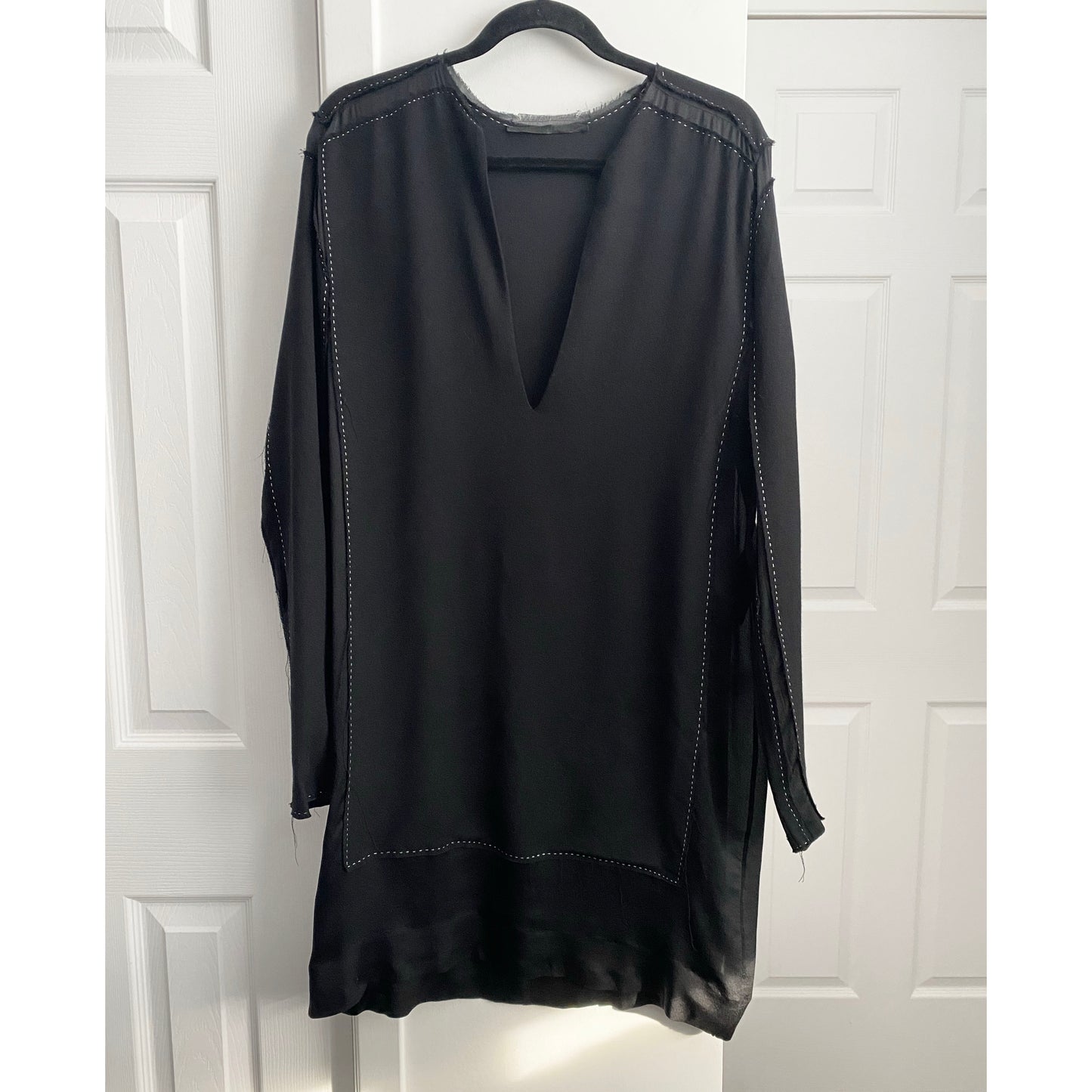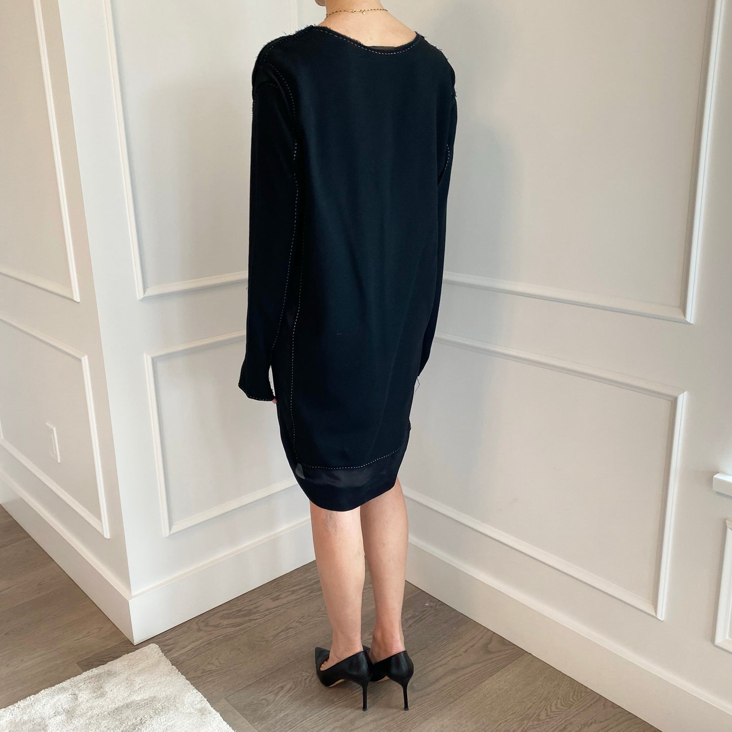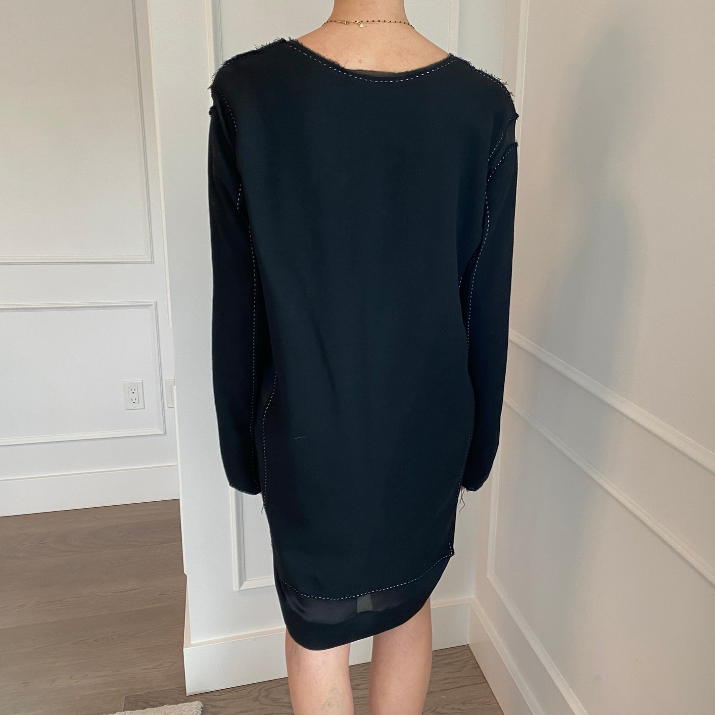 Haider Ackermann Long Sleeve Plunging Neckline Dress in Black, size 40 (fits a slim Medium, like a size 6, and is probably best for someone taller! This model is 5'9", for reference). Insanely sexy plunging neckline long sleeve dress, with sheer sides, hemline and around the armhole. The white contrast topstitching adds to the luxury hand finished detail. This would be so stunning for an understated evening look - that's ANYTHING but basic. So design forward, but also - something that completely transcends time, trends or anything. It's modern, clean and dramatic. It's UNREAL!! Regarding the sheer panels - whatever underwear you wear will be LIGHTLY visible if someone inspects you closely from the side. If you are wanting the "nude underneath" look, choose something the same colour as your skin with thin straps on the side. (I personally would just do black, since I like visible undergarments - it's a styling decision - to each their own). The dress measures approximately 37 inches in length. The end of the neckline measures approximately 10 inches down from the collarbone. The hips measure 20 inches flat, meaning to leave lots of room for ease you'd want your maximum hips measurement to be about 36 - 37 inches so that there was room to sit comfortably. 83% rayon, 17% wool. The side panels are 100% silk. In excellent condition. Originally over $2000CAD (probably closer to $3000 LOL) and selling here for $295CAD!