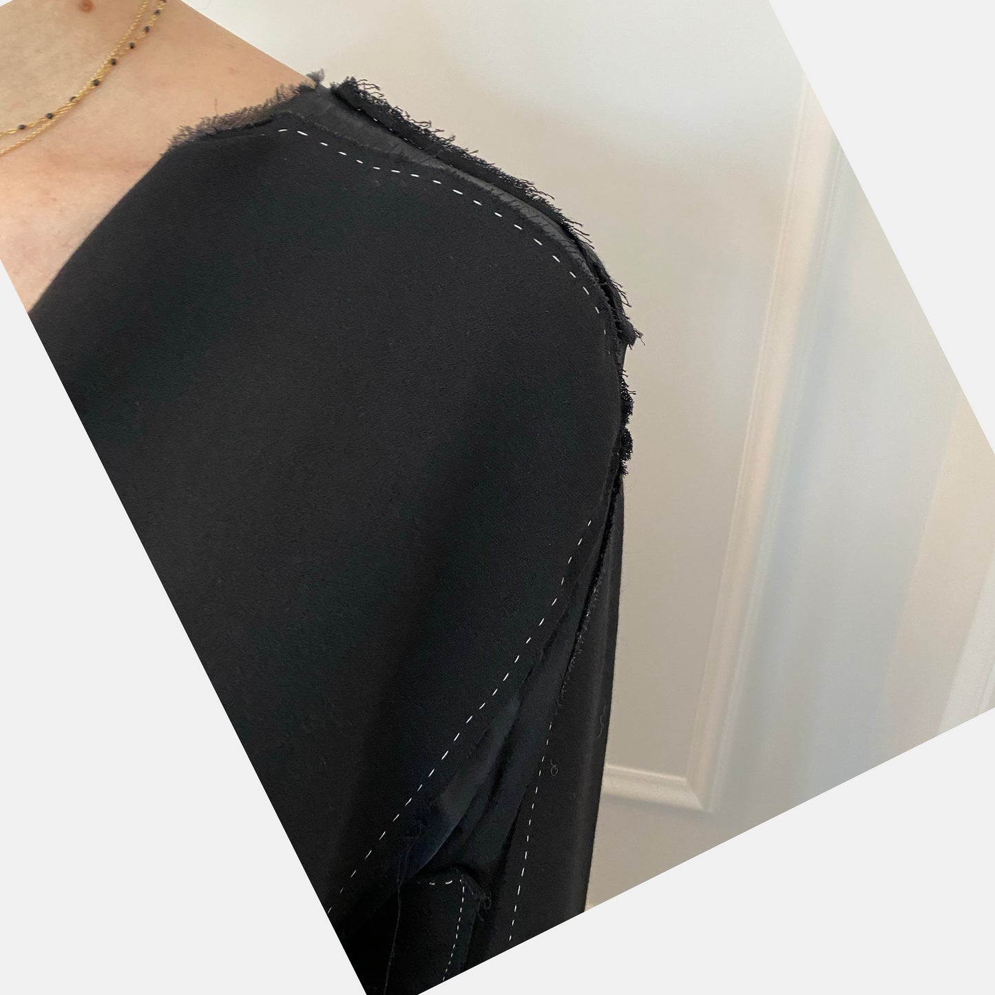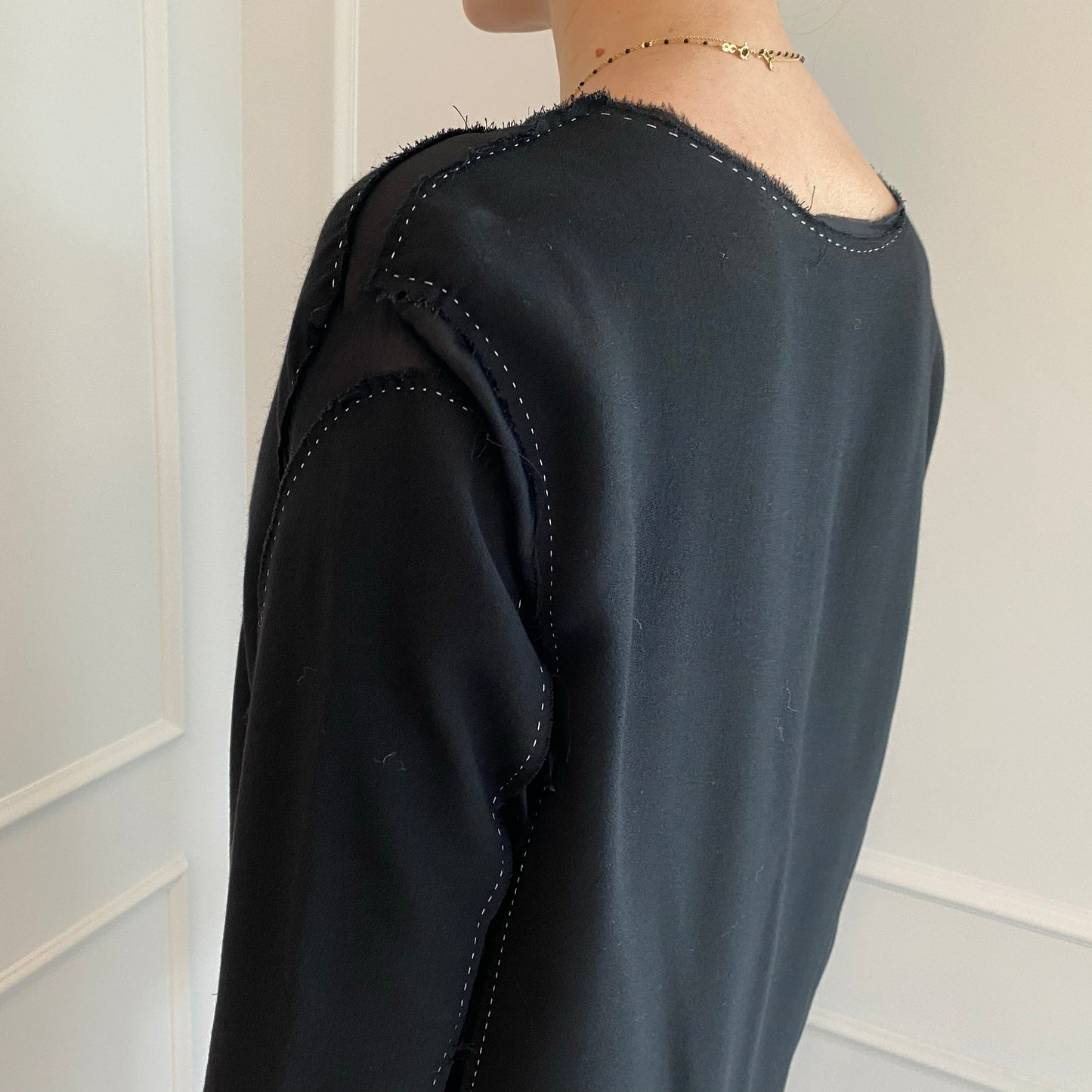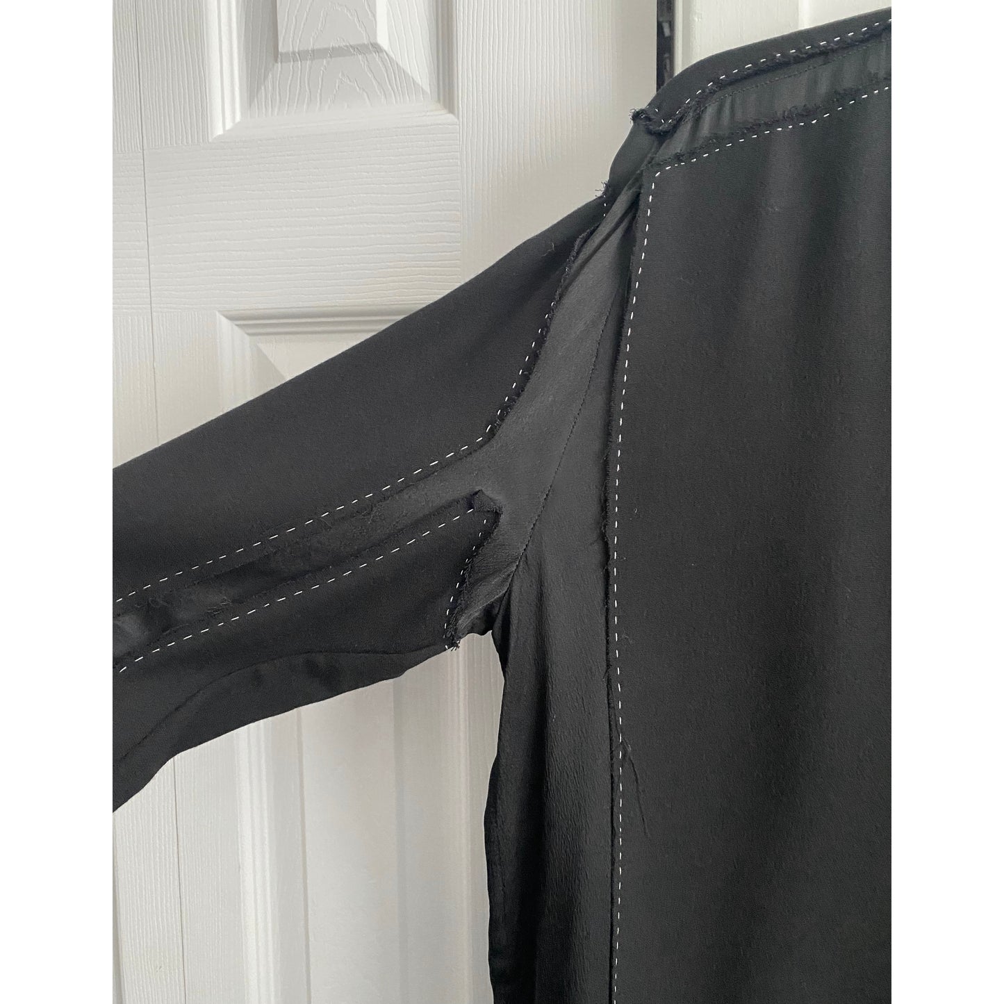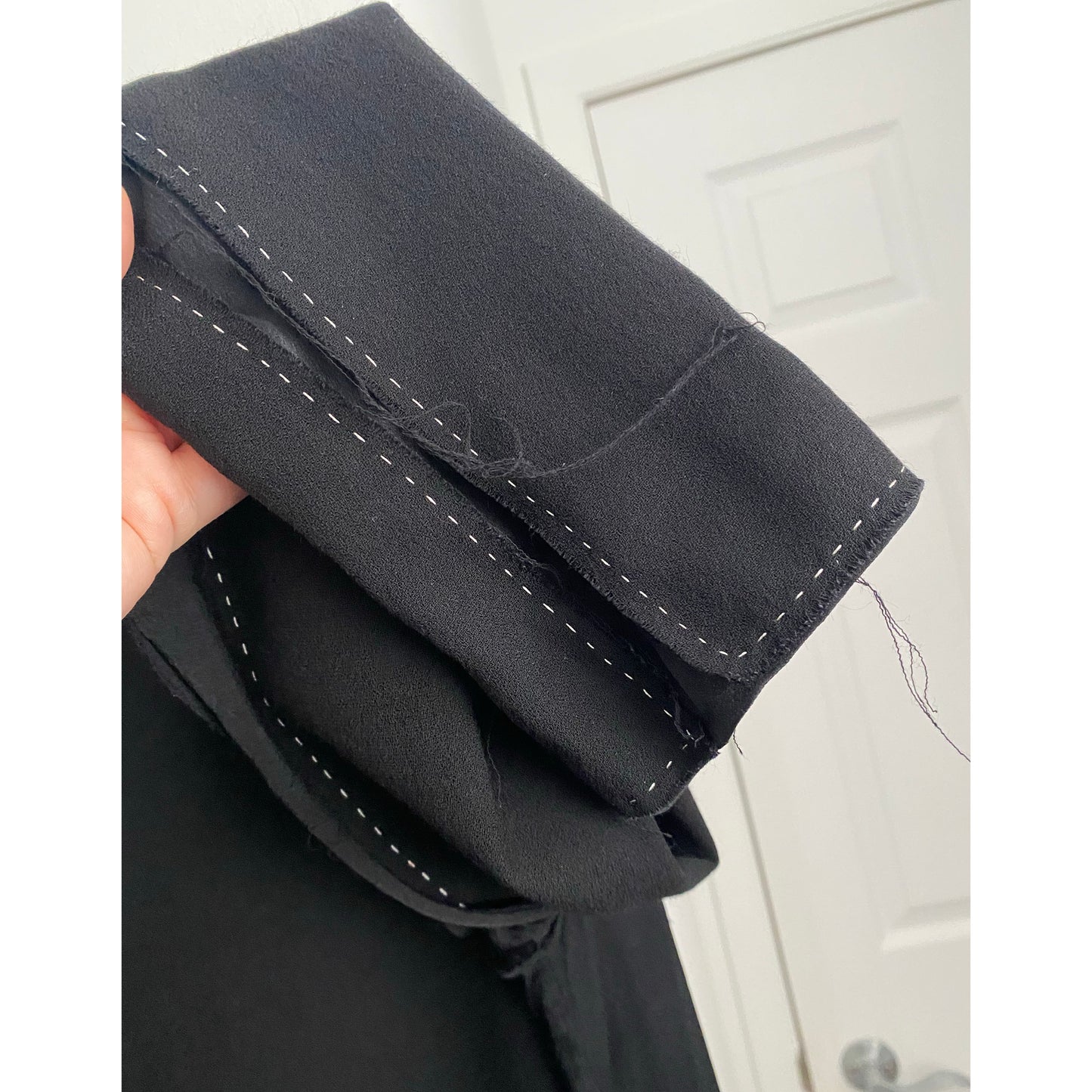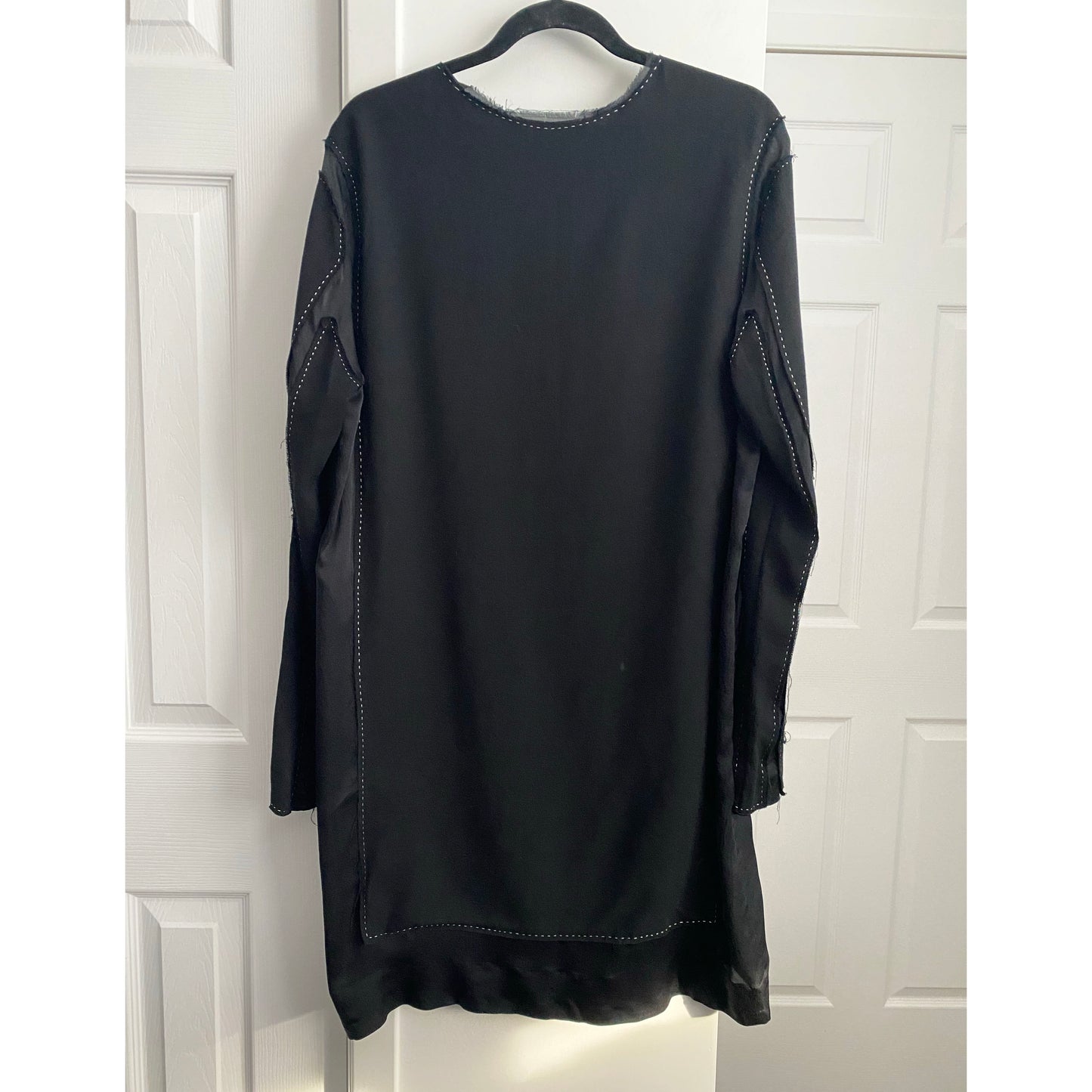 Haider Ackermann Long Sleeve Plunging Neckline Dress in Black, size 40 (fits a slim Medium, like a size 6, and is probably best for someone taller! This model is 5'9", for reference). Insanely sexy plunging neckline long sleeve dress, with sheer sides, hemline and around the armhole. The white contrast topstitching adds to the luxury hand finished detail. This would be so stunning for an understated evening look - that's ANYTHING but basic. So design forward, but also - something that completely transcends time, trends or anything. It's modern, clean and dramatic. It's UNREAL!! Regarding the sheer panels - whatever underwear you wear will be LIGHTLY visible if someone inspects you closely from the side. If you are wanting the "nude underneath" look, choose something the same colour as your skin with thin straps on the side. (I personally would just do black, since I like visible undergarments - it's a styling decision - to each their own). The dress measures approximately 37 inches in length. The end of the neckline measures approximately 10 inches down from the collarbone. The hips measure 20 inches flat, meaning to leave lots of room for ease you'd want your maximum hips measurement to be about 36 - 37 inches so that there was room to sit comfortably. 83% rayon, 17% wool. The side panels are 100% silk. In excellent condition. Originally over $2000CAD (probably closer to $3000 LOL) and selling here for $295CAD!