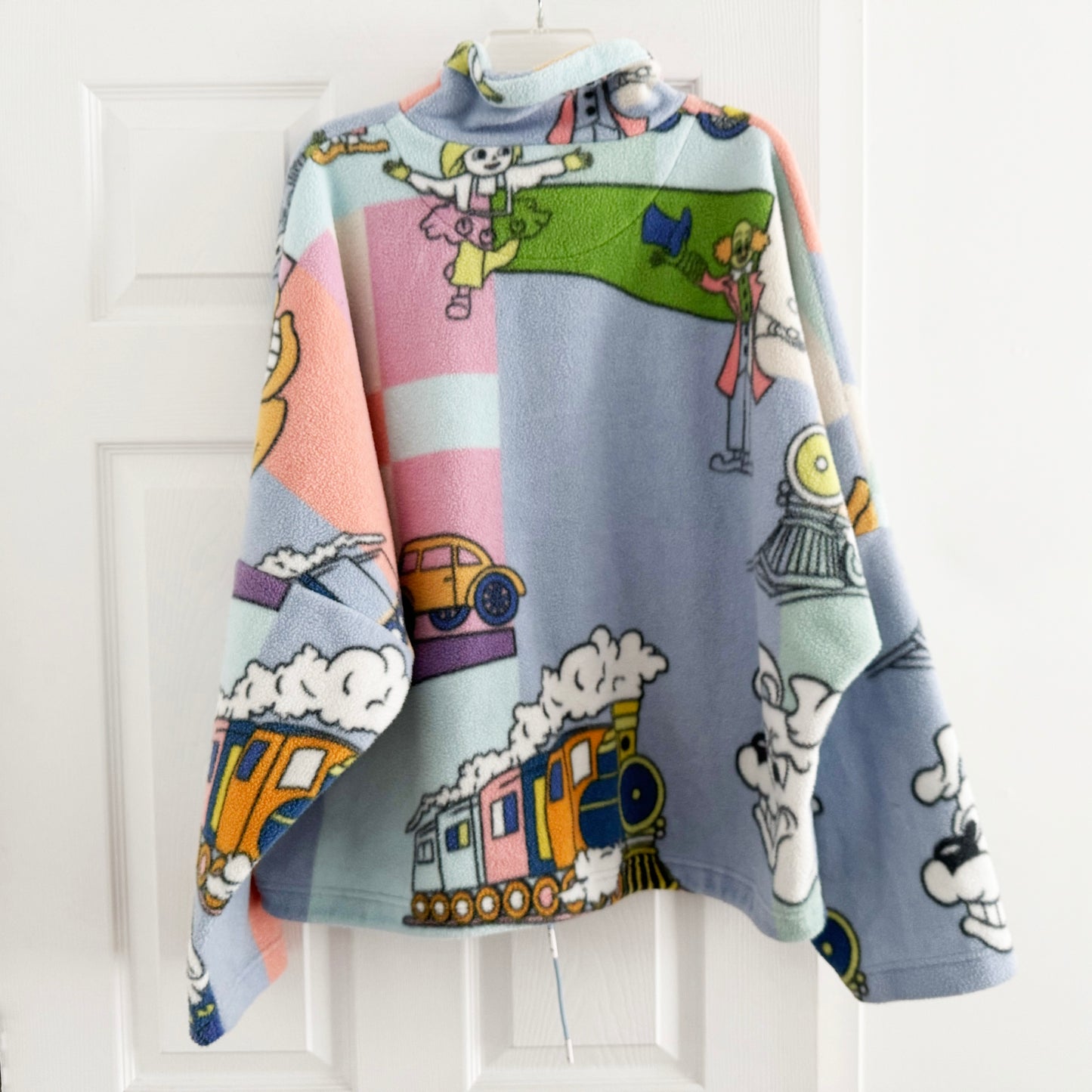 The colorful cartoon print of this cozy fleece pullover might seem innocently playful, but it's actually a satirical take on Britain's current political state.
