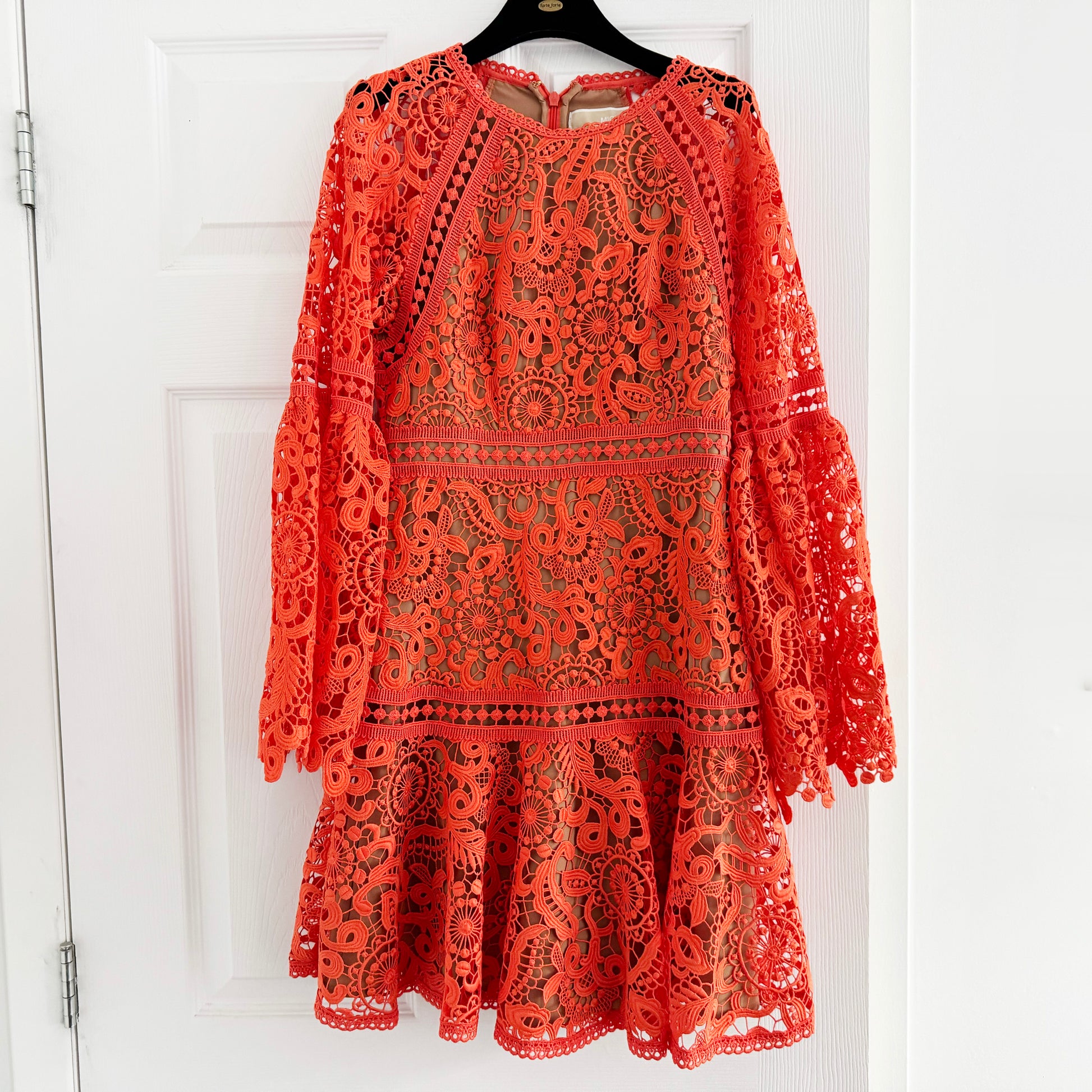 Michael by Michael Kors Lace Dress with Bell Sleeves in Orange, size 2. Fits true to size. Such a fun colour - and beautiful texture with the lace. Perfect for any kind of occasion, in any season. 17 inches armpit to armpit. 14 inches flat across at the waist. 17.5 inches flat across at the hips. 33 inches in length. 100% polyester. In excellent condition. Originally