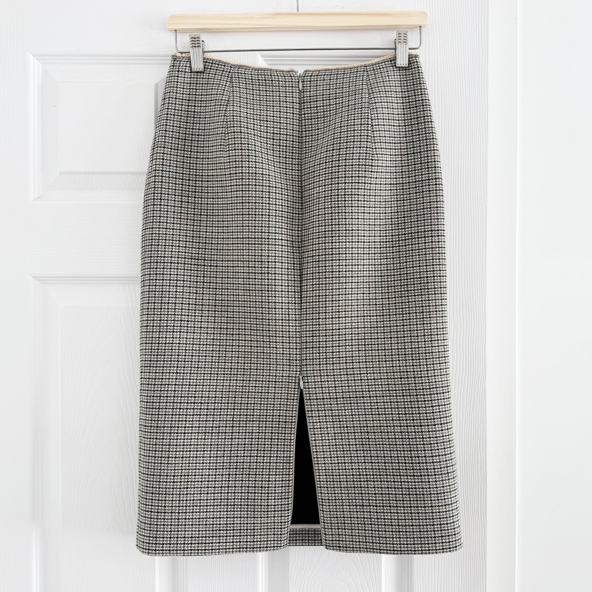 No 21 Micro Galles Pencil Skirt, size 40IT (fits like size 2). From the Fall 2023 runway - this Italian brand (the designer is Alessandro Dell'Acqua, a longtime fashion veteran - former creative director of Rochas, Brioni, and his own label, which he walked away from in 2009 - I won't get into the tea here) is stocked at Boboli - IYKYN. Insanely beautiful quality - the fabric is gorgeous! It is bonded on the inside, which gives it a bit of structure. The slit at the back is actually a zipper, so you can close it if you don't really like talking long strides. lol 26.5 inches in length. The waistband measures 14 inches flat. 19 inches flat at the hips. 100% wool. In excellent condition, but it's missing the brand tag. Originally $650CAD, and selling here for $185CAD!
