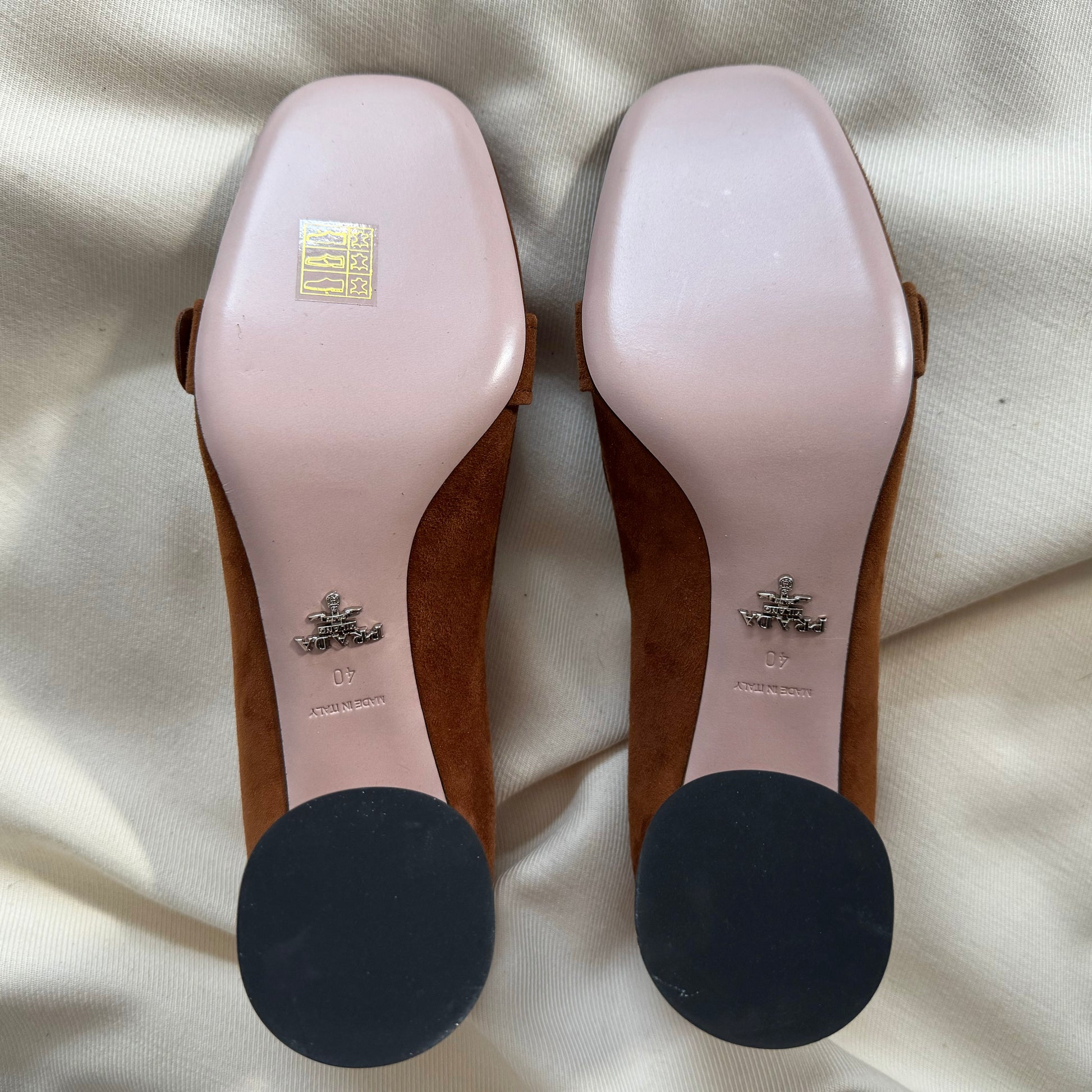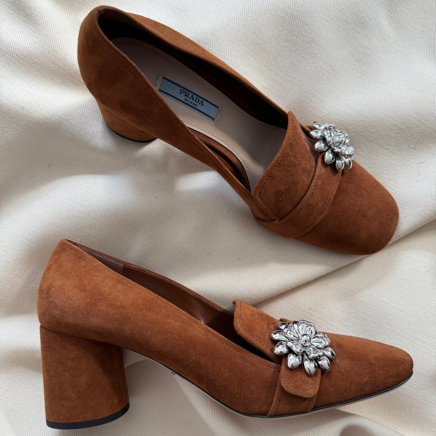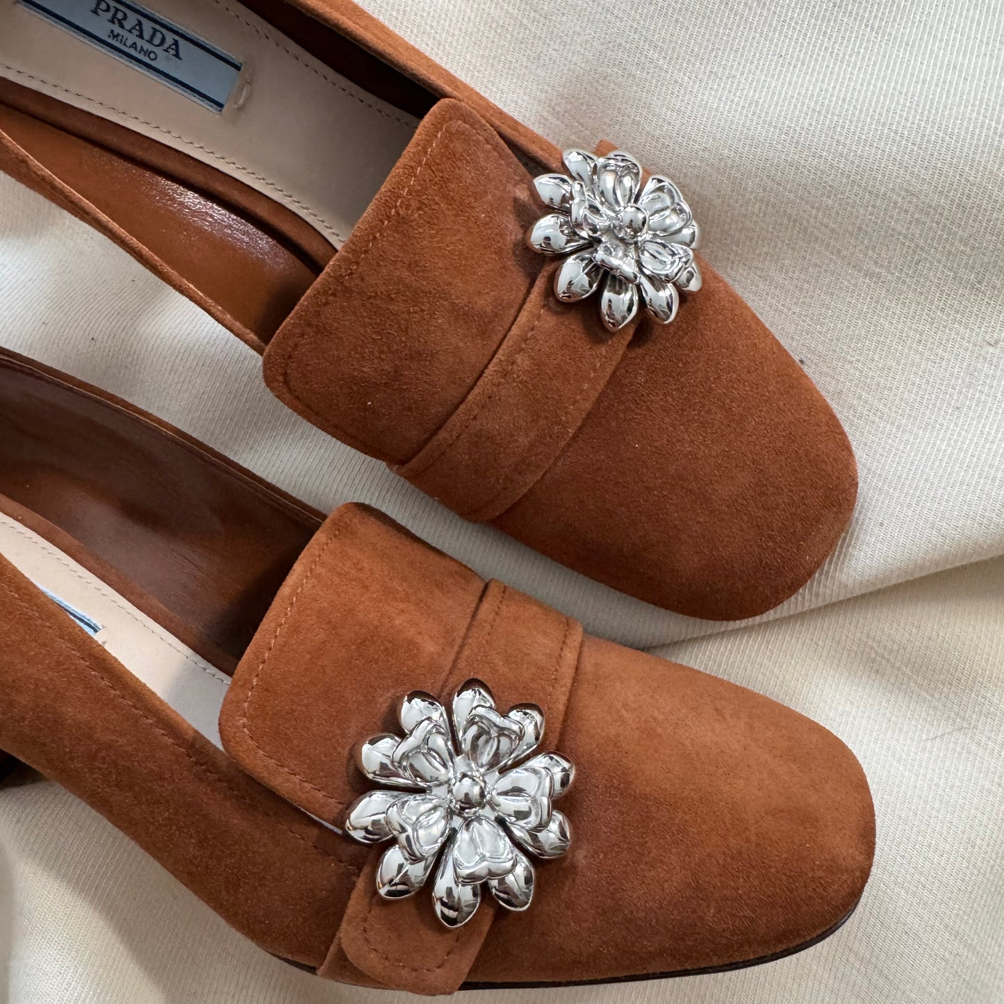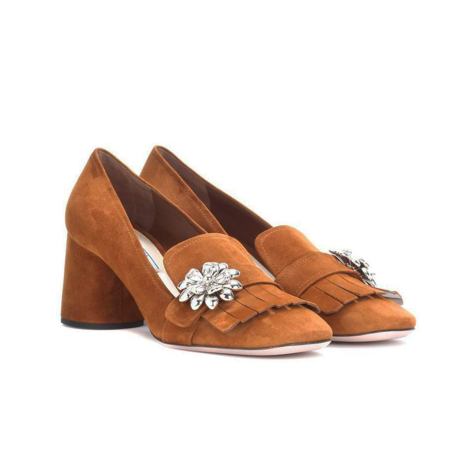 PRADA Ornament-embellished Suede Loafer Pump In Palissaedro, size 40. Fits true to size. Prada's late 60's/early 70's granny-core vibes never go out of style and I LOVE that about her work. Pair with little socks and knit underwear (not me, personally, but someone young and hot), or with a wild printed pant and a bold knit, or wide leg jeans and a turtleneck. There's so many ways to style Prada - these offer a lot of options for the girl who gets the brand's post-modern vibe. 2.5 inch heel height. Never worn! Originally $1200CAD, and selling here $325CAD!