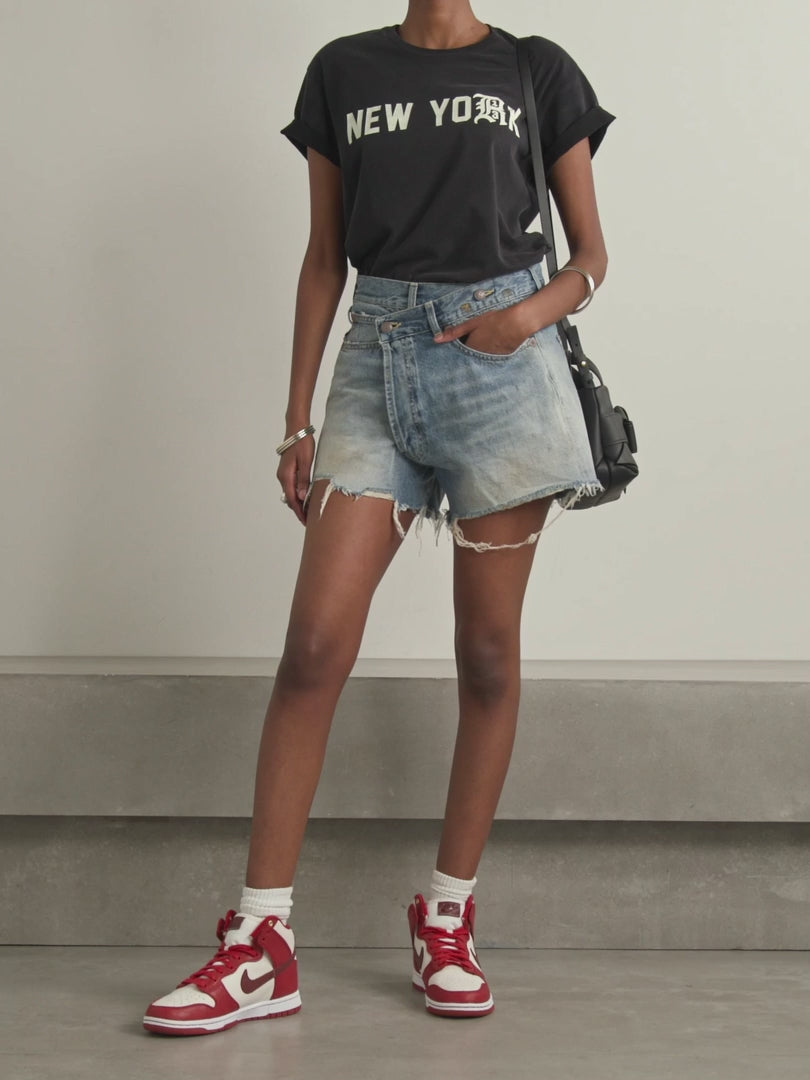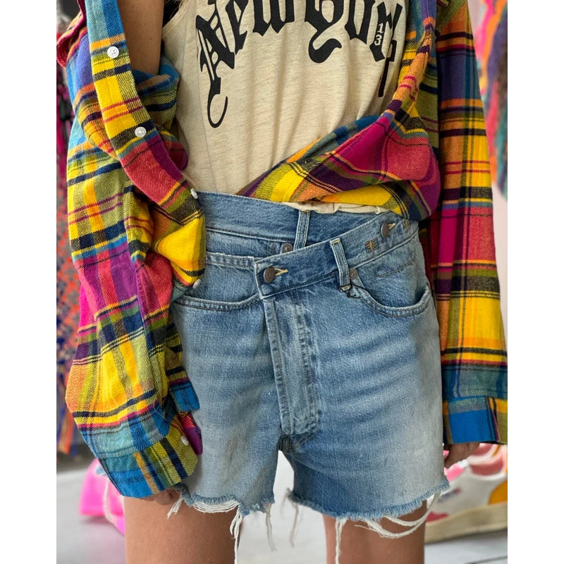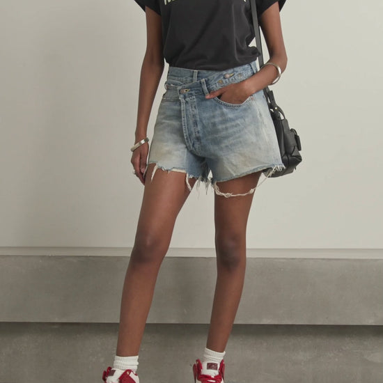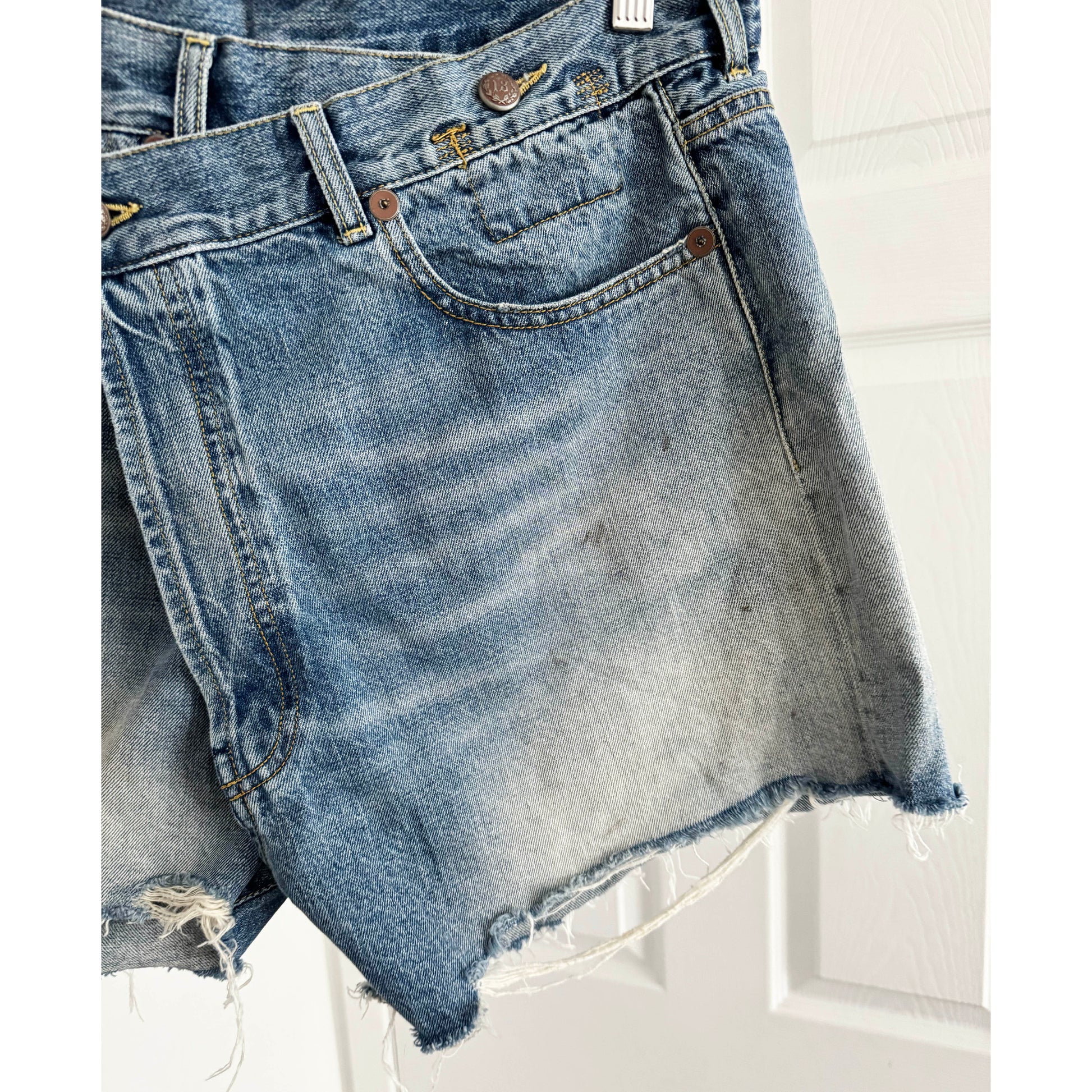 R13 Crossover Asymmetric Distressed Jean Shorts in "Turner Blue", size 29