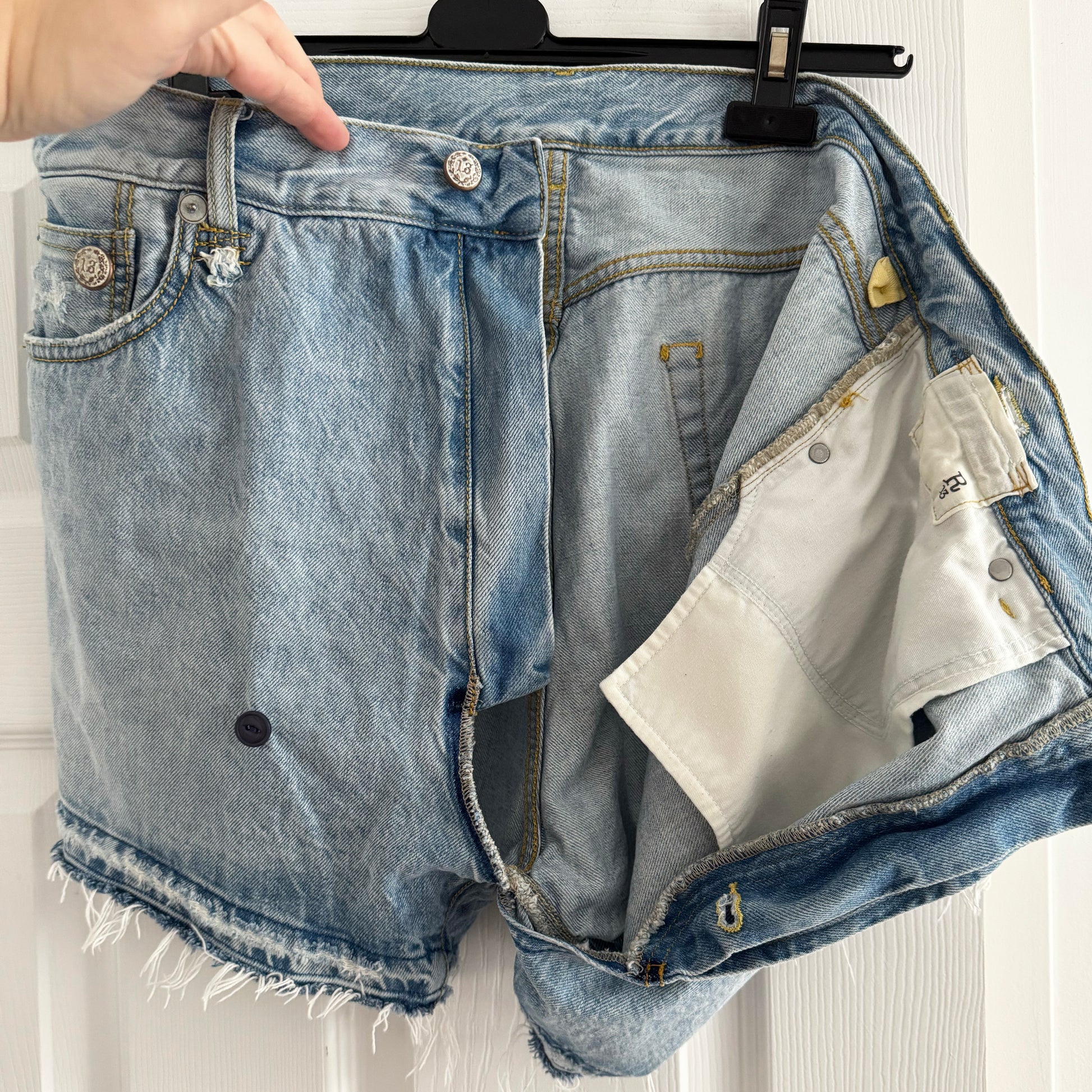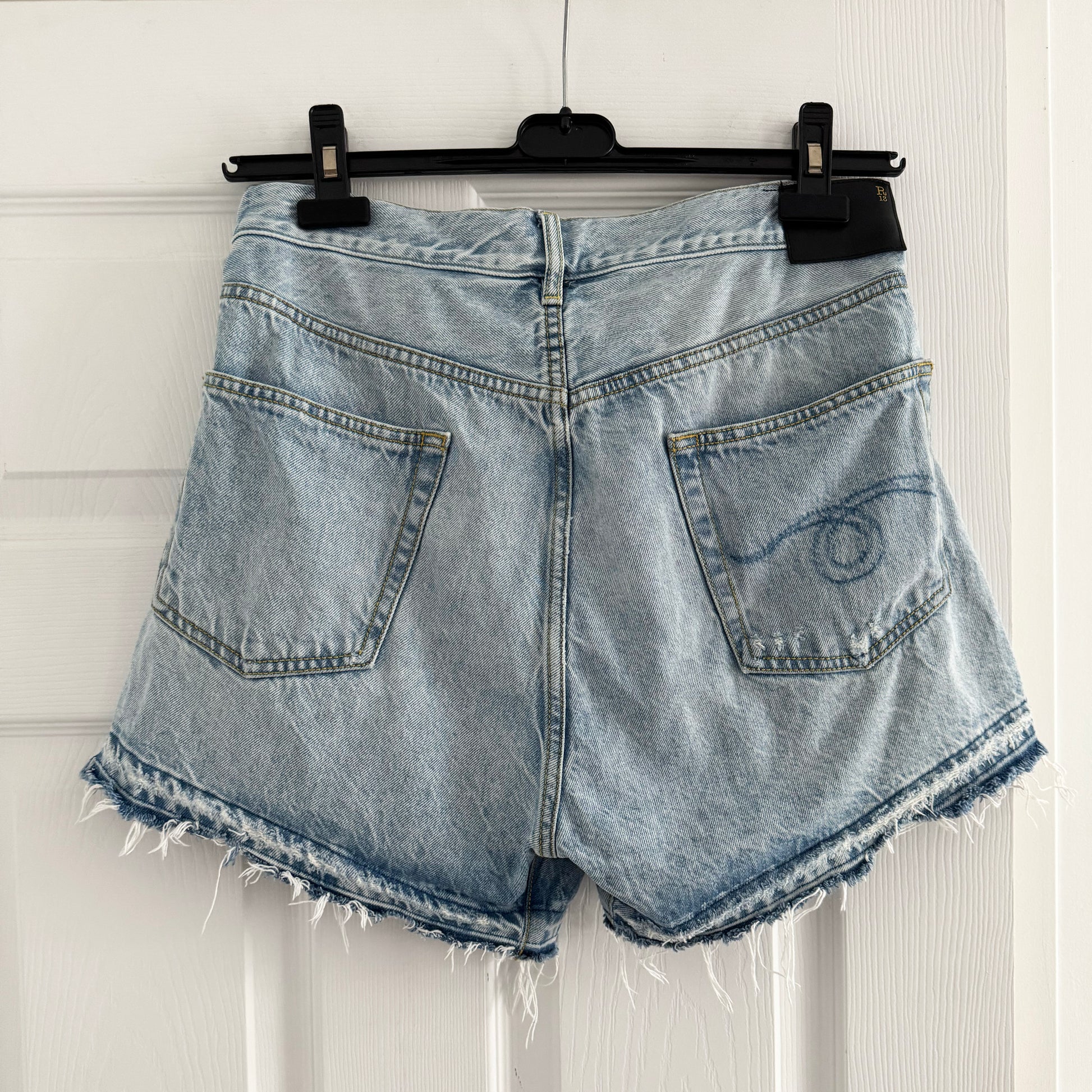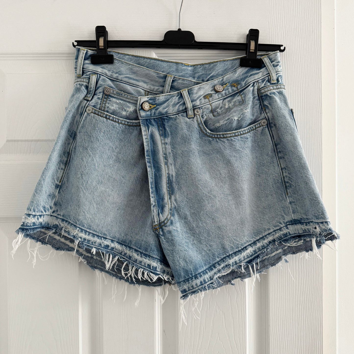 R13 Crossover Shorts in Tilly with let down hem, size 27 (fits true to size, or like a 28 for someone wanting them less slouchy). Undeniably incredible denim shorts - just the right amount of rebellious - for wearing with everything from a tee shirt, a blazer or a silk camisole. Make sure you don't wear a top that covers the crossover fly - tucking in at the front works well. The distressed detailing throughout adds so much texture - I love the unpicked hem - always have and I always will! Pair them with sneakers, sandals, or combat boots - you name it!! 31 inches actual waistband measurement, which is meant to sit down on the hip a little. About 13 inches in length. 100% cotton. Worn a handful of times and freshly washed (hung to dry of course). Originally like $500CAD, and selling here for $175CAD!