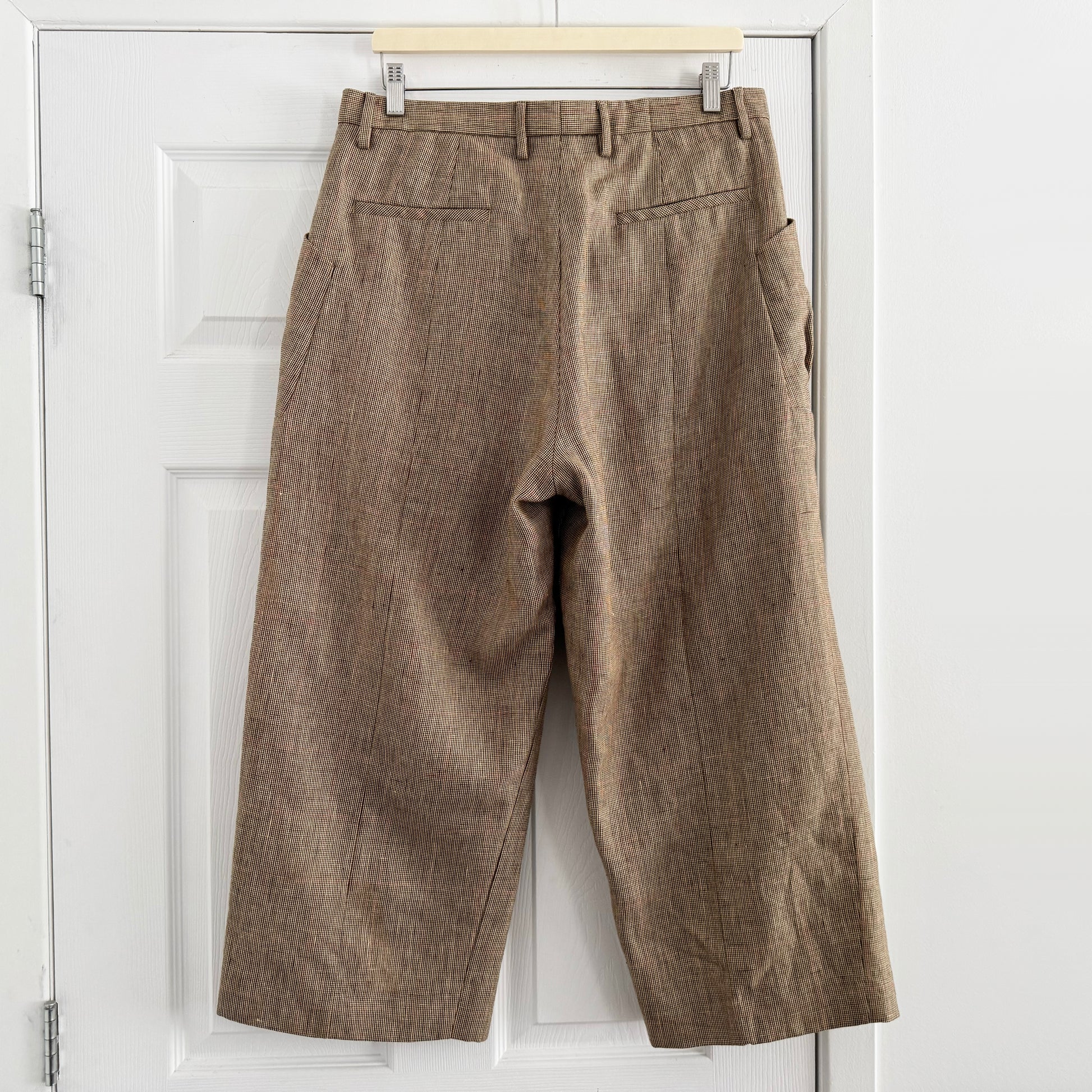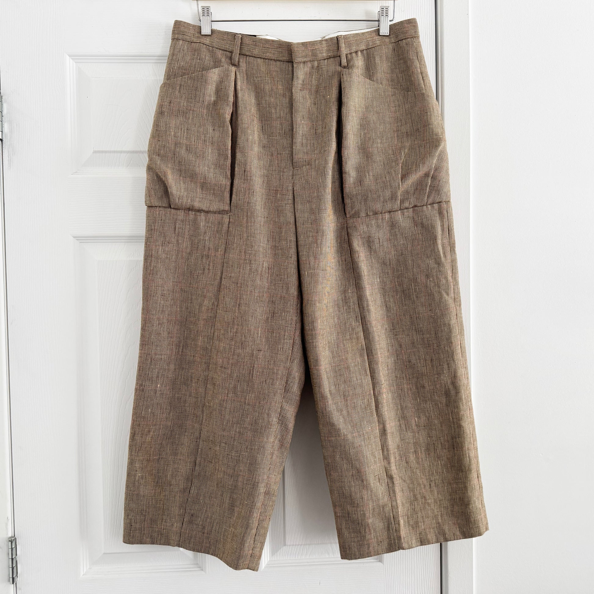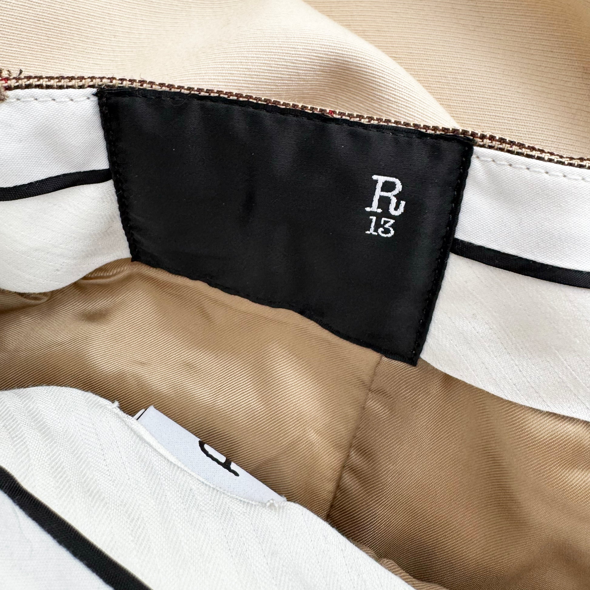 R13 Pleated Pocket Trousers in Brown, size 29. Fits slouchy to size. Insanely cool - a loose silhouette so perfectly complimented by the fabric - it's the kind of pant that can't be considered fully dressy, or fully casual - it's both, it's neither - they're whatever you want them to be. Great with boots, or flats - in just about any season but the heat of summer i'd say? Fully lined, which you don't see that much anymore. 17.5 inches flat across at the waistband. 12.5 inch rise. 23.5 inch inseam. 51% Wool, 49% Linen. Originally $1225CAD, and selling here for $315CAD!