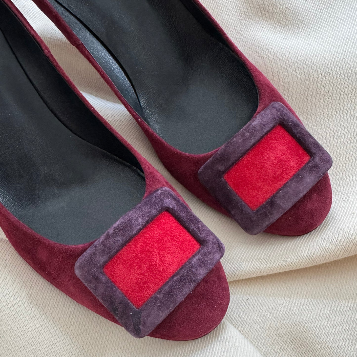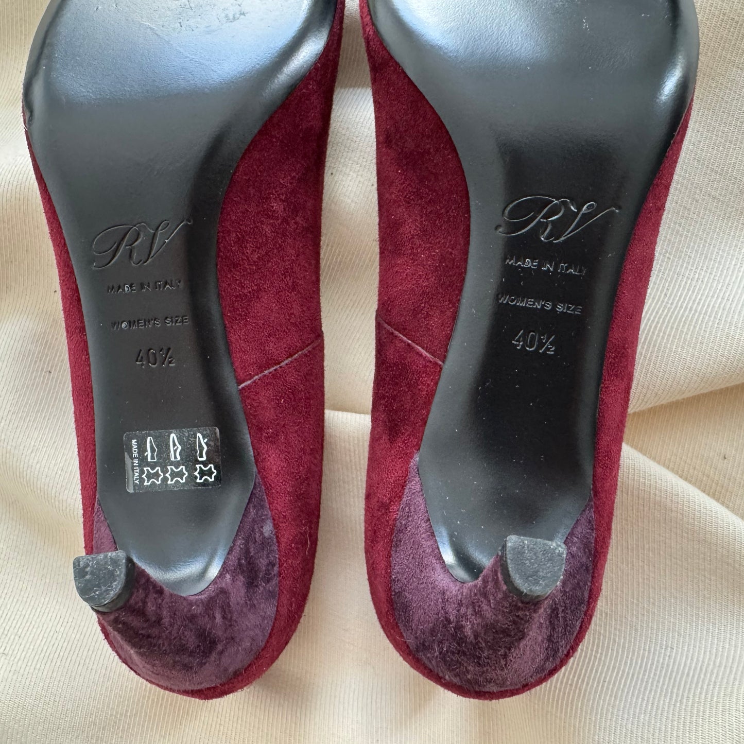 Roger Vivier "Belle Vivier Trompette 70mm Suede Pumps In Burgundy, size 40.5. Fits true to size. Such beautiful colours - perfect for the season! This iconic brand doesn't reinvent the wheel every season - they might tweak the colours a little bit, but they make beautiful quality leather goods - and they do it so well. These are as beautiful with a black suit as they are with denim and a silk blouse for dinner. A very reasonable 70mm heel height. Never worn! Does not come with original box. Originally over $1000CAD, and selling here for $345CAD!
