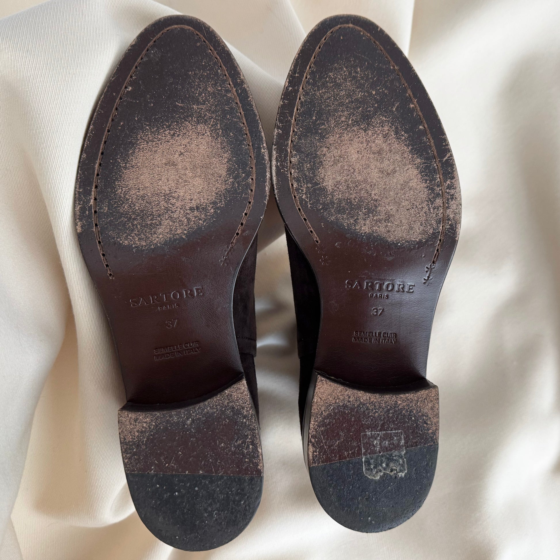 Sartore Suede Ankle Boots in Brown, size 37. Fits like a solid size 7. Such a chic Chelsea boot to pair with trousers. If you know the brand - you how well made they are. The construction is so good. This beautiful brown suede is perfect with all of the season's neutrals - I'm thinking with loose long trousers or denim? But they're just a great wardrobe staple - ideal if you wanted a pair of suede boots that were nice but won't break the bank (no compromises here). Worn once! Does not come with original box. Originally $900CAD, and selling here for $215CAD!
