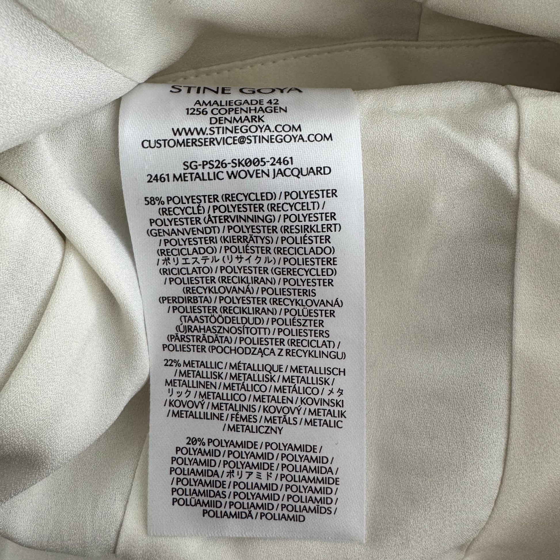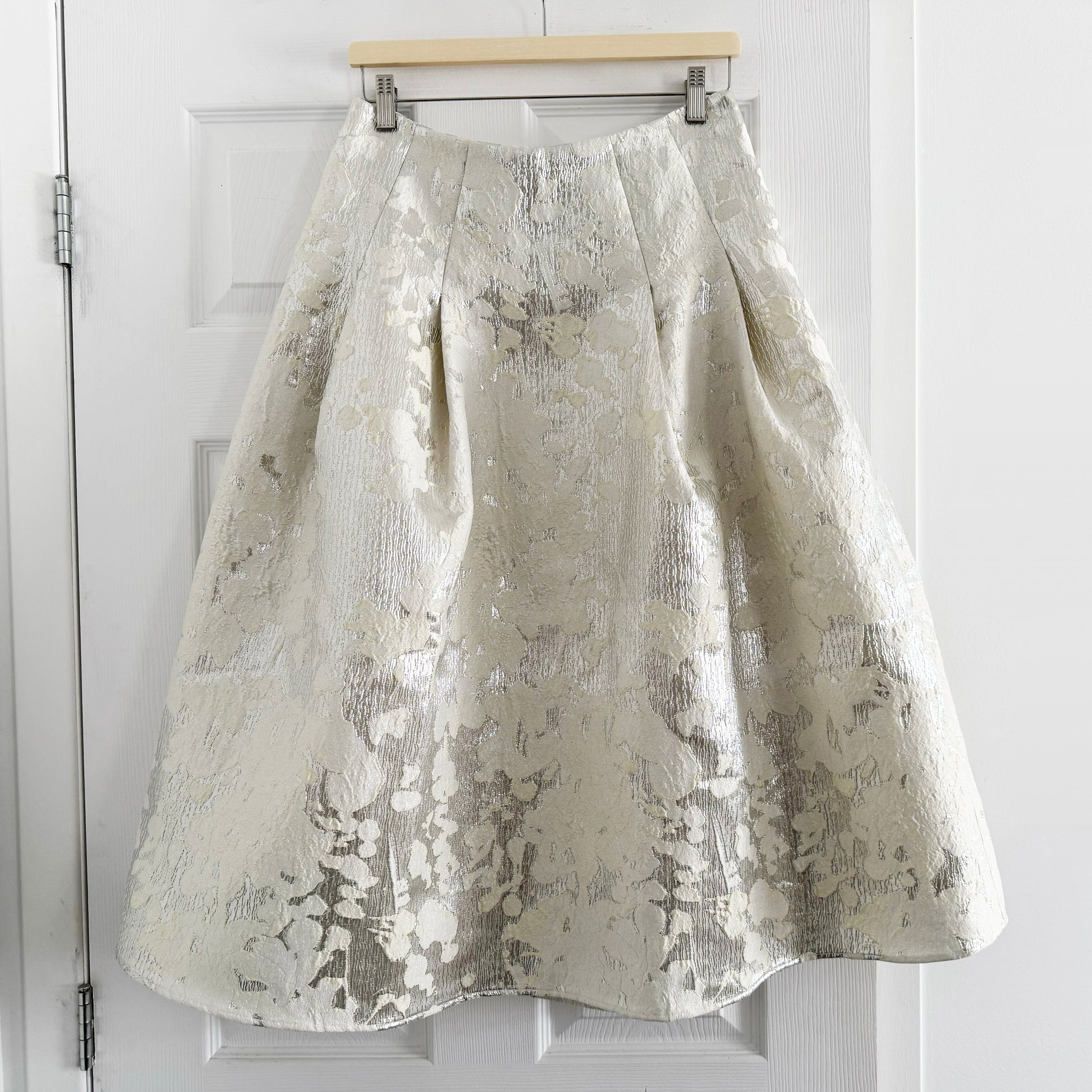 Stine Goya Lurex Midi Skirt in Metallic, size Small. Fits true to size. So striking!!! The way this fabric hits the light is absolutely UNREAL. Designed with pleats for volume, a fitted waistband and side pockets. Pair with anything from a casual tee and anything from a ballet flat to a combat boot, for a little bit of tension, or dress it up with blouse and a heels as an alternative to a dress. the waistband is 15 inches flat (30 around), and 30.5 inches in length. 58% Recycled Polyester, 22% Metallic, 20% Nylon. Lining: 97% Recycled Polyester, 3% Elastane. Currently retailing full price everywhere for $534CAD (assuming straight exchange, but they don't even ship to Canada, so I guess, plus whatever hassle to get it), and selling here for $295CAD!