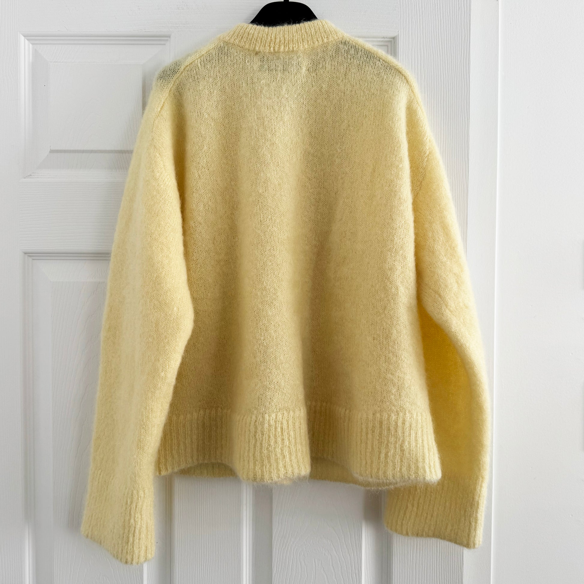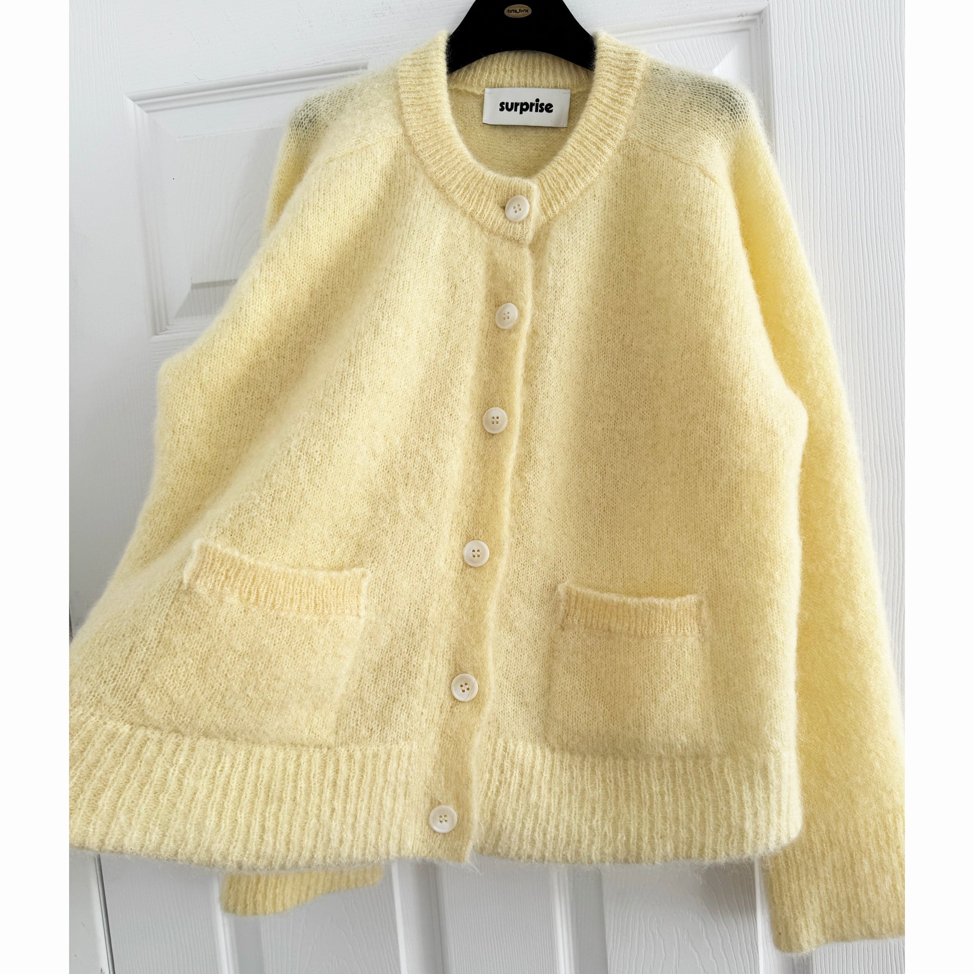 Surprise Paris "Paloma" Cardigan in Light Yellow, Size Medium. Fits true to size for a comfy fit. The texture of mohair is incomparable - so fluffy and pretty - it's SOOO stunning. This beauty is soft and lightweight - I don't find it itchy at all (but then, I'm also not SUPER sensitive to wools). 24 inches armpit to armpit. 24 inches in length. 82% Superkid Mohair, 16% Polyamide, 2% Elastane. In excellent condition - like new. Originally $295CAD, and selling here for $115CAD!