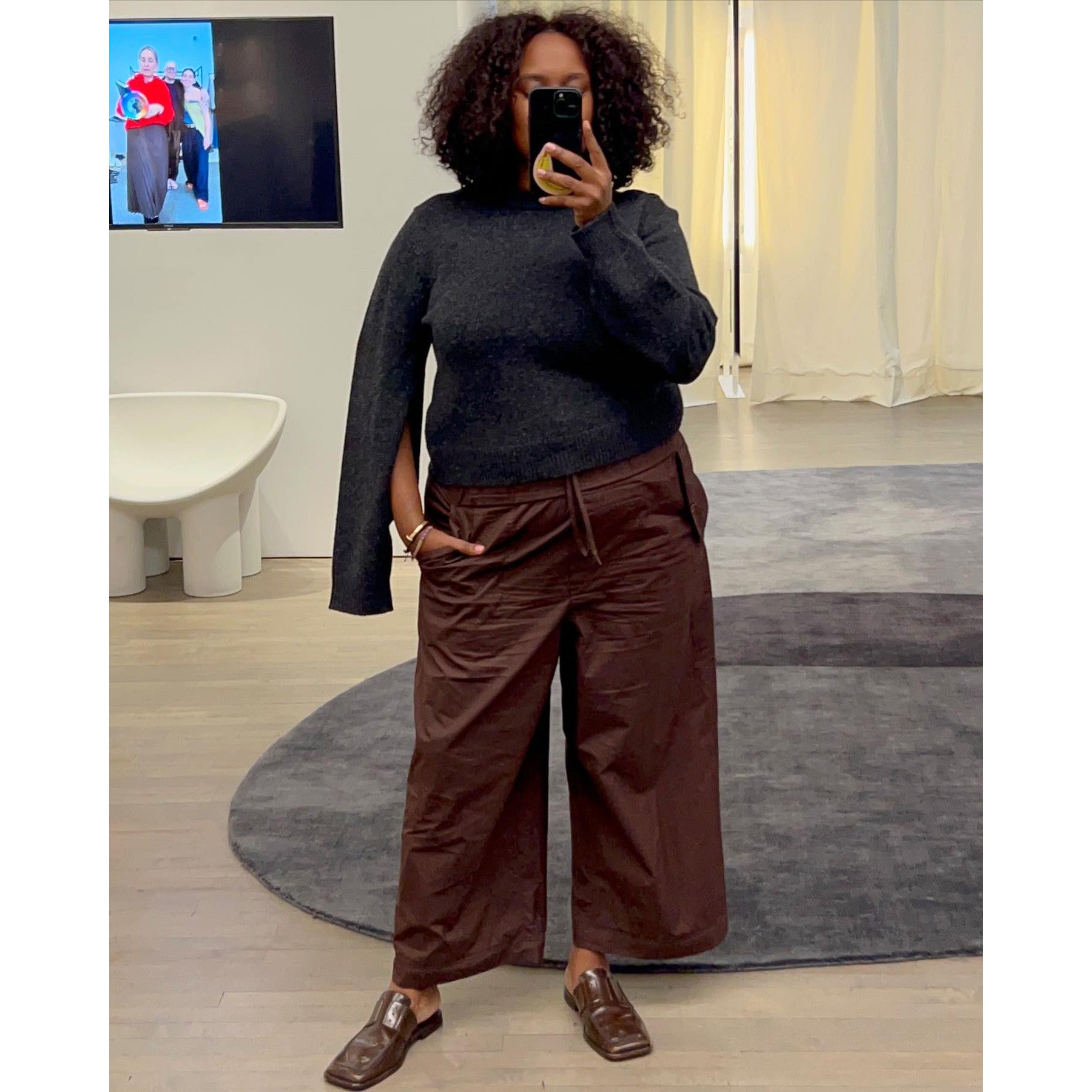 Tibi Brown Cotton Cargo Crop Pant, size XL. Fits loose to size! Such a beautiful poplin pant - a dreamy one to reach for in warmer or transitional temps. A comfortable elastic waistband, with a drawstring tie on the inside, these are meant to be worn slouchy and loose - these can be dressed up or down, as the occasion requires! 37.5 inches total length. 15 inch rise. 24.5 inch inseam. 38 inches waistband, unstretched. Stretches to 46 to get on and off. 100% cotton. Worn only a few times and in very good condition. Originally like $500CAD, and selling here for $175CAD!