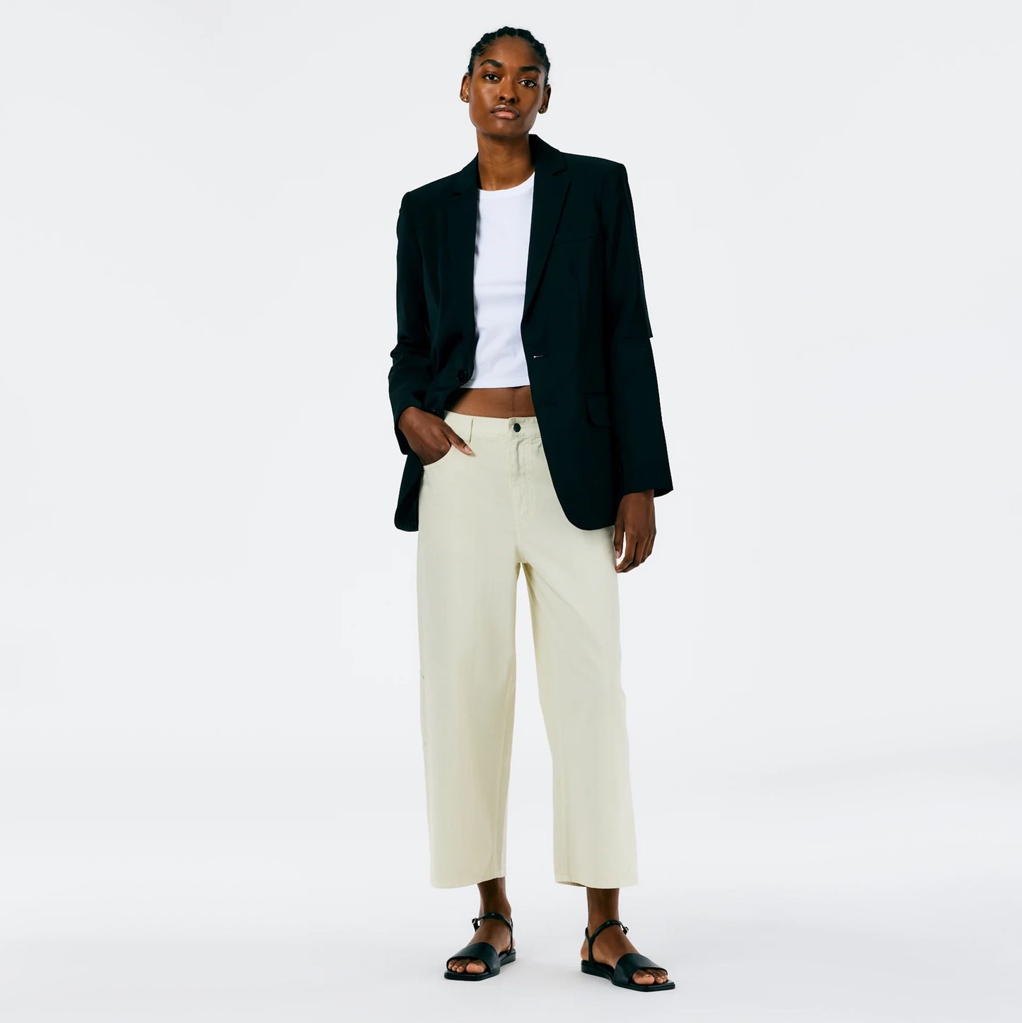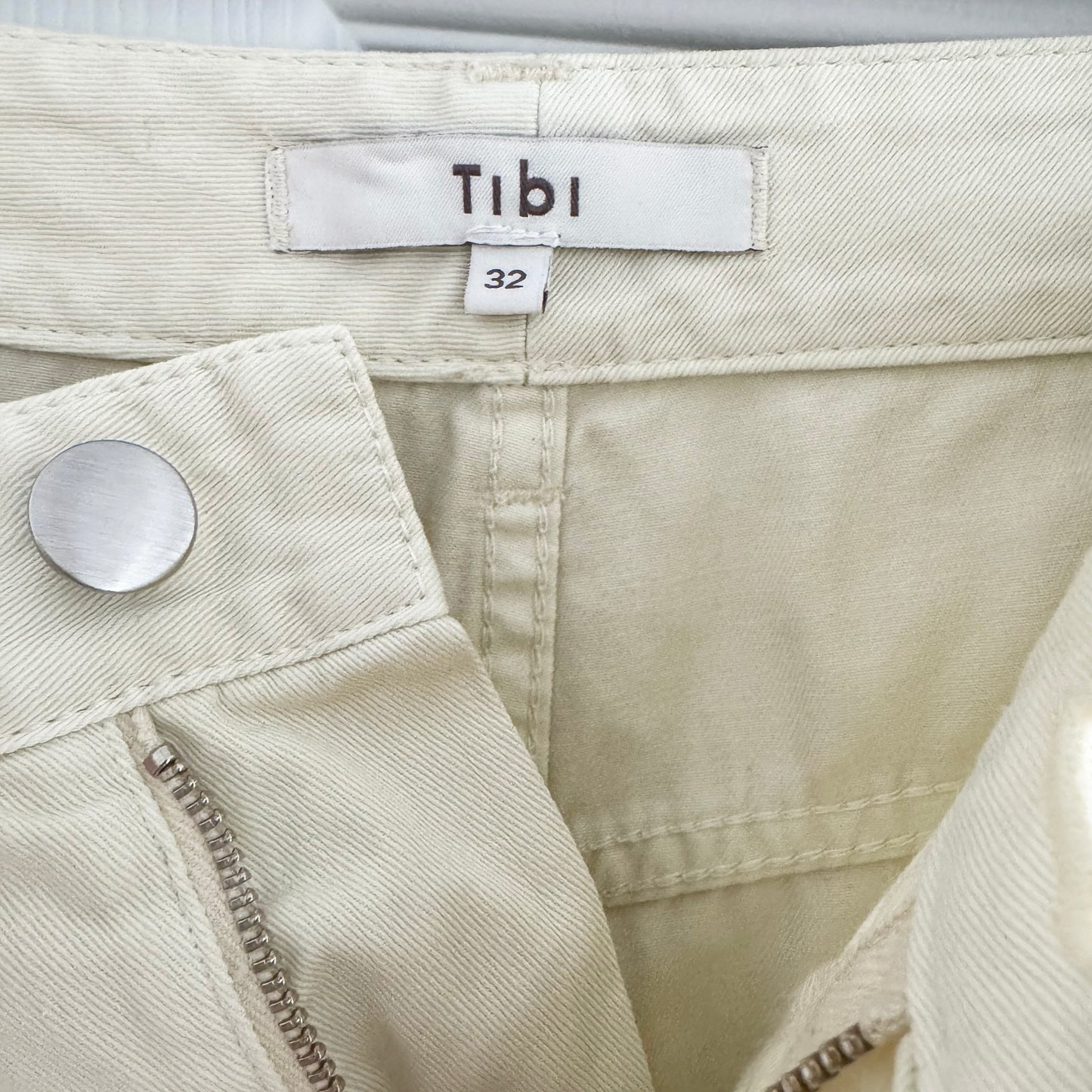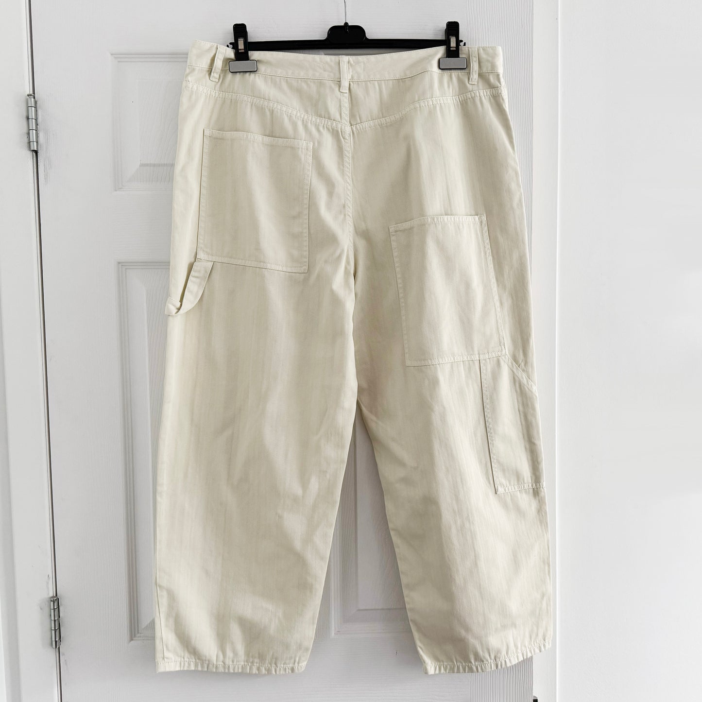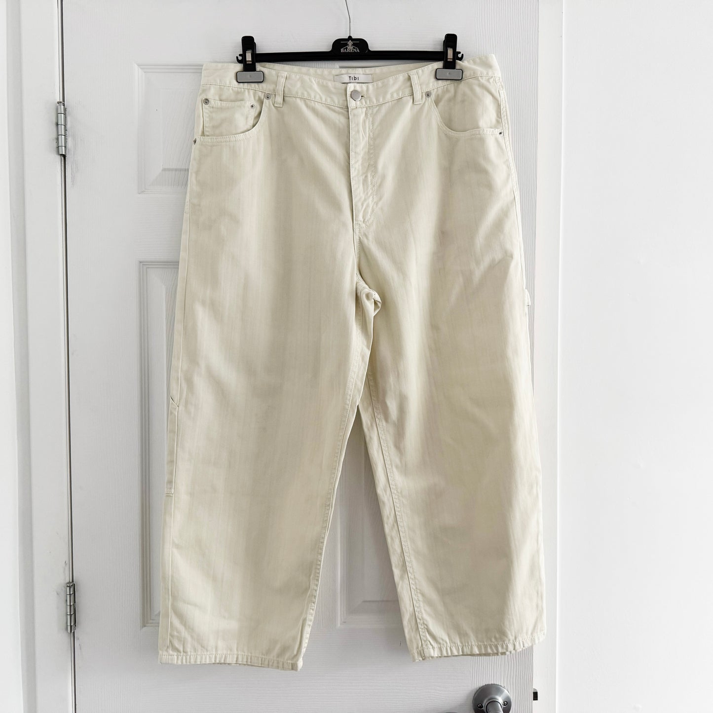 Tibi Garment Dyed Twill Cropped Slouchy Carpenter Jean in Cream, size 32. Fits loose to size by design. It's actually lighter weight than you'd expect from a denim - and it makes them absolutely perfect for warmer temps! Featuring asymmetrical oversized pockets and a small painter pocket - utilitarian vibes but in a really design-forward way. Keep them feeling laid back, pop em on with sandals and you're done! Zip fly. 13 inch fly. 38 inches waistband. 24 inch inseam. 37.5 inches total length, measured in the side seam. 100% cotton. In excellent condition. Originally $485CAD, and selling here for $175CAD!