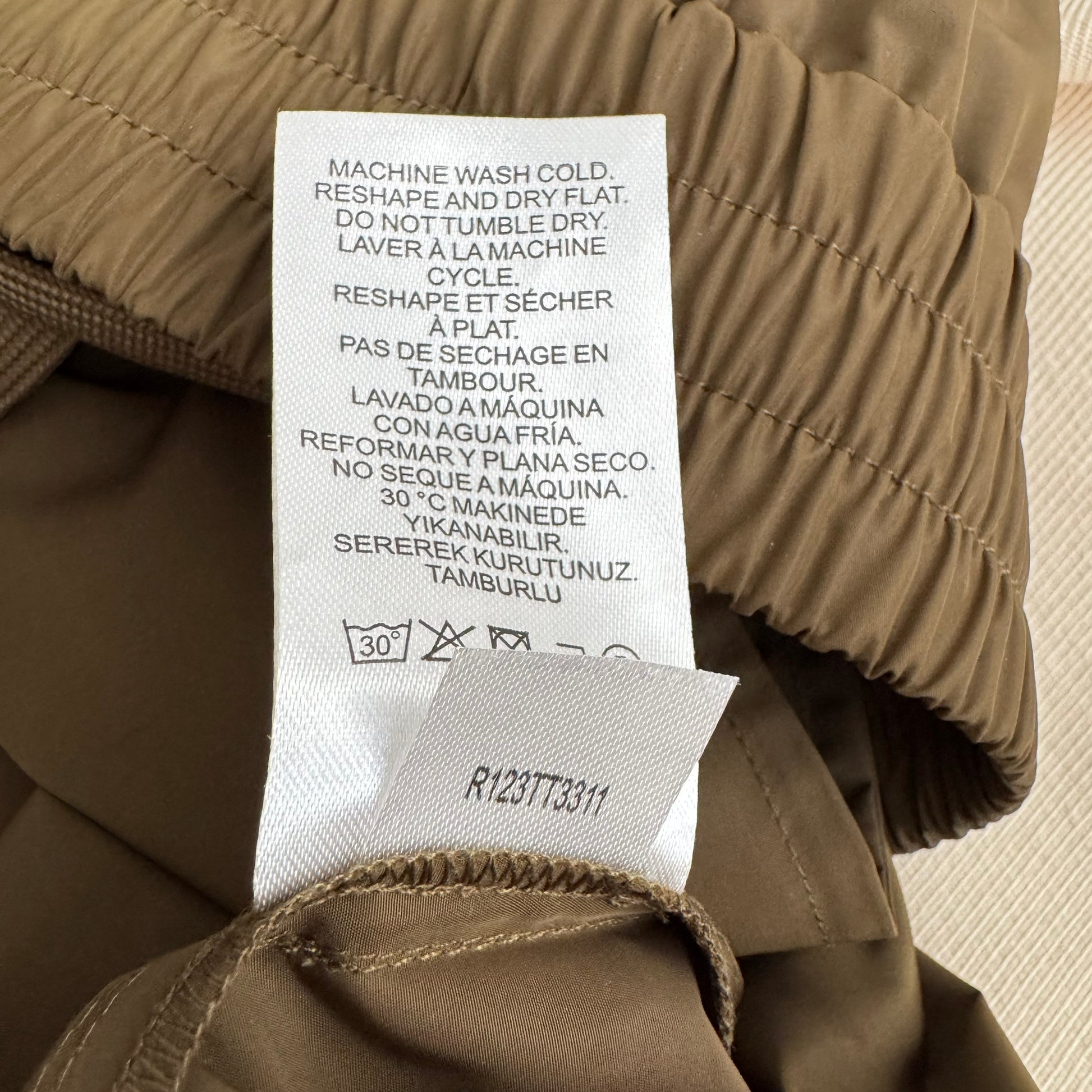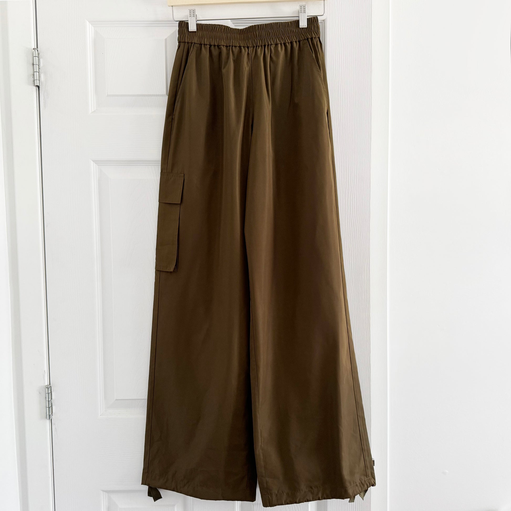 Tibi Italian Sporty Nylon Wide Leg Pull On Pants in "Wood", size XXS. Fits true to size for a slouchy fit. A cool pant that bridges the gap between sporty and dressed up (basically sums up modern life to a tee)! Not too LITERALLY sporty - but with those relaxed vibes - they could totally be worn casually for the grocery store/errands etc (but just less "schleppy" - y'know what I mean), but could also be thrown on with a heel and a cute jacket heading out for dinner. There is a drawstring at the hem, so you can cinch the pant in at the bottom - if the weather is bad, or you don't need the length or whatever. The waistband measures 13 inches flat, and stretches to 17 inches to get on and off. 11 inch rise. 32 inches inseam. 100% polyester. In excellent condition. Originally over $600CAD, and selling here for $215CAD!