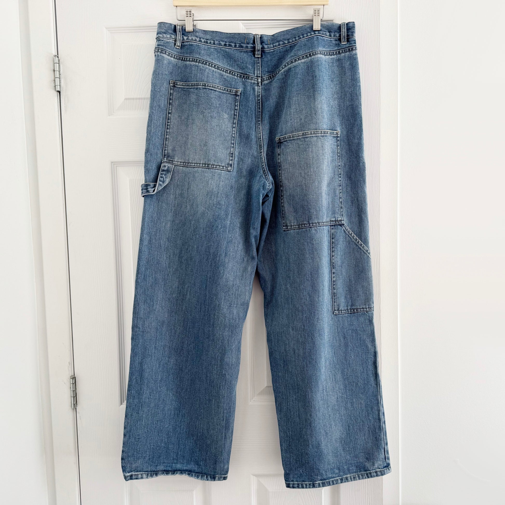 Tibi "Sam" Carpenter Jean in Classic Wash, size 32 (fits 32/33). Literally the most perfect casual jean ever - loose and rugged - but super luxe! Great for dressing up or down - with everything from kitten heels to chunky sneakers. I love how the pockets on the bum sit at different heights - design forward but casual - and sets them apart from other jeans in this category. 38 inches actual waistband, which is designed to sit a little low and slouchy. 13 inch rise. 29 inch inseam. 100% cotton. Lightly worn and in very good condition - but has a light scent of perfume, which I just mention in case you are sensitive to that! Originally around $550CAD, and selling here for $225CAD!