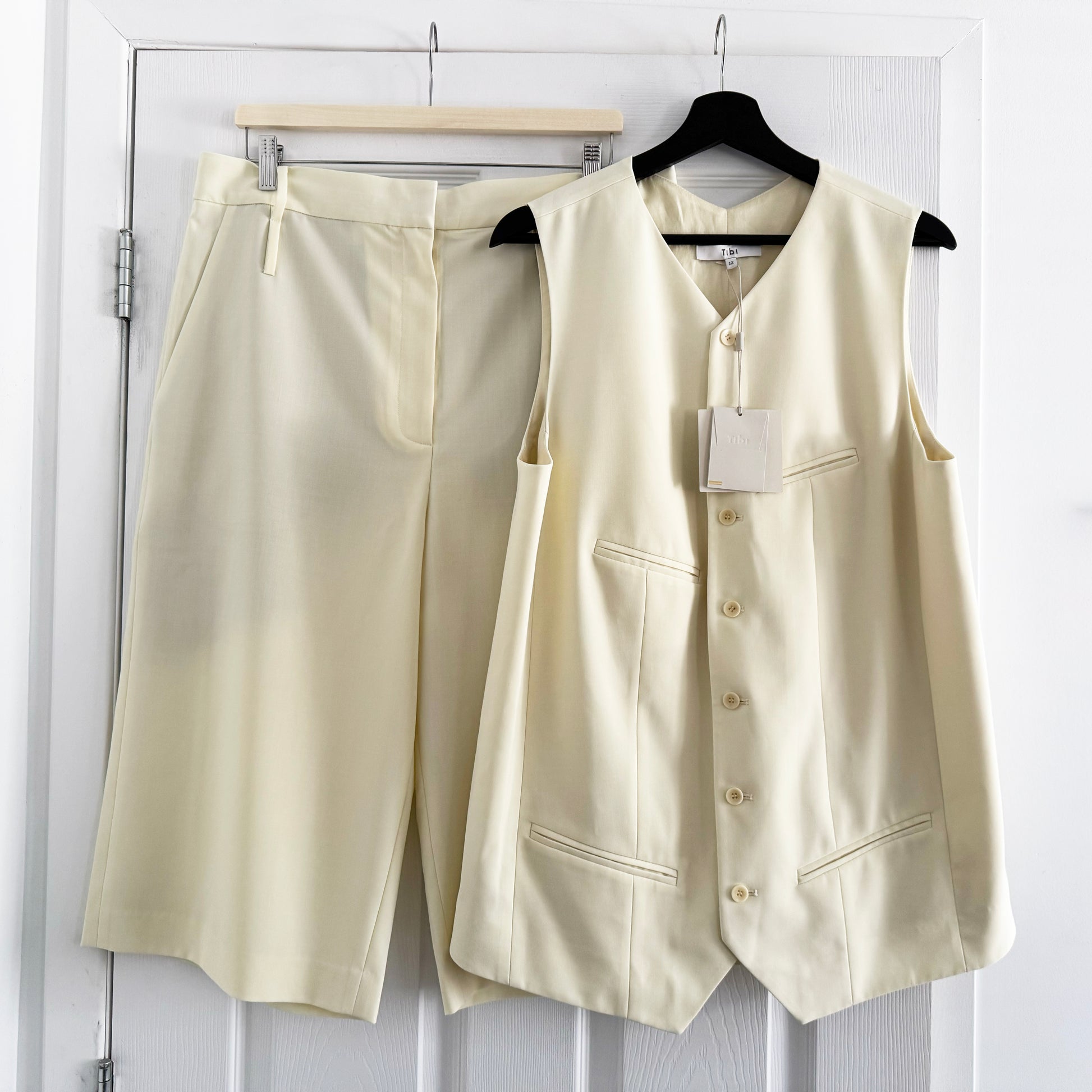 Tibi Tropical Wool Easy Vest in Ivory (Pale Yellow), size 12. Fits true to size for a close fit. Brand new with tags! A menswear influence is always present in a tailored vest, but this soft colourway gives it a totally different feel! Features an adjustable back belt for style and function. Pair it with the matching short for a coordinated suiting look, or just style it with denim for a more casual feel. 20 inches armpit to armpit. 28 inches in length. 53% Polyester, 43% Wool, 4% Elastane. Originally $545USD (about $750CAD), and selling here for $245CAD!